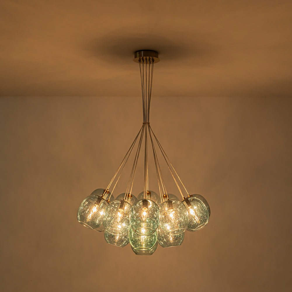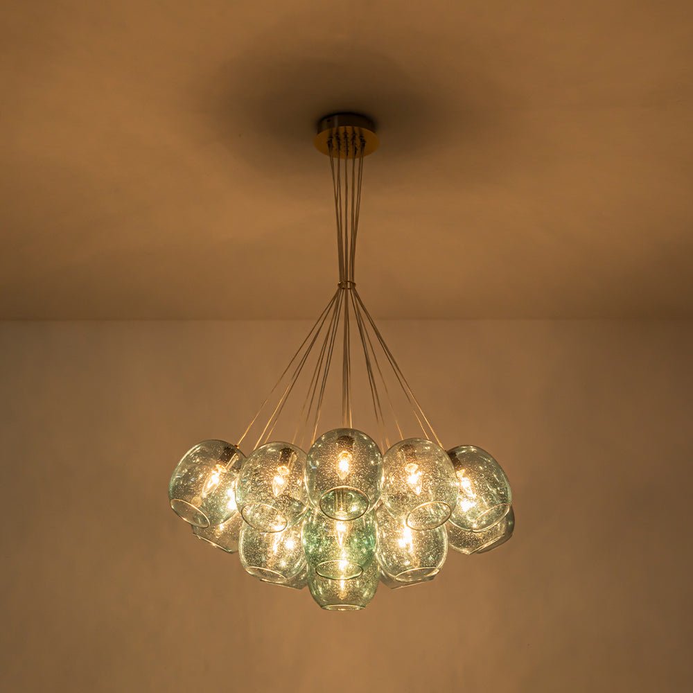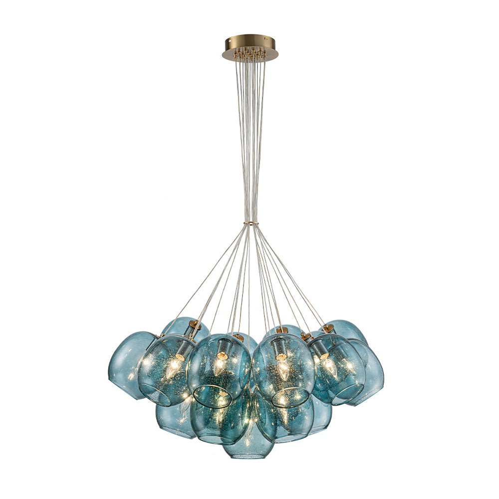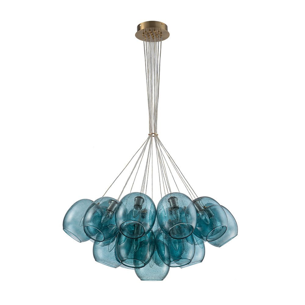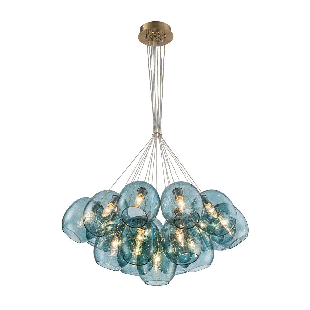 Bring a touch of serene romance into your home with this 19-light cluster bubble chandelier. Nineteen glass globes, each with an open bottom, gather in a cascading arrangement to form a glamorous cluster design that feels both modern and timeless. The standout feature lies in its striking blue glass, kissed with a subtle green undertone that evokes the tranquil ambiance of a lake house retreat. Each globe is enriched with seeded textures, reminiscent of raindrops trailing down a window on a quiet rainy day, infusing the piece with poetic charm.