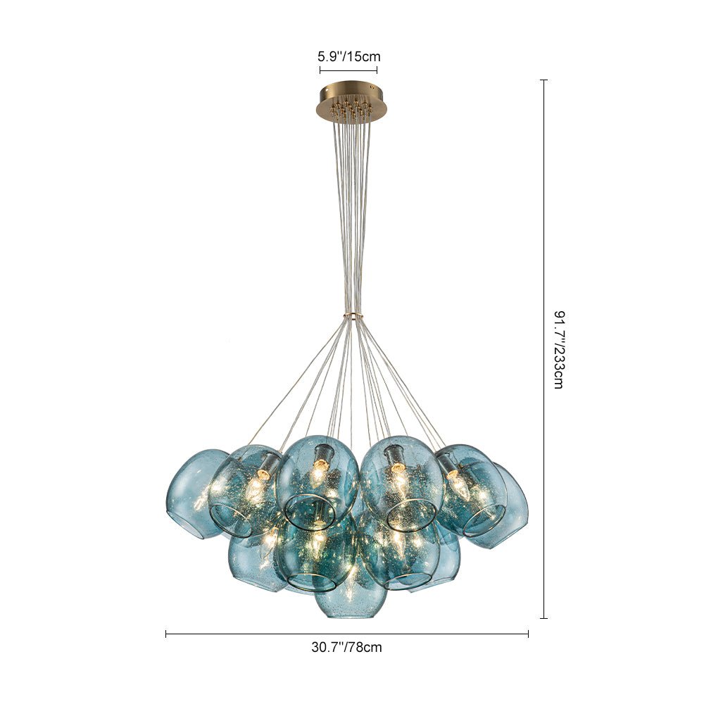 When illuminated, the cluster glass globe chandelier transforms as the 19 E12 bulbs (not included) radiate a bright, inviting glow. The light filters through the seeded blue glass, creating a mesmerizing interplay of shimmer and depth that elevates both mood and atmosphere. Perfect for living rooms, dining spaces, bedrooms, or entryways, this blue seeded bubble chandelier is more than a source of light—it’s a dreamy centerpiece that captures attention while softly enhancing its surroundings with luminous artistry.