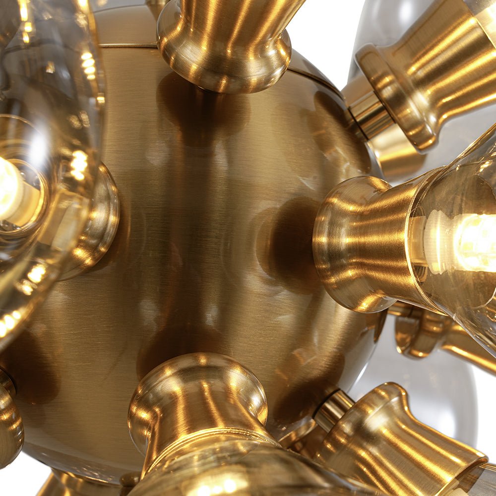 Our round cluster chandelier adds a touch of whimsy and fantasy to your interior design, making it a stunning focal point. Featuring a brass Sputnik-like center, it appears as if it's a bubble machine blowing out 18 clear gray bubbles from the light sockets. Accommodating eighteen G9 bulbs (not included), this gray glass globe chandelier casts a fabulous ambient light when illuminated. Elevate your living room, dining room, bathroom, bedroom, foyer, entryway, or lobby to a new level of sophistication and luxury with this elegant and exclusive 18-light glass bubble chandelier.