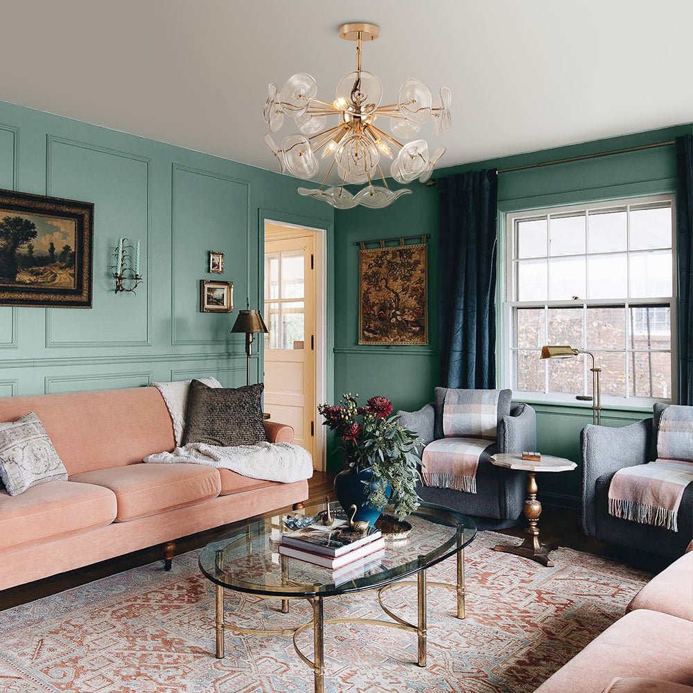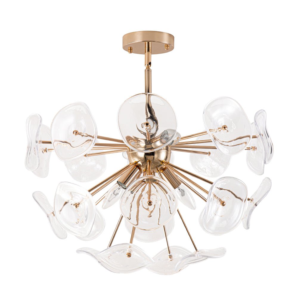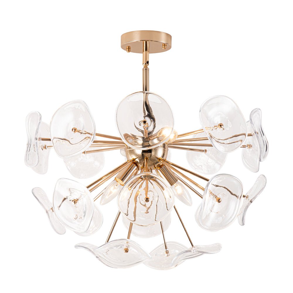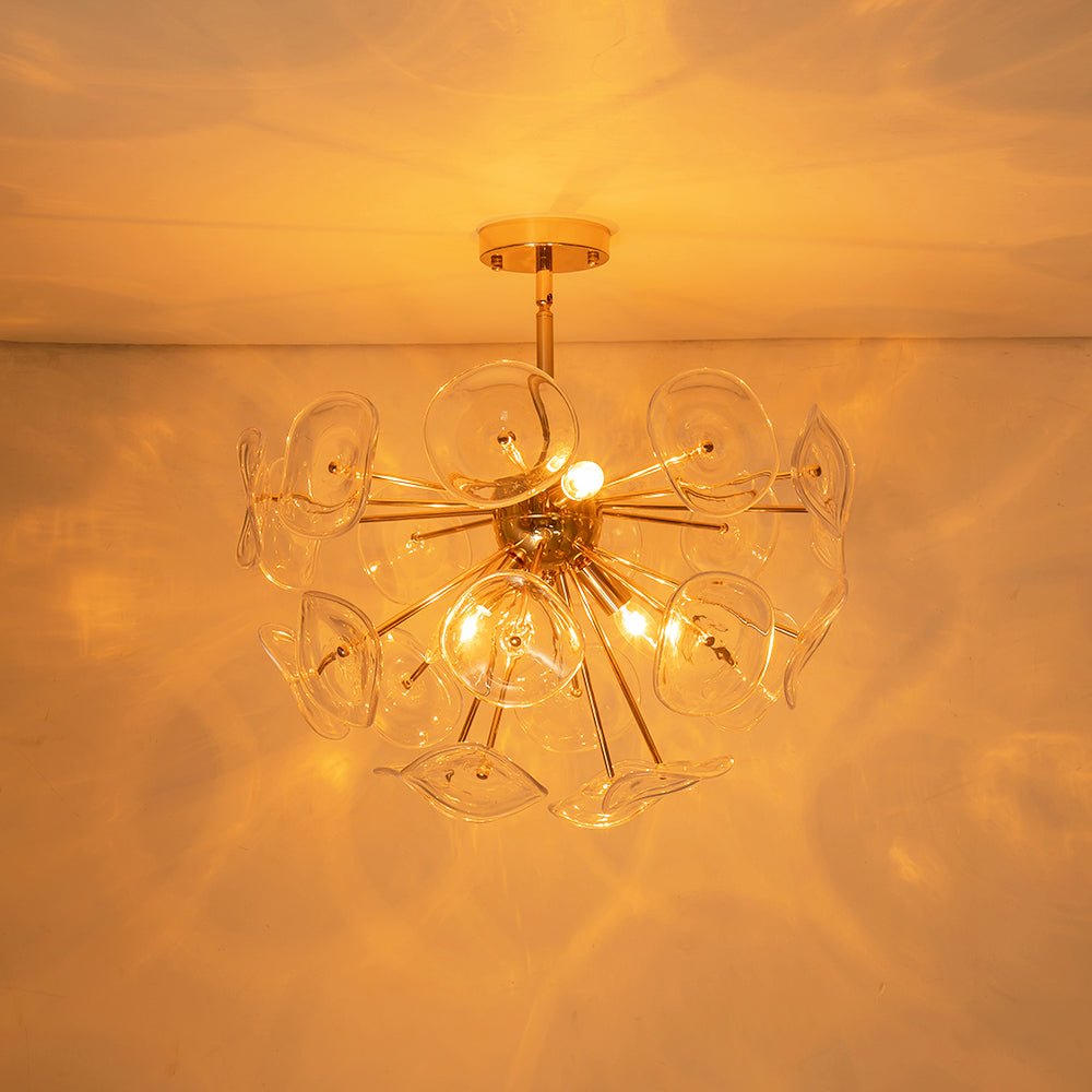 Bring the everlasting charm of French spring romance to your home all year round with our bloom semi flush chandelier. Combining the boldness of a sunburst design with delicate floral accents, this Sputnik light fixture boasts an array of elegant clear glass blossoms inspired by lovely morning glory. Accentuated by a plated brass finish framework, this 4-light semi flush mount showcases four E12 candelabra bulbs (not included) nestled among the glass decorations, offering stylish illumination. Perfectly suited for a dining room, kitchen island, entryway, living room, bedroom, bathroom, or lounge, this glam sunburst ceiling light effortlessly enhances any space with its timeless allure.