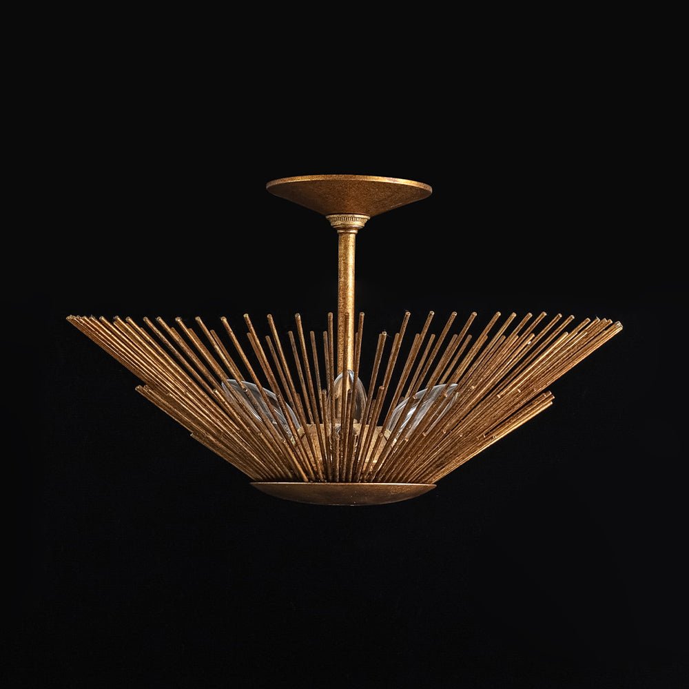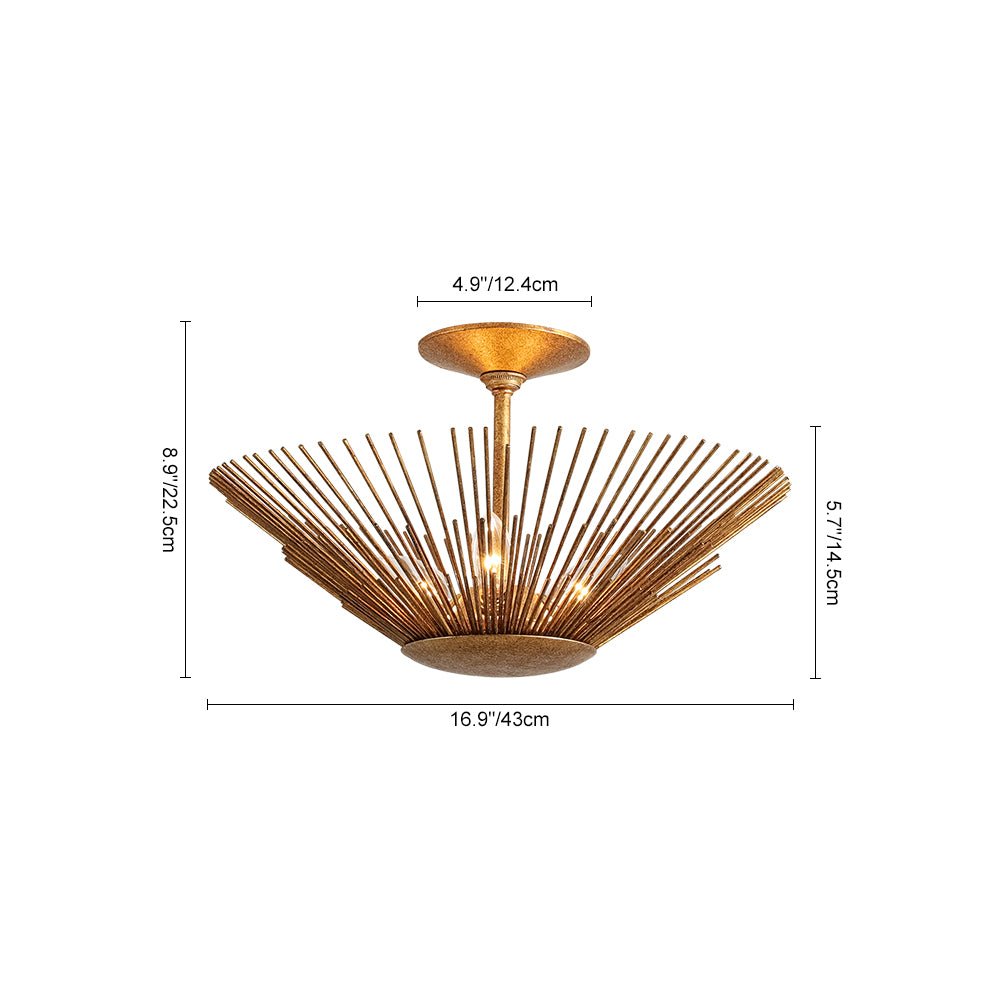 When illuminated, this 3-light sunburst semi flush mount transforms light into a golden halo, bathing the room in warm brilliance. The layered spokes project intricate, shrub twig-like shadows across the surroundings, adding a captivating interplay of light and pattern.