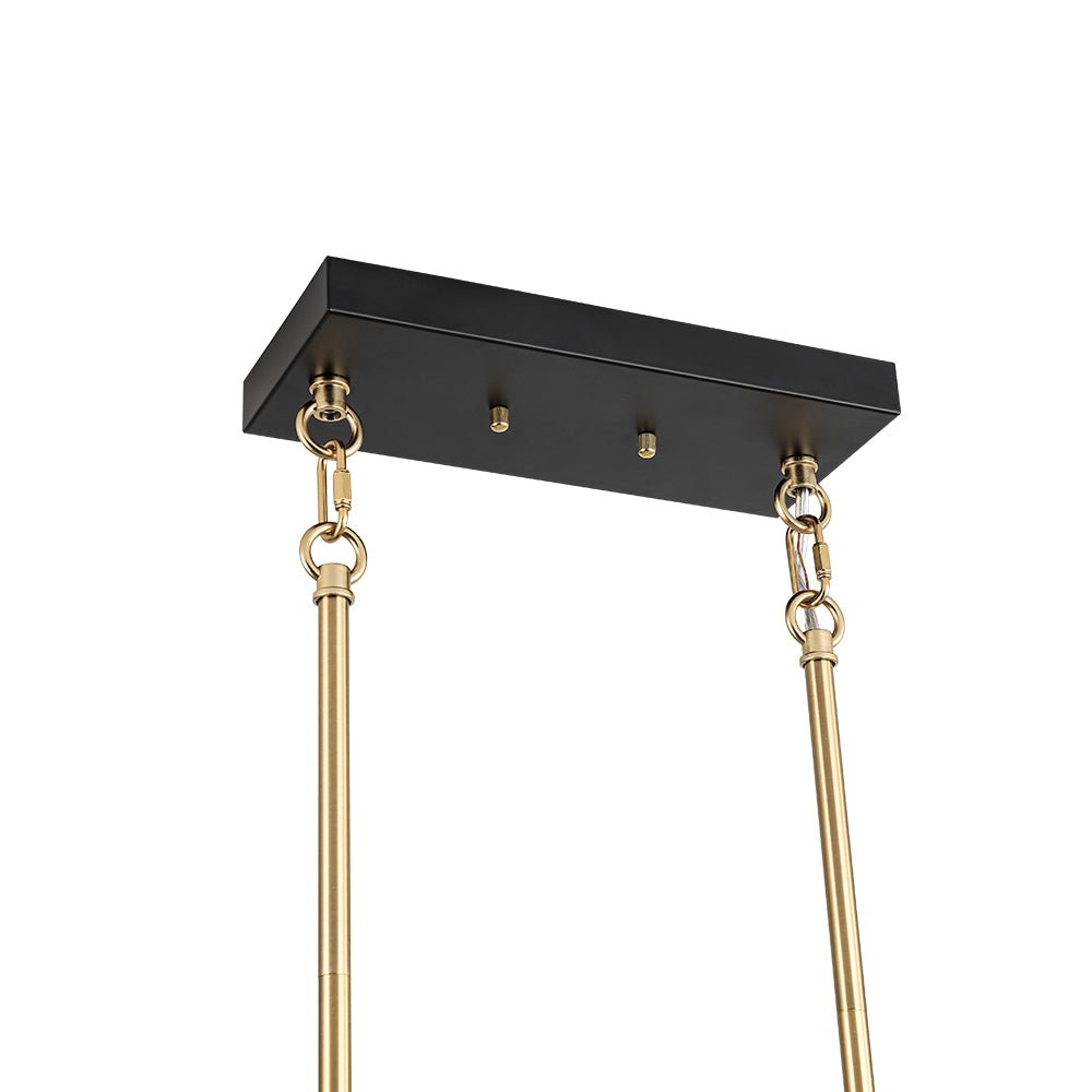 This 5-light linear chandelier showcases a sleek contemporary design with clean, straightforward lines, making it a striking centerpiece for a kitchen island, dining table, counter, or living space. Featuring a matte black finish, a slender horizontal tube supports five evenly spaced, bell-shaped shades below. Crafted from clear reeded glass, the shades display an elegant wavy edge reminiscent of a gracefully swaying crystal skirt. Accented with aged brass sockets and hanging poles, this modern farmhouse kitchen island pendant exudes a touch of mid-century sophistication, enhancing its refined, luxurious appeal.
