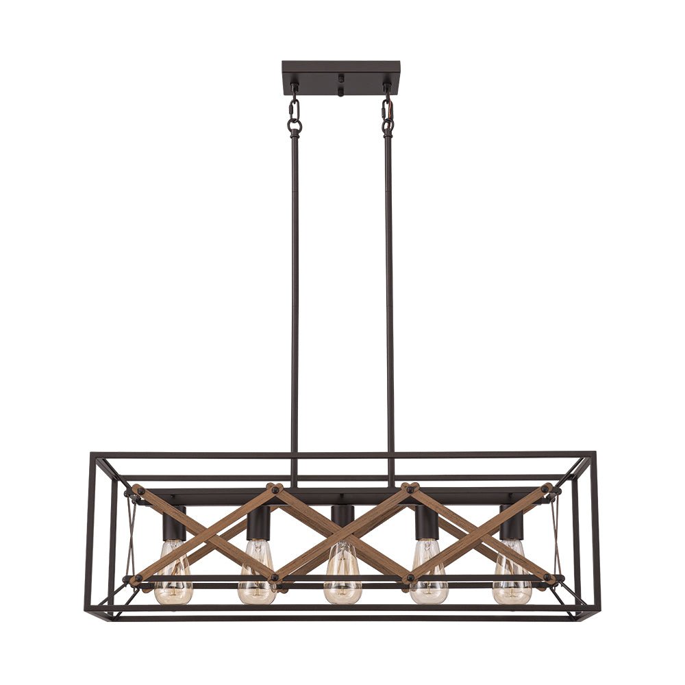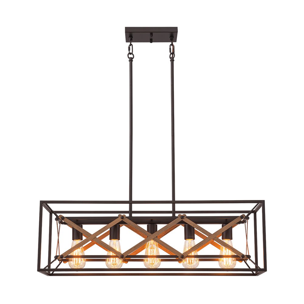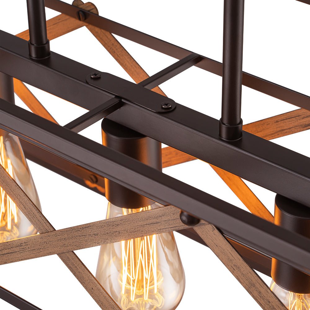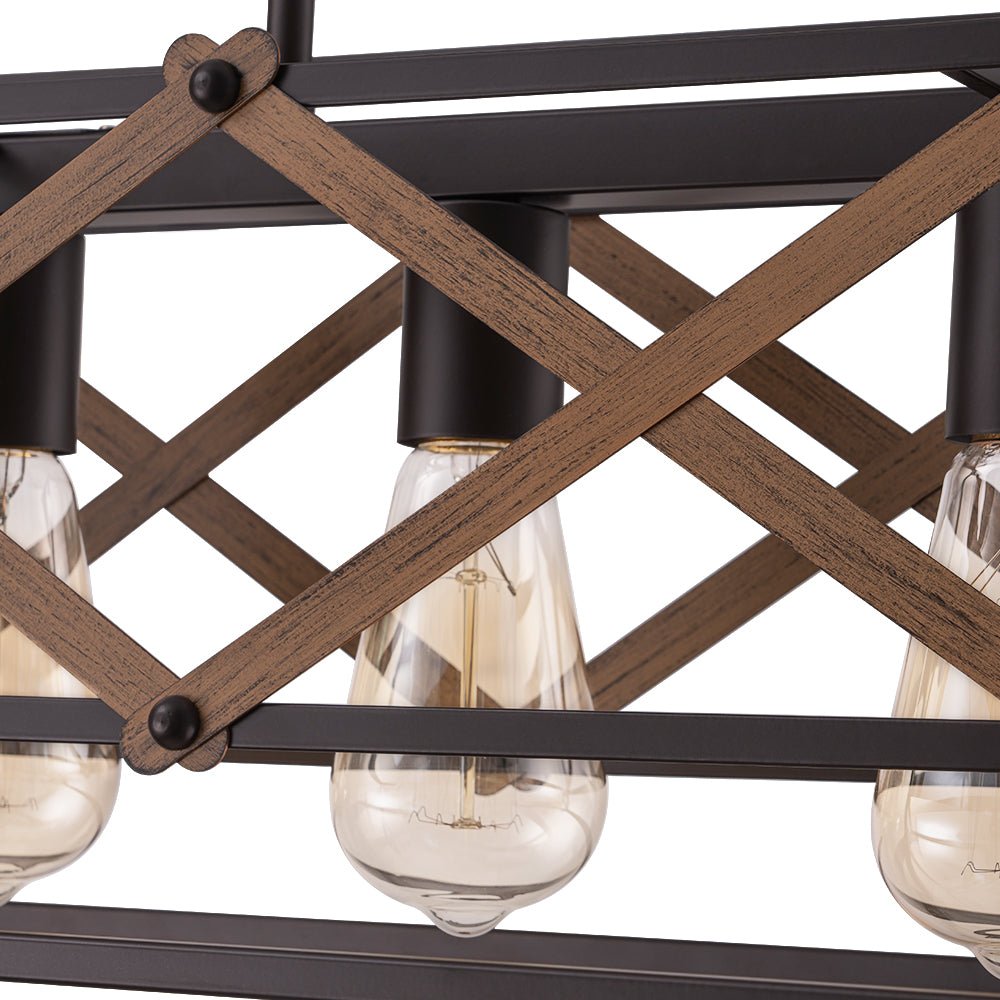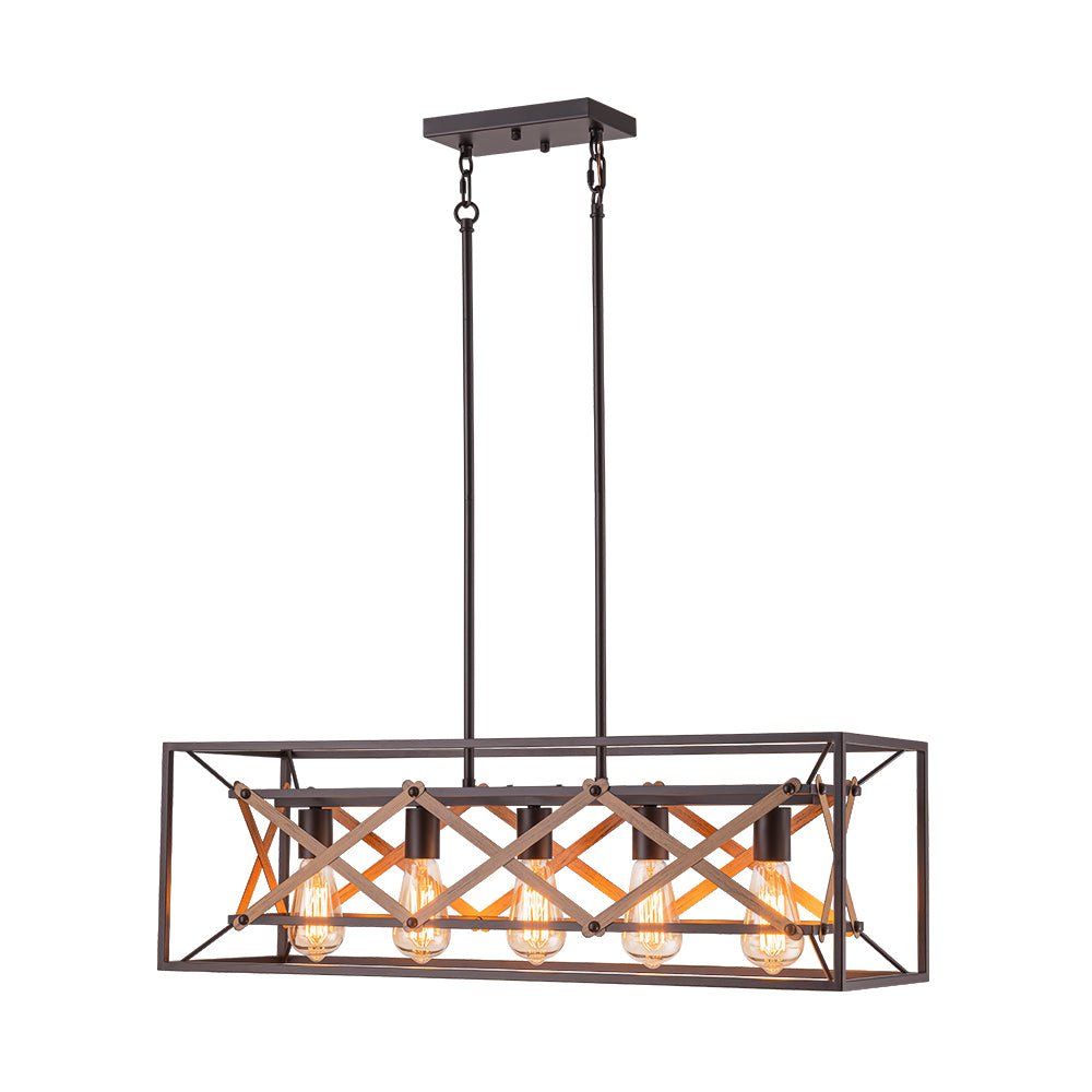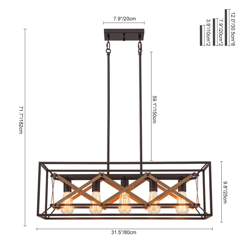 Crafted with precision from durable iron, this 5-light kitchen island pendant showcases a wide rectangular open cage design, highlighted by distressed faux wood crossing bars on the sides. Inside, five exposed E26-base bulbs (not included) provide bright task lighting, offering both style and functionality. Ideal for industrial, minimalist, lodge, rustic, and modern farmhouse interiors, this rectangular cage linear chandelier is perfect for illuminating kitchen islands, dining rooms, living rooms, home bars, or even restaurants.