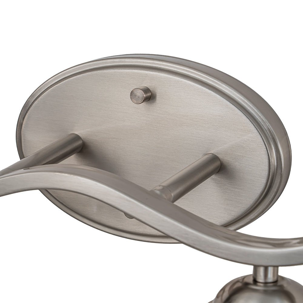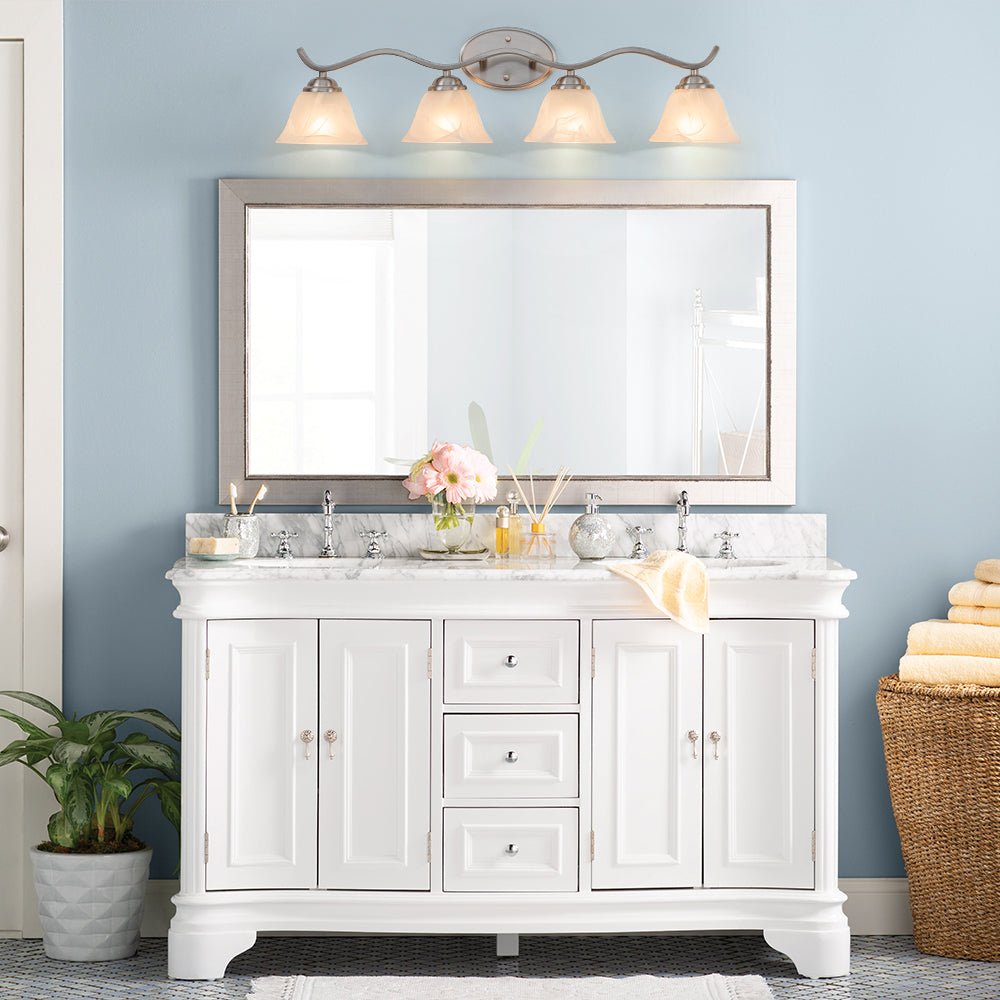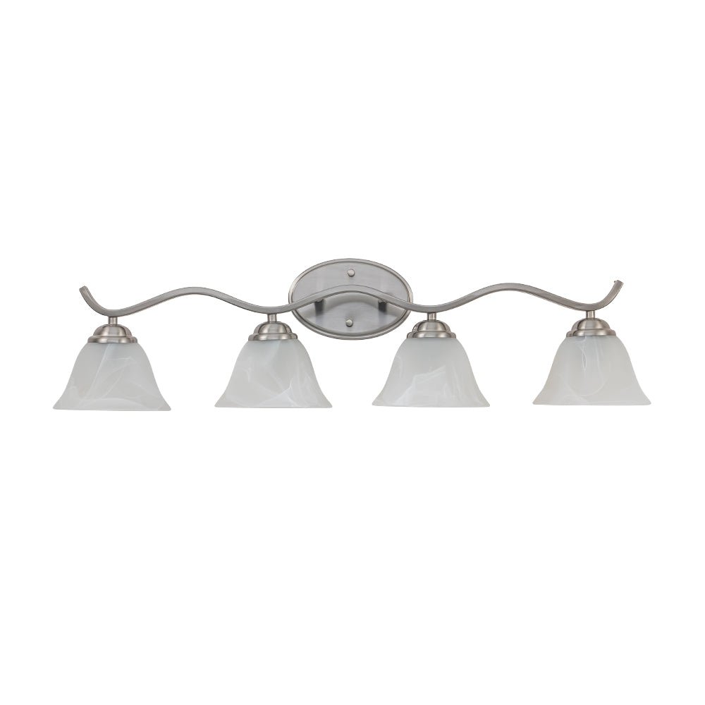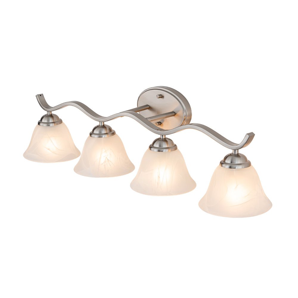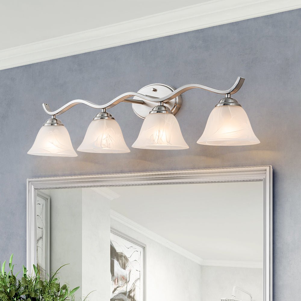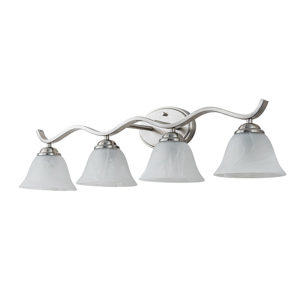 Exuding classic style with refined details, this vanity wall sconce will illuminate your bathroom, sink, or mirror with a touch of vintage elegance. Finished in brushed nickel, this 4-light vanity lamp features a wavy linear arm supported by an oval backplate, offering a sleek and dynamic allure. Four bell-shaped lampshades, crafted from white cloud glass, mimic the graceful appearance of marble. Compatible with four E26 medium base bulbs (not included), this cloud glass shade vanity wall light provides inviting and cozy lighting, perfect for enhancing the ambiance of your space.