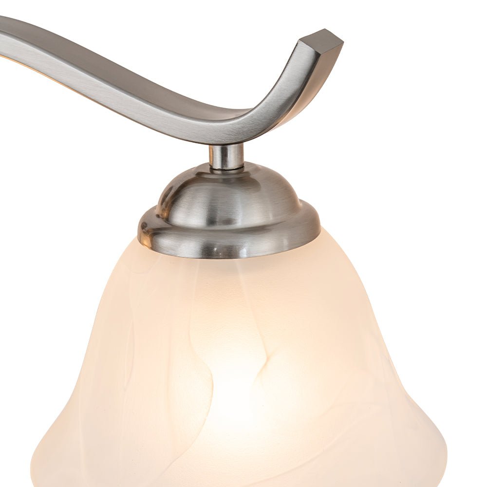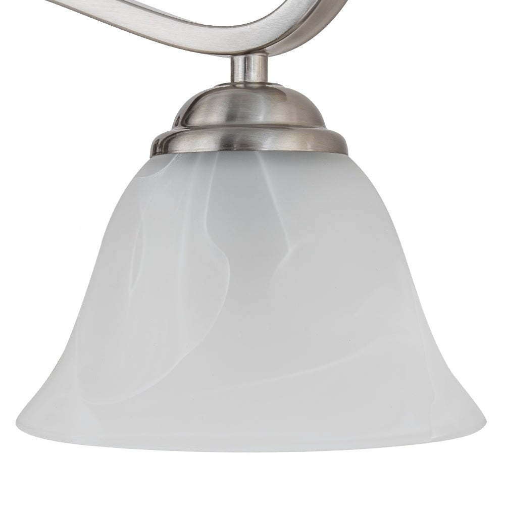 Four Lights • Cloudy Glass Shade • Bell Shape • Wavy Arm • Nickel Finish • E26-base Bulbs (Not Included) • Hardwired • ETL