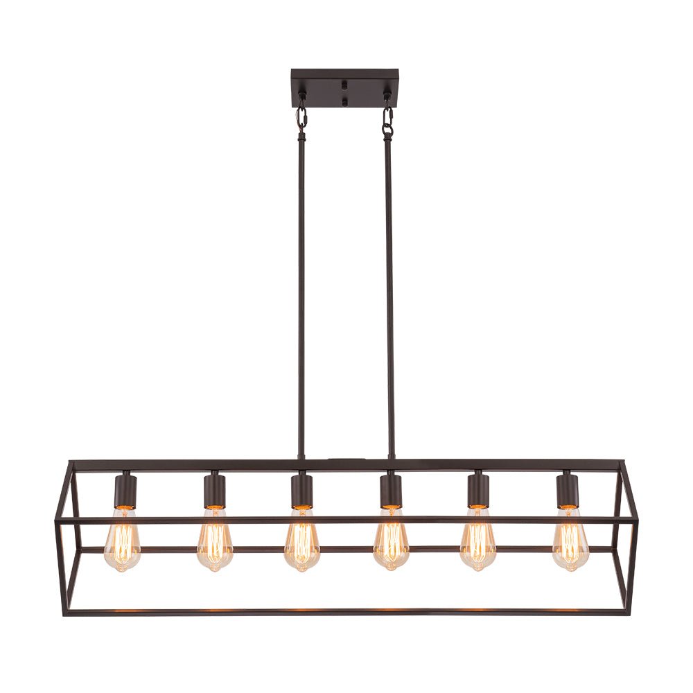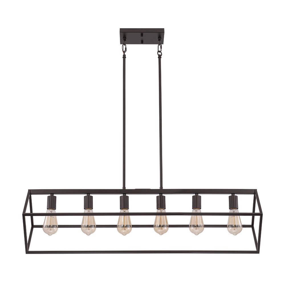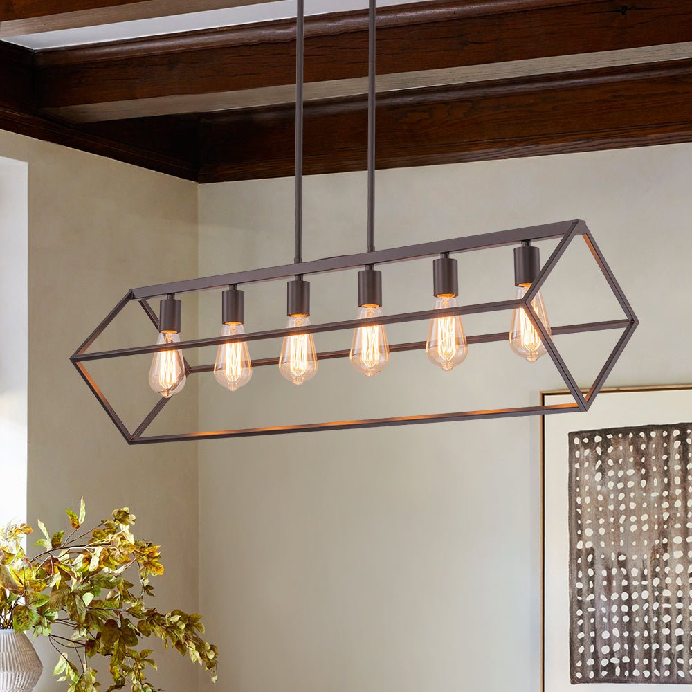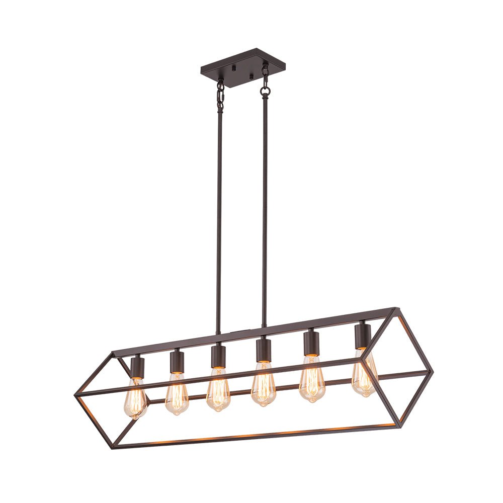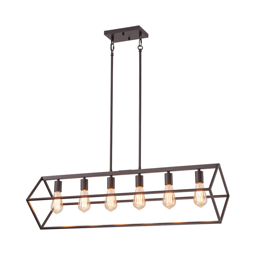 This 6-light linear chandelier seamlessly blends industrial flair with contemporary minimalism. Its wide, open rectangular cage is suspended at a slanted angle by two hanging poles, showcasing a dynamic geometric design and airy aesthetic. The oil-rubbed bronze finish adds a chic, rustic touch, while the six exposed E26 medium-base bulbs (not included) provide bright, focused task lighting. Perfectly suited for lodge, rustic, and modern farmhouse interiors, this simple but elegant geometric cage island chandelier is ideal for spaces like kitchen islands, dining rooms, living rooms, home bars, or counters.