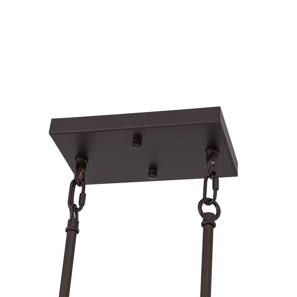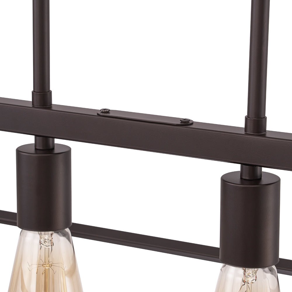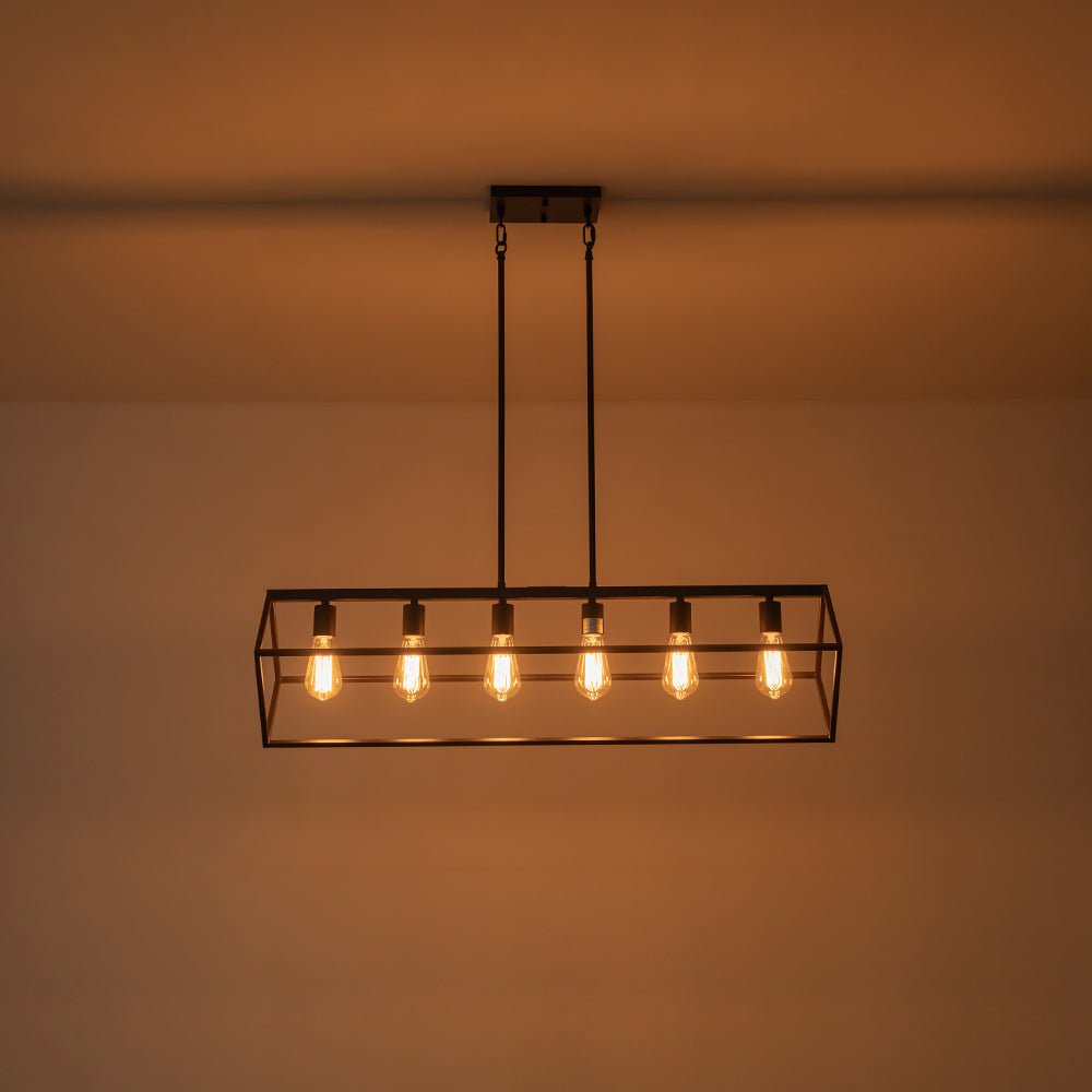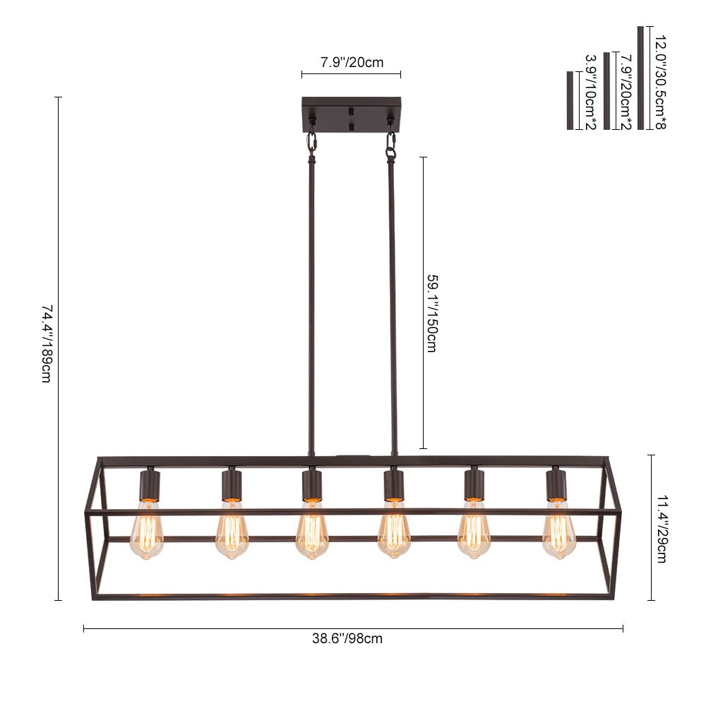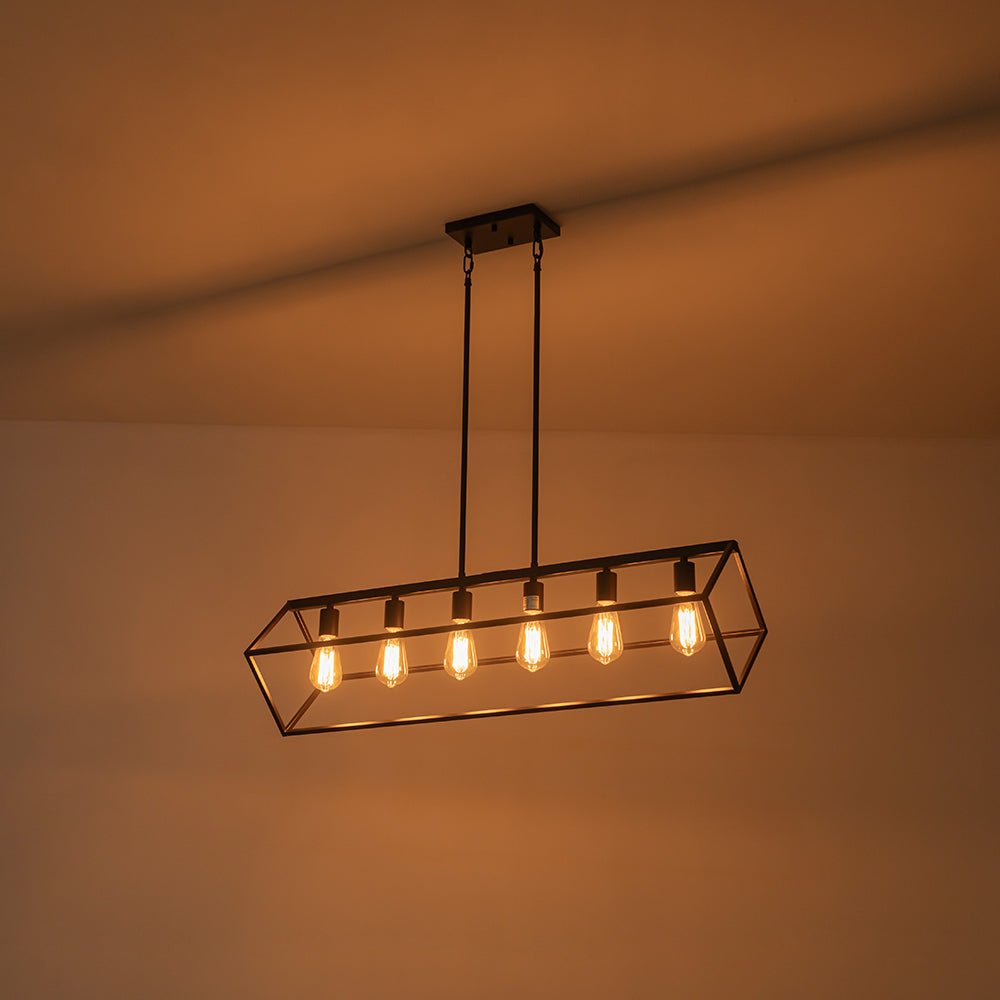 This 6-light linear chandelier seamlessly blends industrial flair with contemporary minimalism. Its wide, open rectangular cage is suspended at a slanted angle by two hanging poles, showcasing a dynamic geometric design and airy aesthetic. The oil-rubbed bronze finish adds a chic, rustic touch, while the six exposed E26 medium-base bulbs (not included) provide bright, focused task lighting. Perfectly suited for lodge, rustic, and modern farmhouse interiors, this simple but elegant geometric cage island chandelier is ideal for spaces like kitchen islands, dining rooms, living rooms, home bars, or counters.