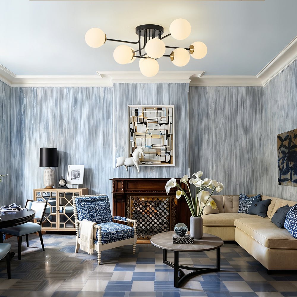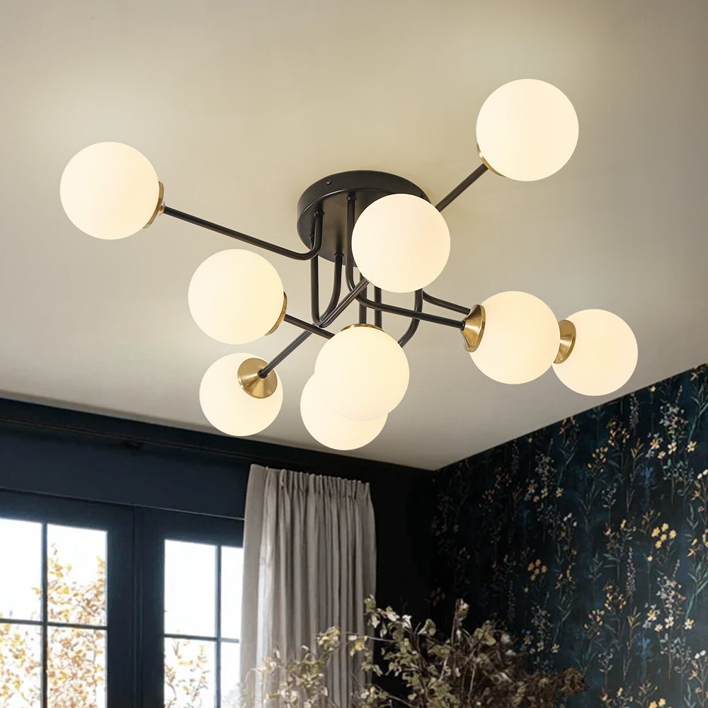Radiating modern mid-century charm and celestial inspiration, this 7-light semi-flush chandelier transforms everyday illumination into a work of art. Sculpted from sturdy iron, its slender, gracefully angled arms extend outward in layered symmetry, each crowned with a milky white glass globe. Like a constellation captured in motion, the globes evoke the beauty of drifting bubbles and distant stars, filling the room with soft, diffused light. The compact, low-profile design makes this sputnik light fixture perfect for rooms with standard or lower ceilings, delivering the drama of a chandelier without overwhelming the space. Whether accenting a dining area and bathroom, brightening a hallway, entry, and living room, or creating a serene glow in a bedroom, this bubble ceiling light brings refined balance, warmth, and timeless sophistication to any interior.