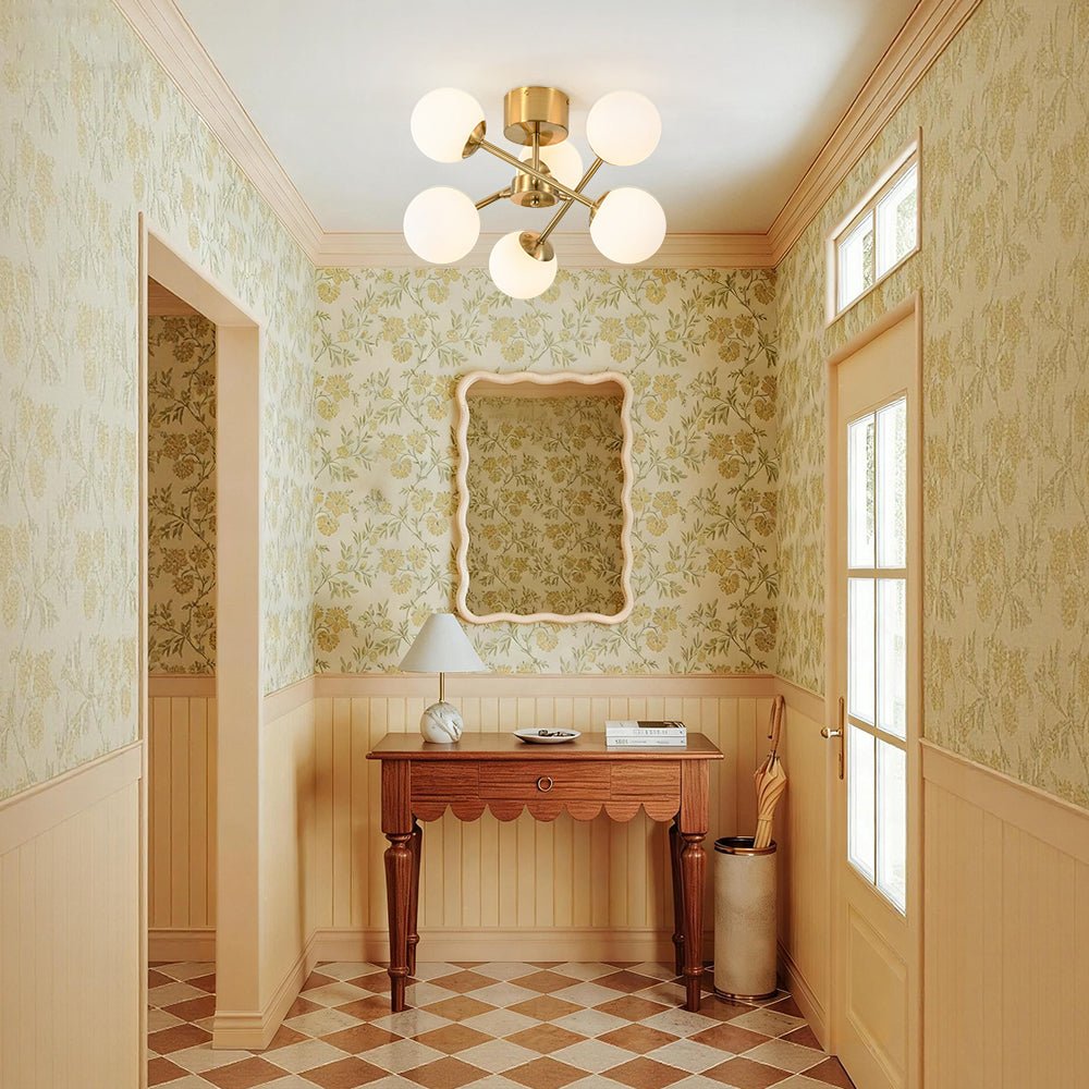 Bring modern sophistication and functional elegance into your home with this 6-light semi-flush mount ceiling light. Designed with a sleek brushed brass finish, the sputnik light fixture features three adjustable linear arms, each tipped with luminous opal glass globes at both ends. The rotatable arms allow you to customize the configuration. The six frosted glass shades softly diffuse the light, reducing glare and casting a warm, inviting glow—perfect for creating cozy ambiance with a refined edge. The pairing of brushed brass and milky white globes evokes a timeless mid-century bubble charm, enhanced with a fresh contemporary twist. Ideal for a variety of spaces, this versatile bubble semi-flush mount works beautifully in living rooms, dining rooms, kitchens, bedrooms, foyers, hallways, or even stylish offices.