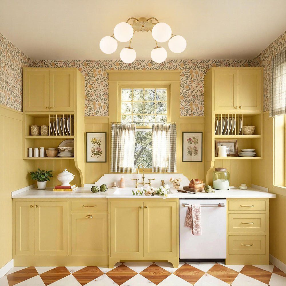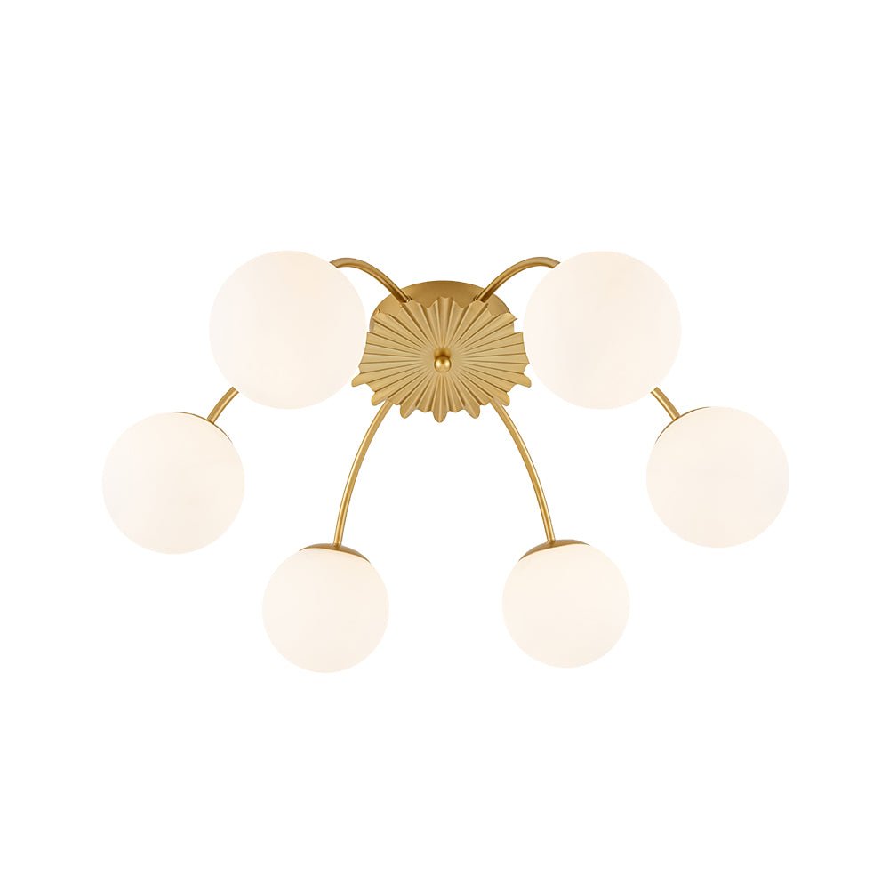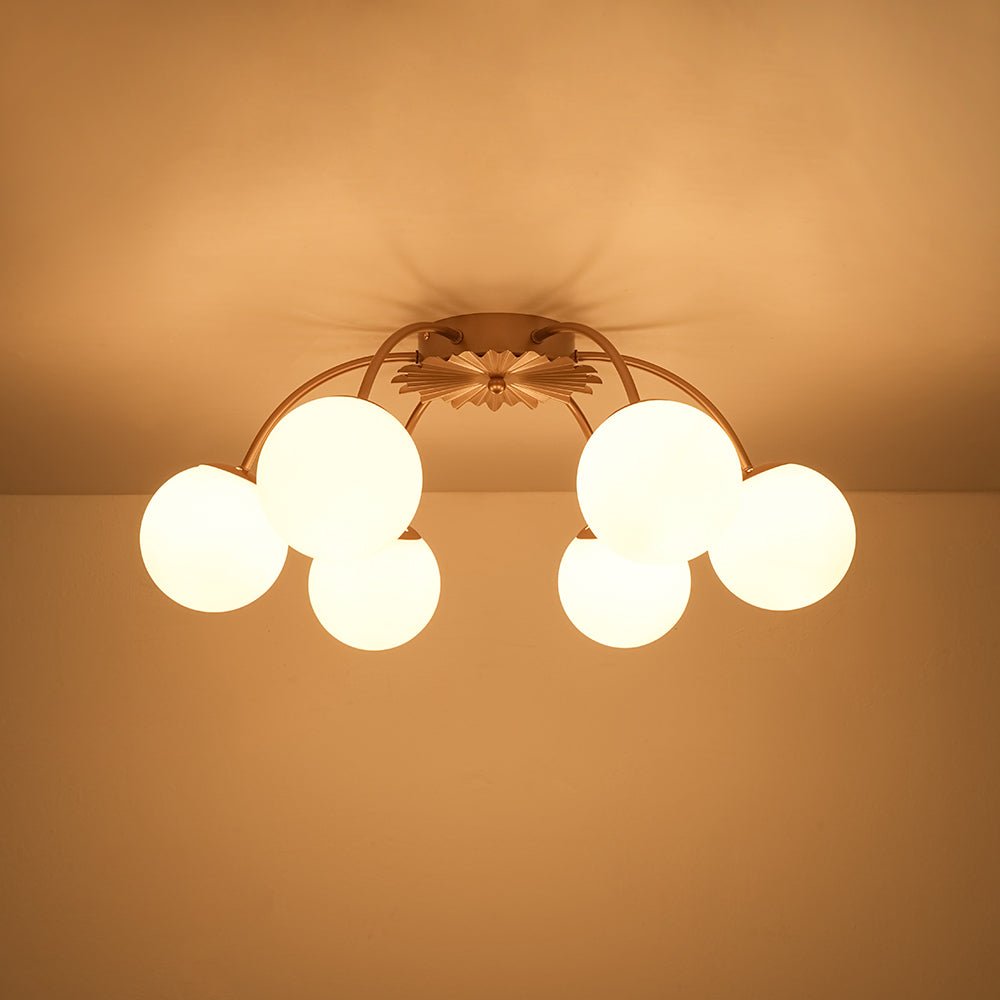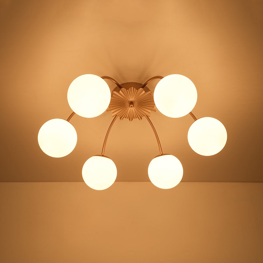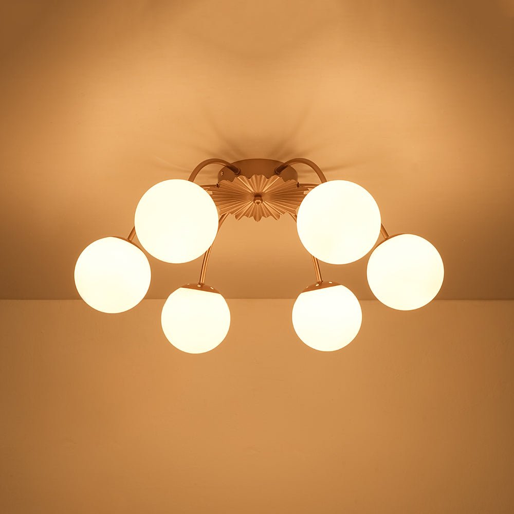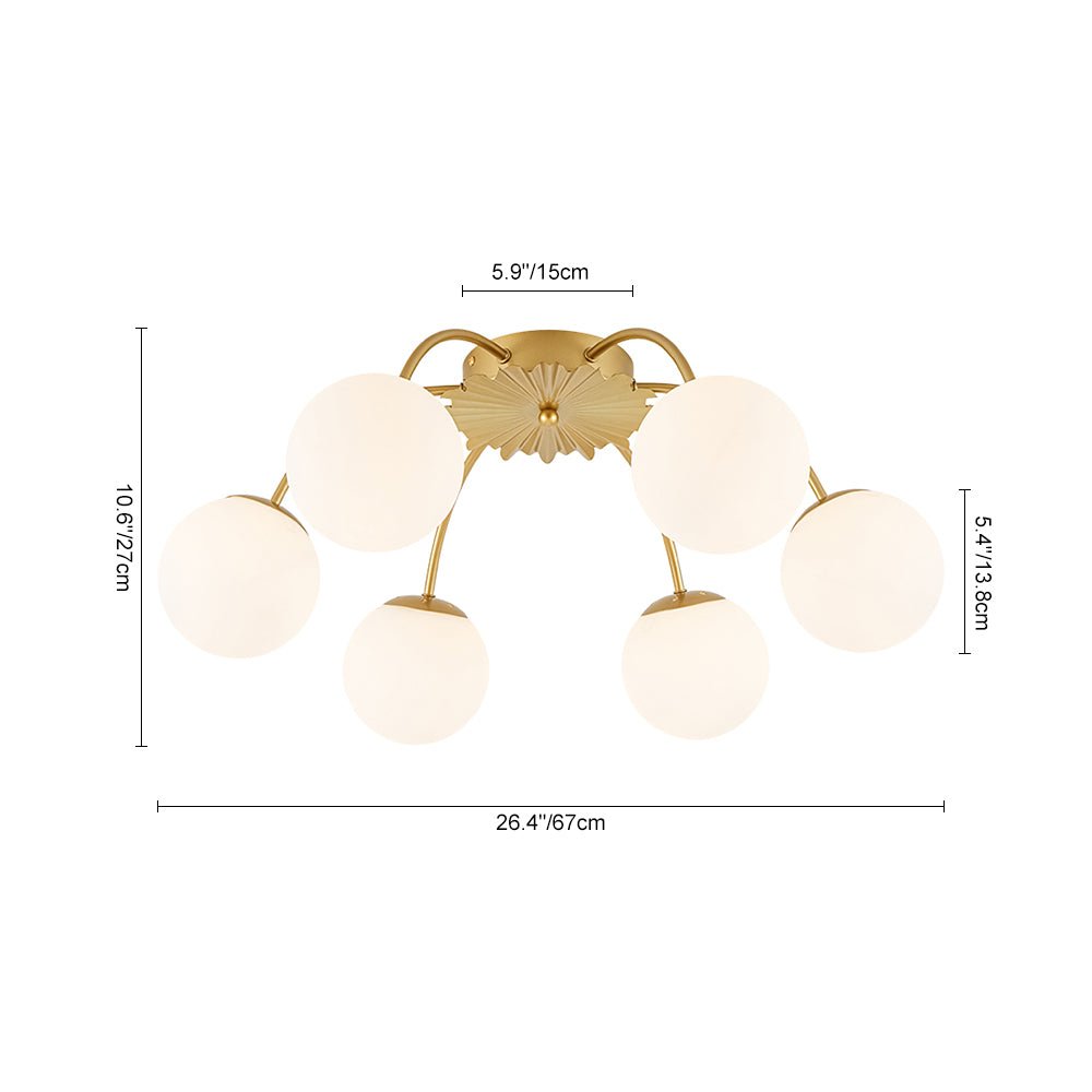 An opulent fusion of classic Sputnik and elegant bubble design, this 16-light semi-flush chandelier features gracefully curved arms cascading from the back of a medal-like base to support alluring milky white glass globes, like a beautiful blossom firework. Warm cozy lighting sweeps down to your space when we turn on this glass globe sputnik chandelier, flowing through frosted glass bubbles and the luxe brass frame with elegance. Perfect to add artful charm and sophisticated beauty to your home decor, this 16-light opal glass bubble funky chandelier is the best enhancement to a living room, dining room, entryway, bedroom, or lobby.