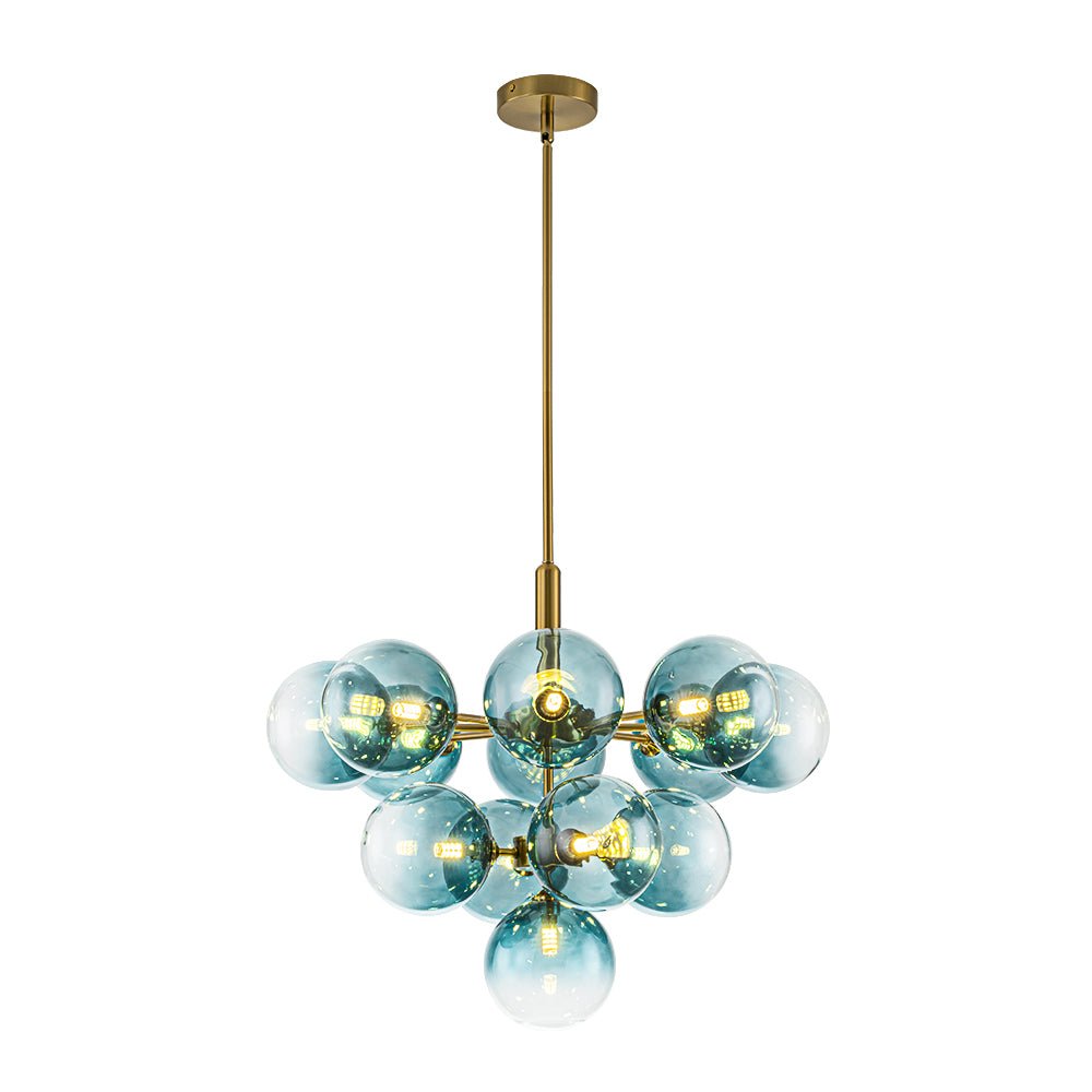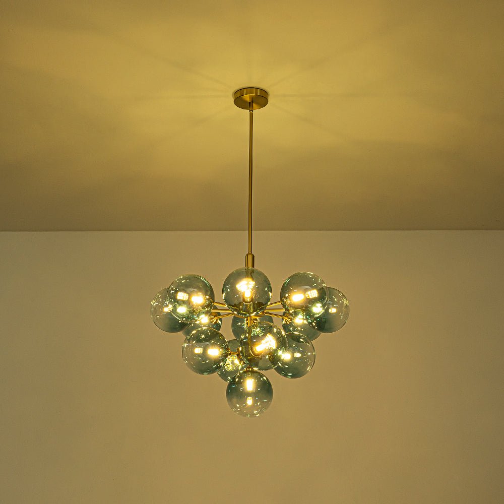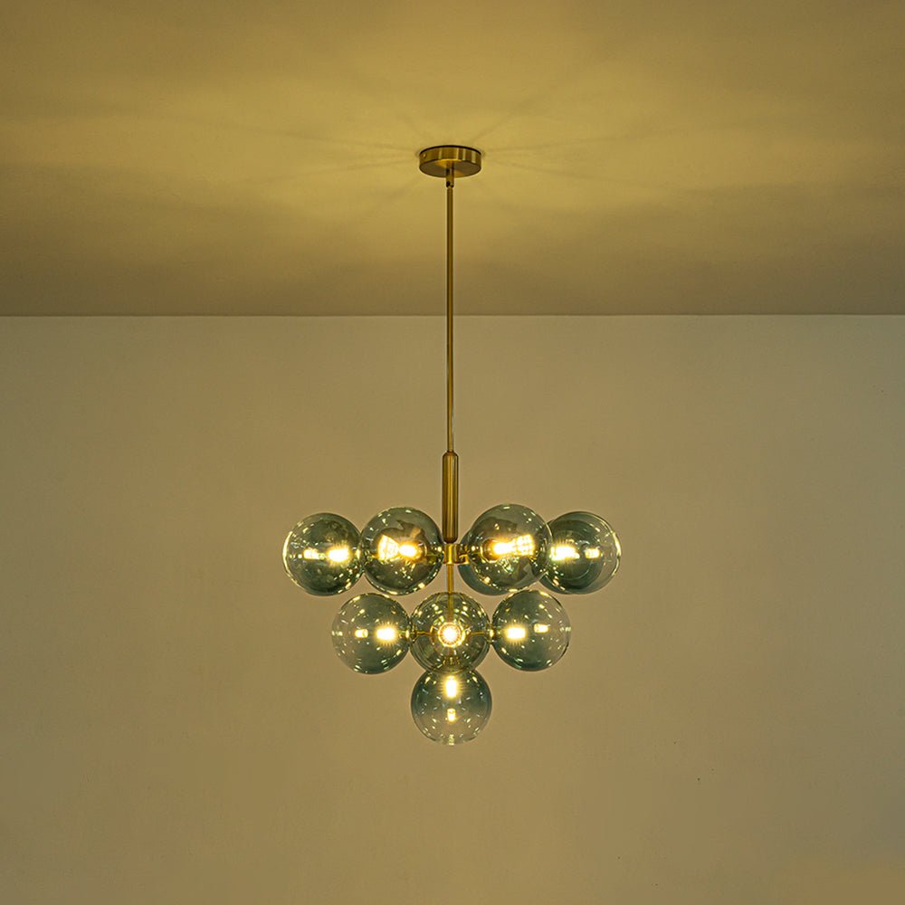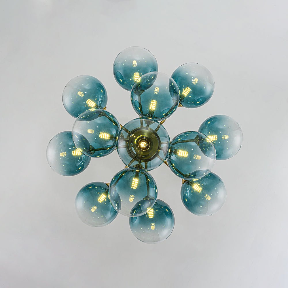 This stunning tiered glass globe chandelier turns any space into an artistic focal point, bringing luminous beauty and sculptural presence to your home. Arranged in a cascading, sputnik-inspired silhouette, its cluster of hand-blown blue globes gradually decreases in size, evoking the delicate fall of blue wisteria suspended softly in the air. Each globe shifts from a gentle blue tint to crystal-clear glass, forming a tranquil gradient reminiscent of twilight settling over still water—light, airy, and quietly poetic.