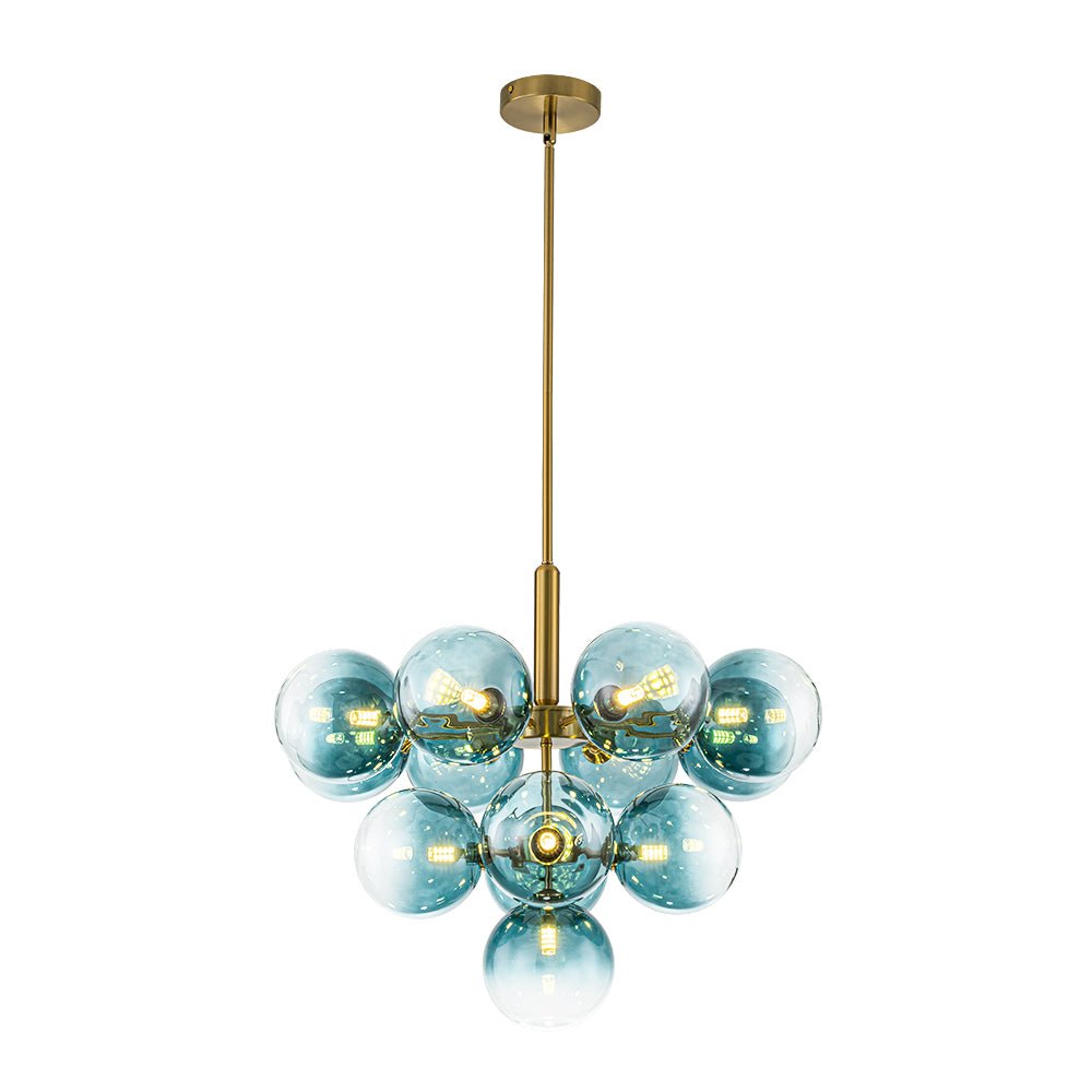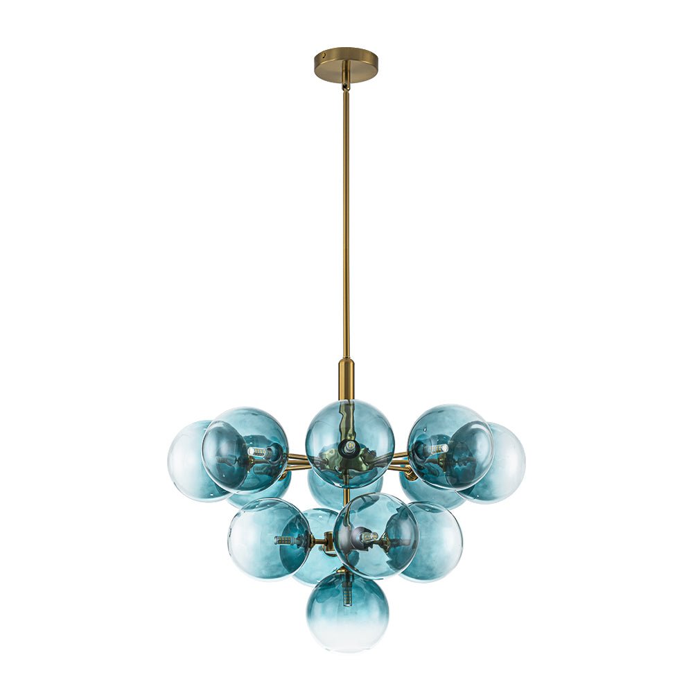 Thirteen Lights • Tiered Sputnik Design • Blue Glass Globes • Gradient Hue • Brushed Brass Finish • G9 Bulbs (Not Included) • Hardwired • UL Listed/ETL