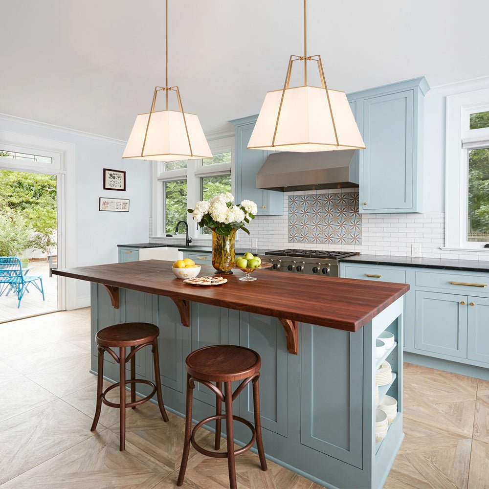 Harmonizing classic design with understated elegance, this 4-light lantern pendant light adds a striking focal point to any space, seamlessly complementing modern farmhouse or contemporary interiors. Crafted from durable metal with a warm brass finish, the wide, tapered square frame houses a coordinating fabric shade, creating a balanced and sophisticated silhouette. Designed for four E12 candelabra bulbs (not included), this cage chandelier casts a soft, inviting glow. Ideal for living rooms, bedrooms, foyers, or dining areas, this fabric cage pendant light infuses every room with charm and refined style.