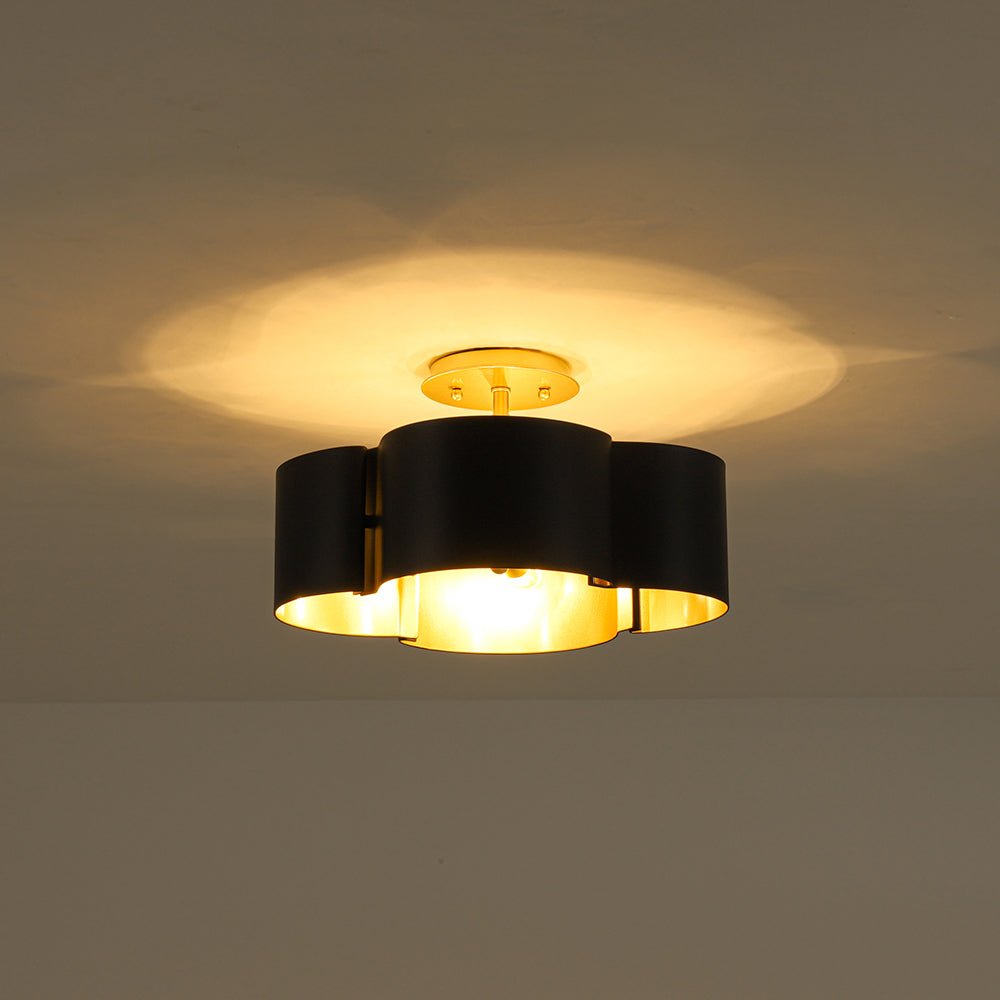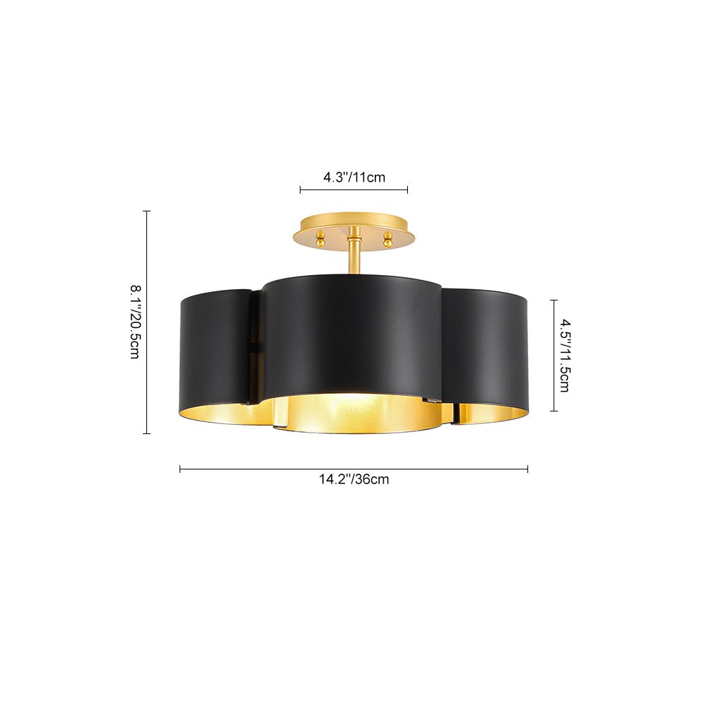 Infuse your home with vintage charm and architectural elegance through this 4-light iron cage semi flush mount. Inspired by the timeless quatrefoil motif, the design draws from classic European architecture and the diamond pattern of poker cards—symbolizing harmony and good fortune. Crafted from durable iron, its flower-like frame showcases gracefully curved lines that form a dimensional rounded silhouette, striking a perfect balance between strength and softness. The matte black exterior exudes understated sophistication, while the warm gold interior and accents bring a touch of vintage luxury and luminous warmth. When lit, the golden interior beautifully amplifies the light, casting a cozy, ambient glow that enriches the room with nostalgic allure and textural depth. Perfect for entryways, hallways, kitchens, dining rooms, bedrooms, or living areas, this quatrefoil semi flush mount adds a statement of refined artistry and timeless charm to both traditional and transitional interiors.