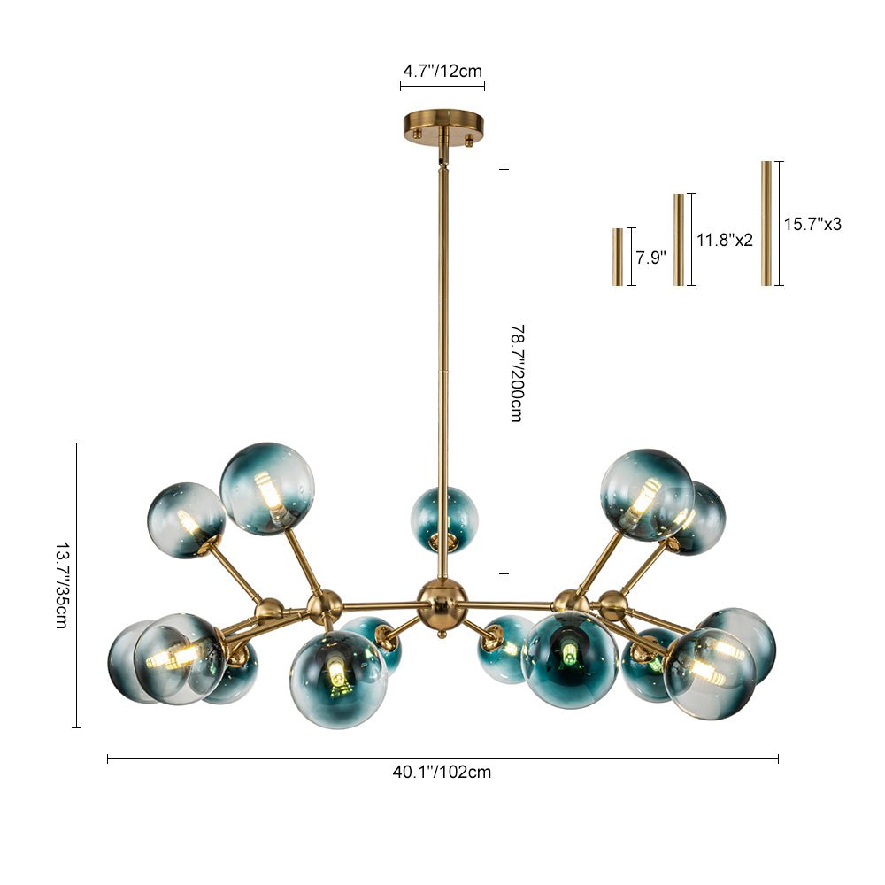 Fifteen Lights • Blue Glass Globes• Branching Arms • Sputnik Design • Black/Gold Finish • G9 Bulbs (Not Included) • Hardwired • UL Listed