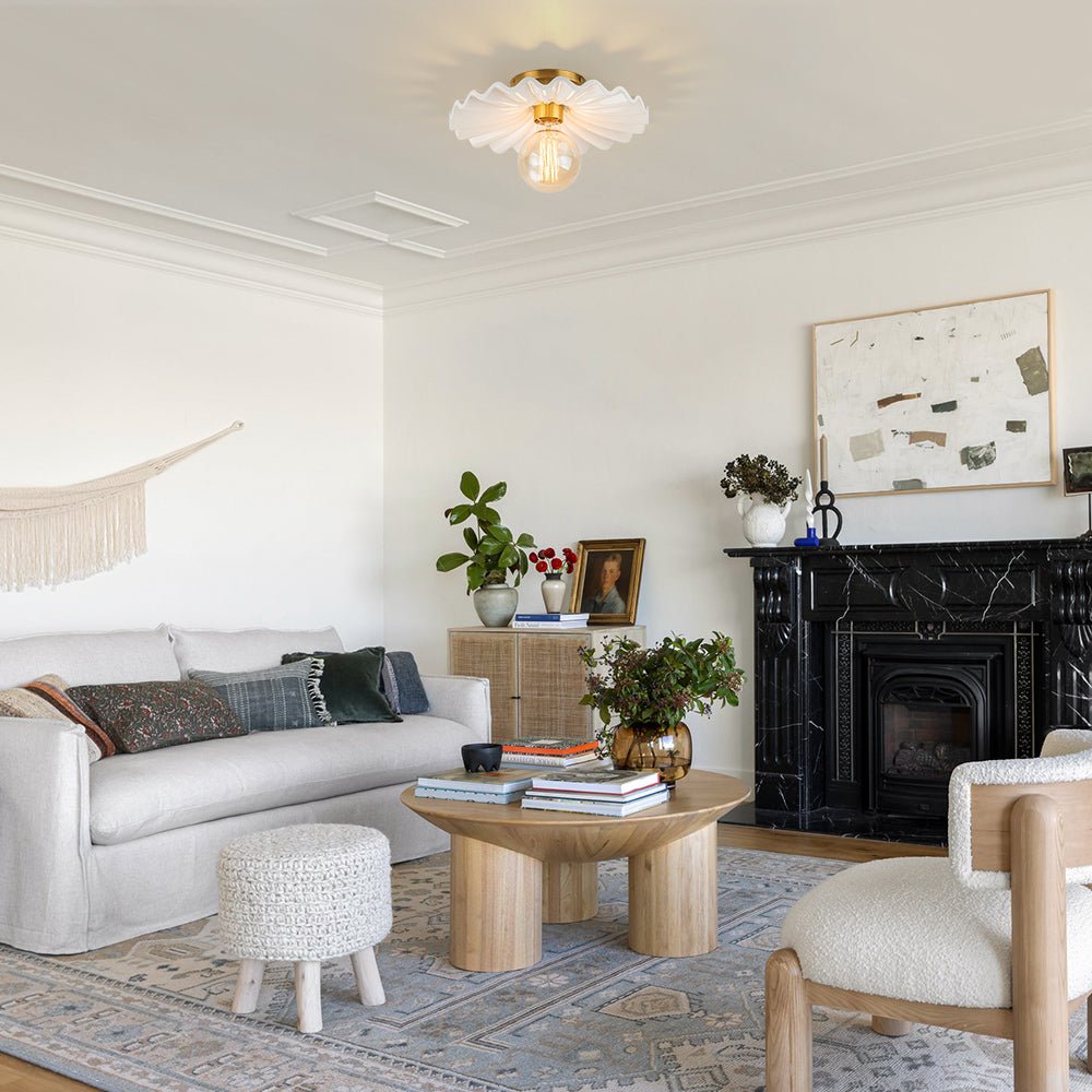 This semi flush mount ceiling light radiates an aura of sophistication and grace. Crafted of glossy creamy ceramic, this 1-light ceiling light is outfitted with one E26-base bulb (not included) and features an alluring saucer-like shade adorned with an elaborate pleated detail, like a delicate plate of dessert. Elegant and luxurious, this beautiful ceramic shade semi flush mount light is coated in antique brass finish, creating a chic mid-century vibe perfect for entryways, dining rooms, bathrooms, bedrooms, and living areas.