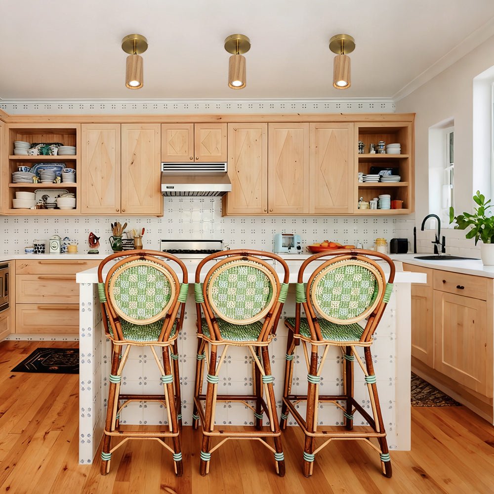 Bring minimalist design and rustic warmth together with this single spotlight, crafted to deliver both crisp style and versatile lighting. A brushed brass canopy and connector pair beautifully with the wood-grain cylindrical shade, striking a balance between modern farmhouse charm and Scandinavian sophistication.
