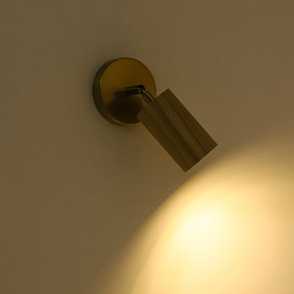 One Light ⢠Minimalist Spotlight ⢠Wooden Shade ⢠Adjustable Angle ⢠Focused Light ⢠Brushed Brass + Wood Grain ⢠GU10 Bulb (Not Included) ⢠Hardwired⢠UL Listed/ETL