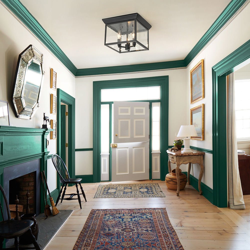 Crafted with a sturdy square frame, this Ā matte black metal lantern flush mount ceiling light encloses candle-style light sockets that hold three E12 candelabra bulbs (not included), adding a touch of traditional elegance. The clear seeded glass captures the essence of rain-kissed London windows, enhancing its classic Industrial Era Romance. Perfect for kitchens, entryways, closets, bathrooms, bedrooms, or dining areas, this square glass ceiling light brings a farmhouse sophistication with a sleek, minimalist edge, while delivering bright and efficient illumination.