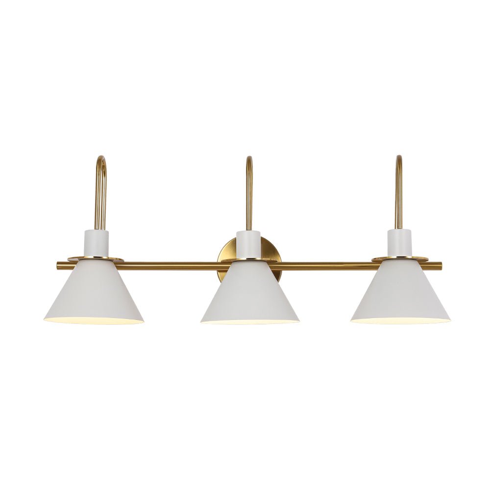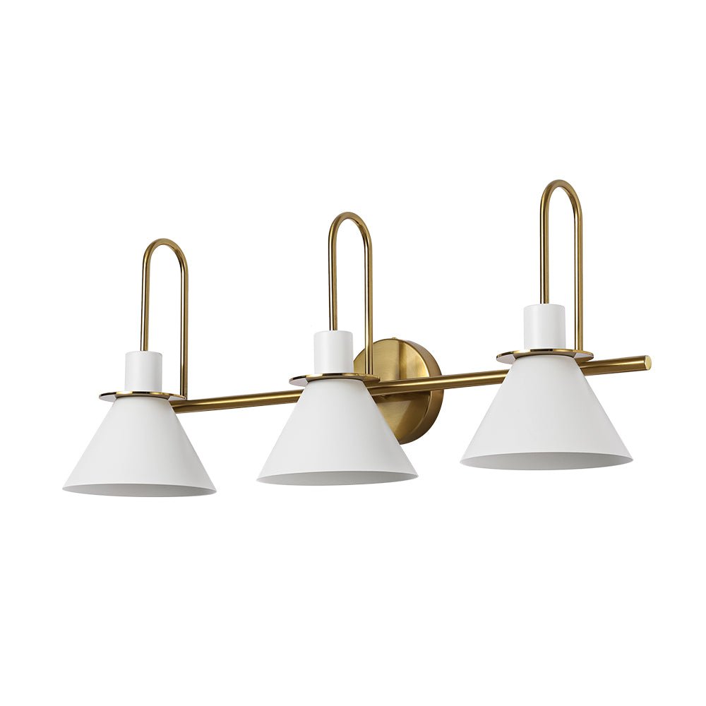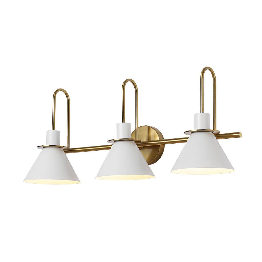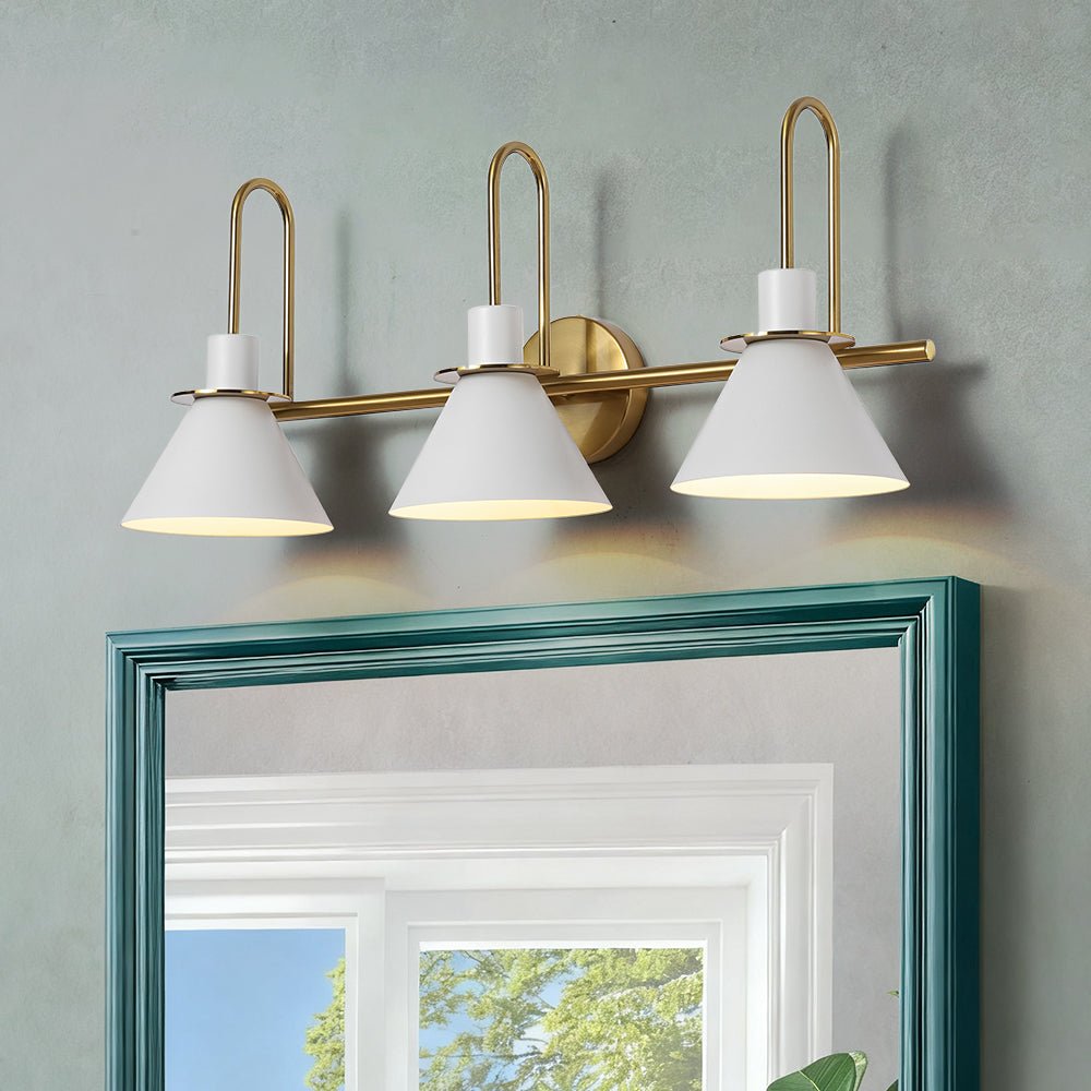 Bring a touch of modern elegance to your bathroom with this 3-light vanity wall sconce, inspired by sleek mid-century design. Each iron cone shade, available in black for a bold, contemporary edge or white for a clean, versatile look, is set on elegant goose arms extending from a slim linear bar. Brushed brass accents on the arms, bar, and canopy add a refined pop of warmth, enhancing the fixture with timeless mid-century charm. Perfect for placement above mirrors, flanking vanities, or brightening powder rooms, this conical shade wall lamp delivers both function and sophisticated style.