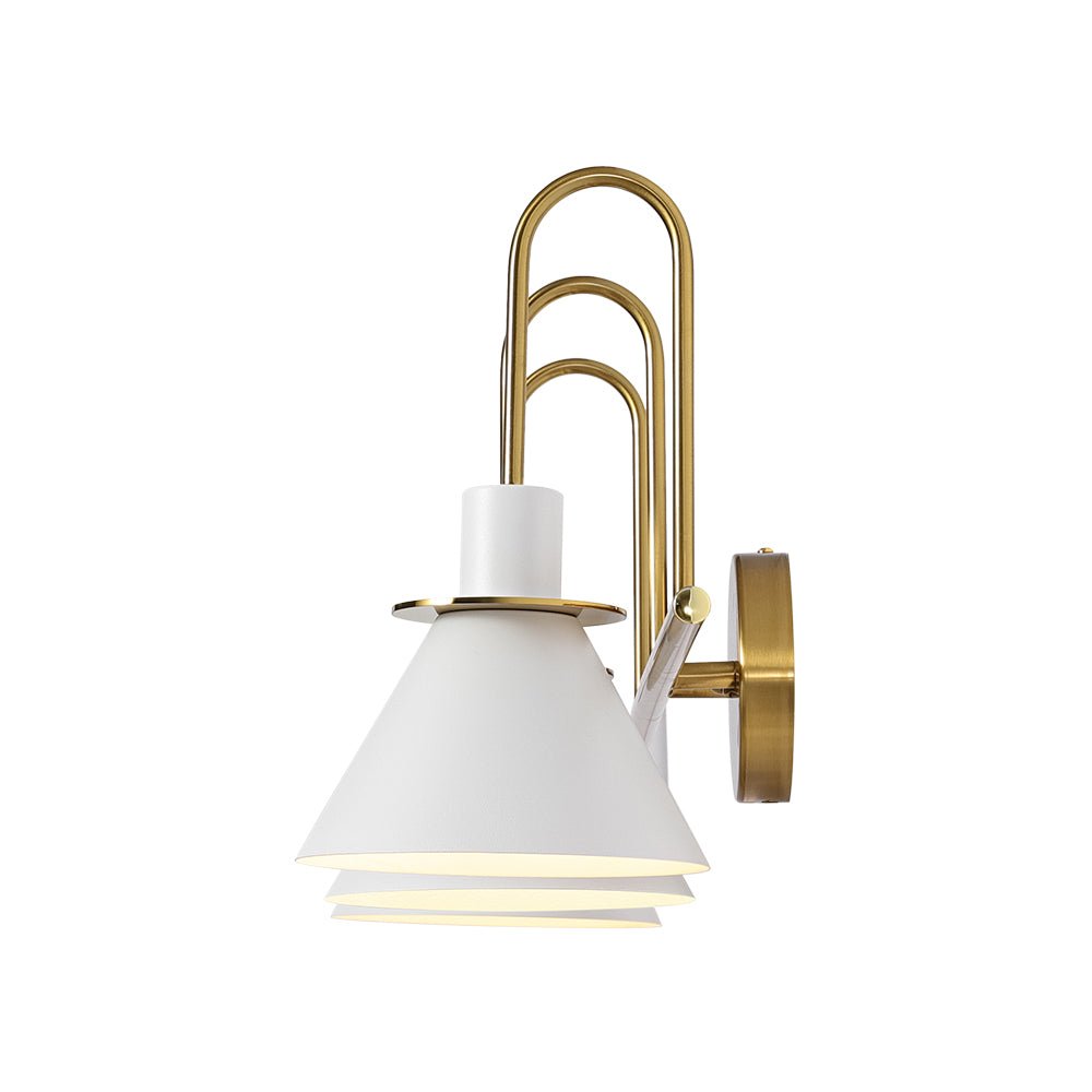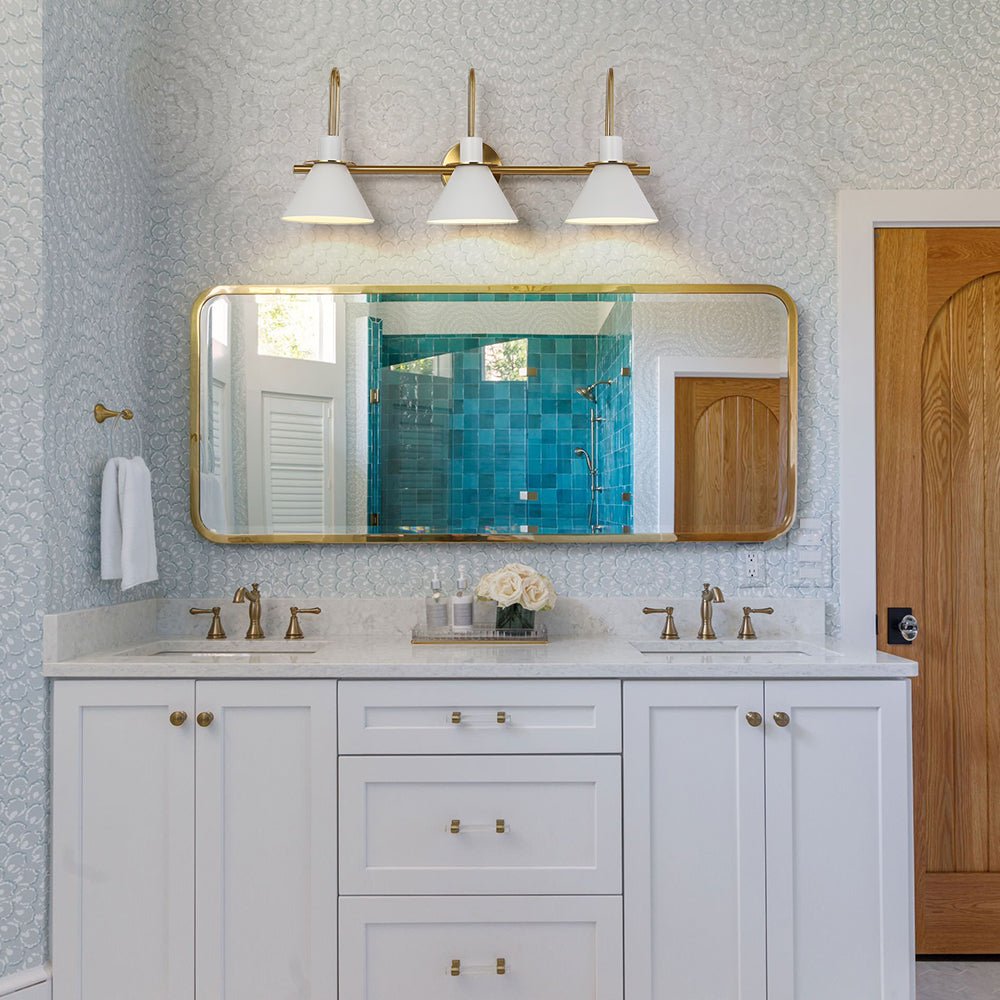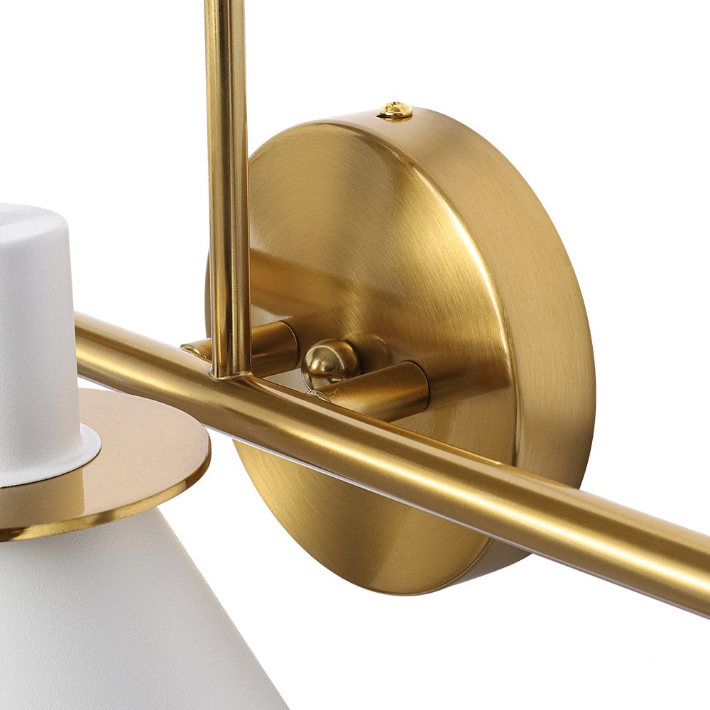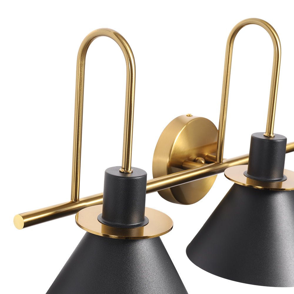 Bring a touch of modern elegance to your bathroom with this 3-light vanity wall sconce, inspired by sleek mid-century design. Each iron cone shade, available in black for a bold, contemporary edge or white for a clean, versatile look, is set on elegant goose arms extending from a slim linear bar. Brushed brass accents on the arms, bar, and canopy add a refined pop of warmth, enhancing the fixture with timeless mid-century charm. Perfect for placement above mirrors, flanking vanities, or brightening powder rooms, this conical shade wall lamp delivers both function and sophisticated style.