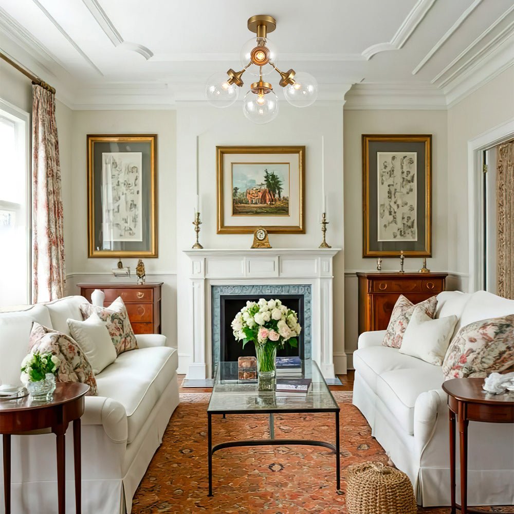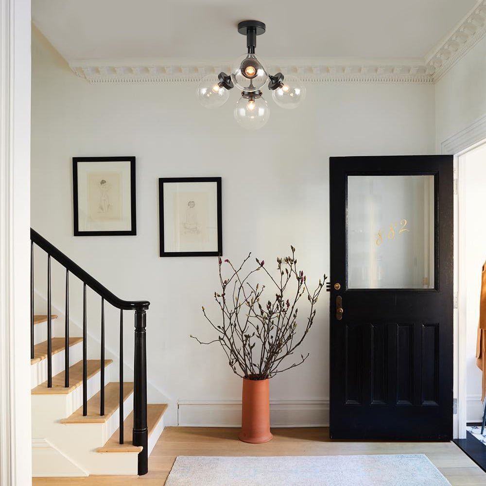This modern mid-century semi-flush mount features a minimalist Sputnik design with elegantly curved arms, creating a blooming structure. Clear glass globes adorn each arm, adding an ethereal, bubble-like allure while allowing E12 bulbs (not included) to provide bright, direct illumination. The brushed brass finish adds a touch of exquisite luxury, while the matte black option offers a sleek, contemporary flair. Ideal for enhancing the ambiance of a kitchen island, dining room, living room, bathroom, bedroom, entryway, or foyer, this 4-light glass globe Sputnik ceiling light combines both functionality and stylish décor.