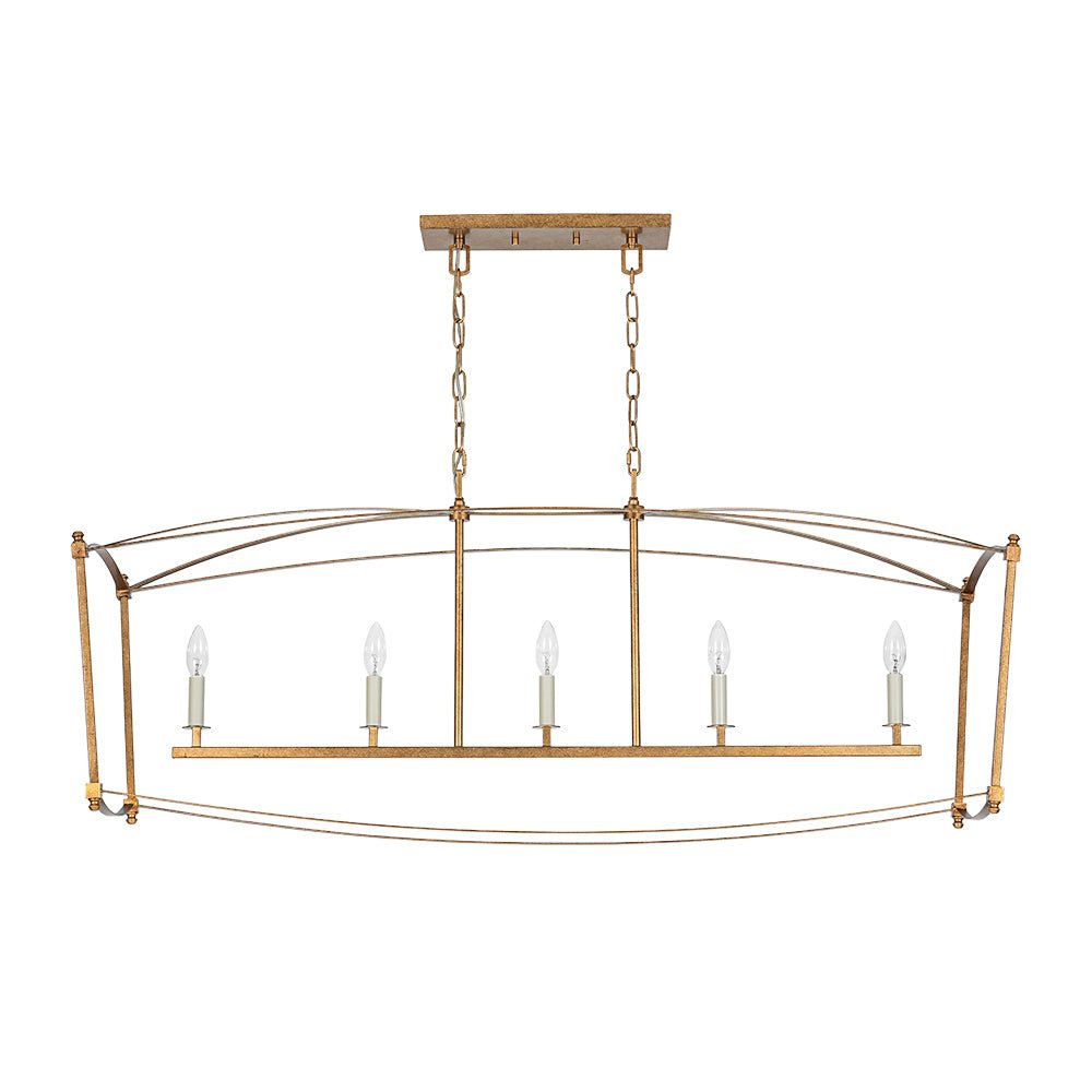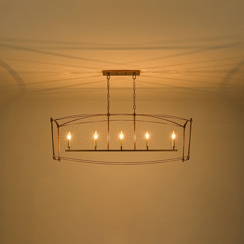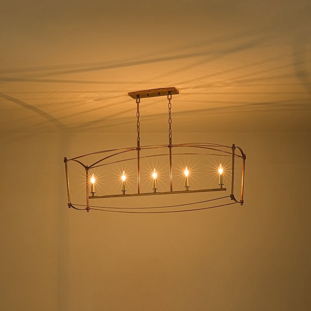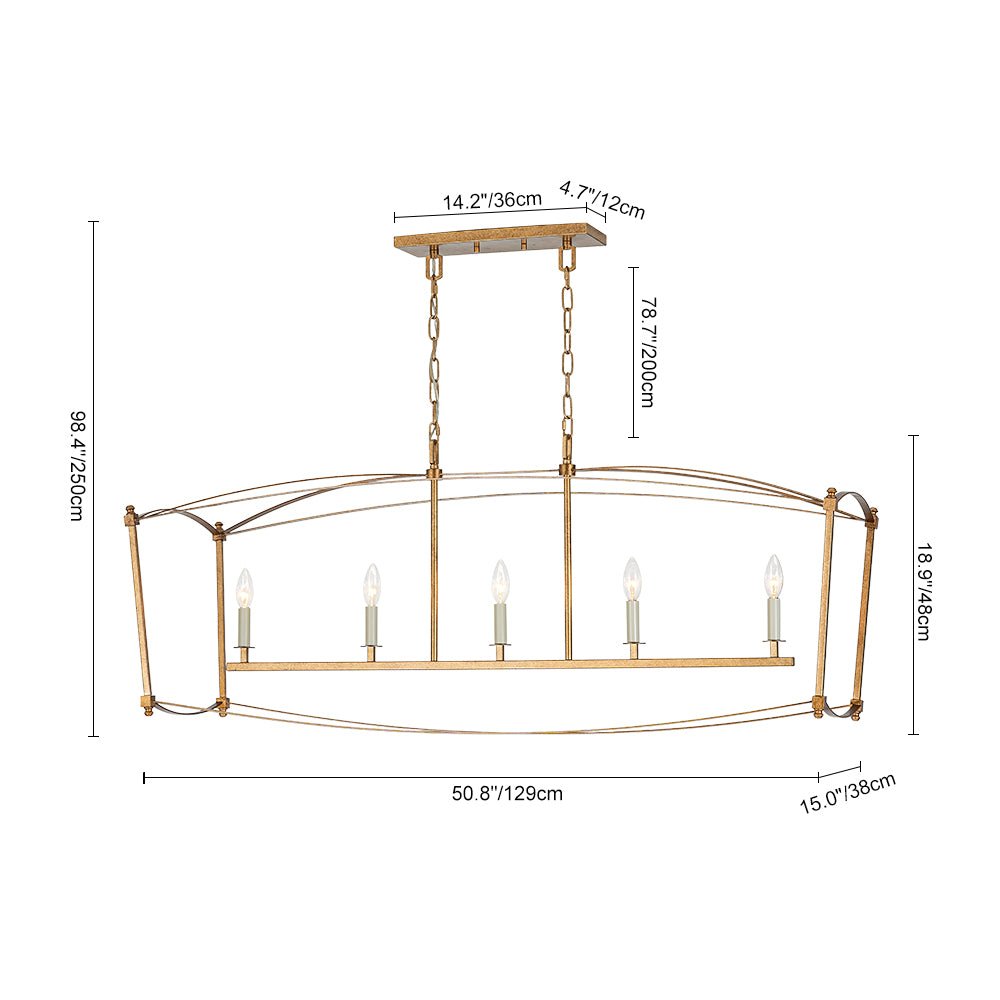 This 5-light vintage square cage kitchen island pendant offers generous ambient illumination within a clean, box-inspired silhouette that balances both function and beauty. Crafted from durable metal, the wide rectangular lantern frame features slender lines and softly arched details, evoking classic French country elegance with a light, airy presence. Five candle-style ivory sockets accommodate E12 candelabra bulbs (not included), enhancing the romantic cage design with timeless charm. Finished in distressed gold, this candle style lantern chandelier brings shabby chic warmth and gently aged character to your space. Ideal for kitchen islands, dining areas, breakfast nooks, entryways, or open-concept living spaces, this linear rectangle cage island chandelier creates an inviting focal point with refined rustic appeal.