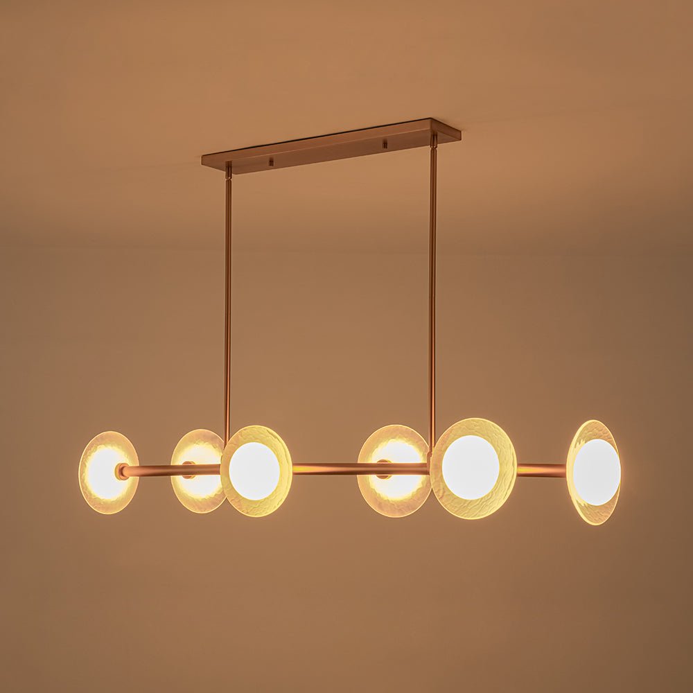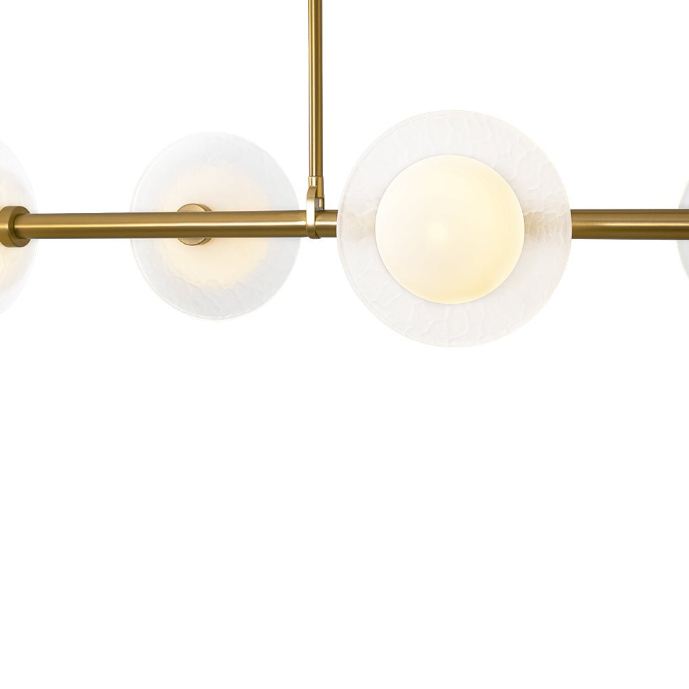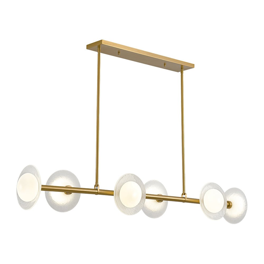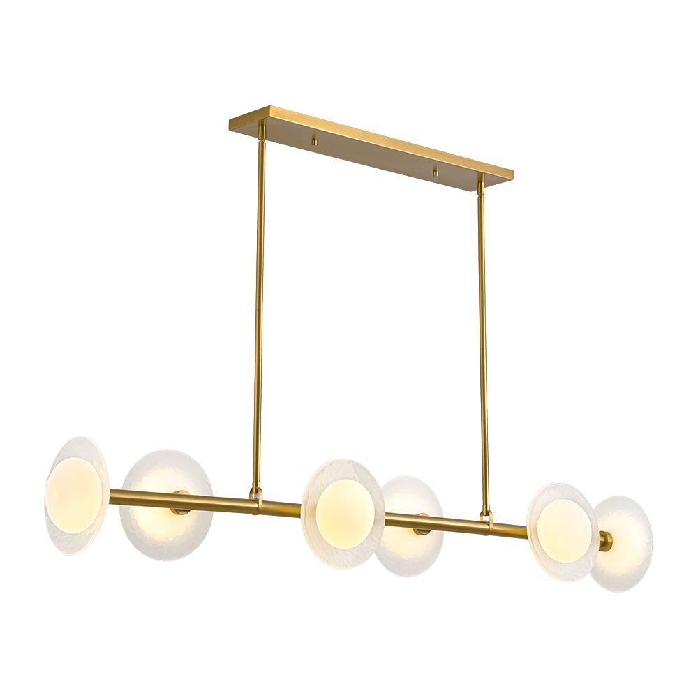 Bring sculptural elegance to your space with this 6-light linear island pendant finished in warm brushed brass. The design features a distinctive layered composition, highlighted by saucer-like bases crafted from frosted etched glass with subtle hammered ripple-like textures. Paired with smooth white oval glass shades, the fixture creates a beautiful dimensional effect when illuminated. Light gently refracts through the textured glass, revealing rich surface details and evoking the delicate charm of a ceramic saucer supporting opal-like jewels. The result is a soft, cozy glow that enhances the atmosphere of the room. Perfect for kitchen islands, dining tables, or long counters, this frosted glass globe island chandelier adds refined modern style and warm ambient lighting to both contemporary and transitional interiors.