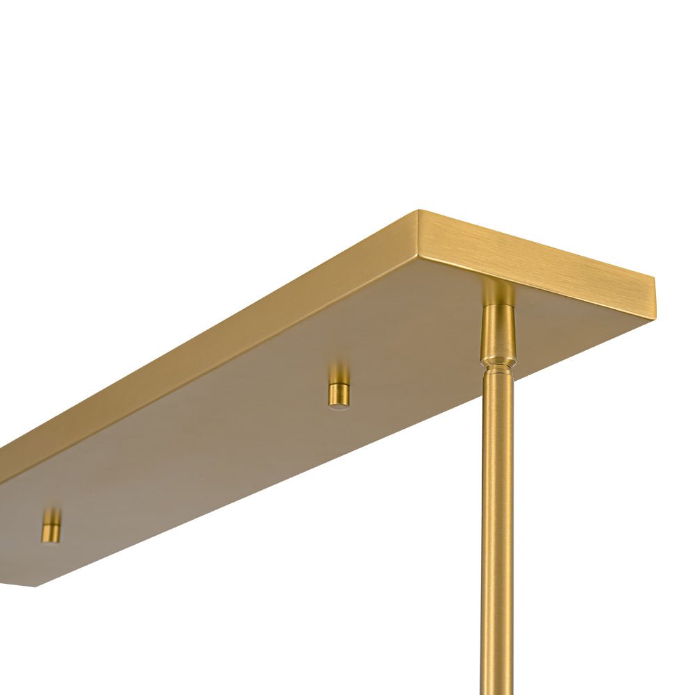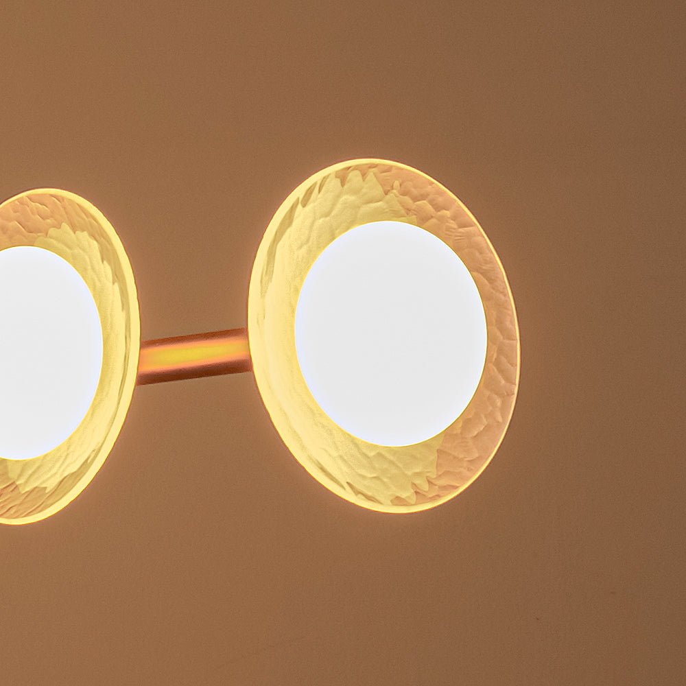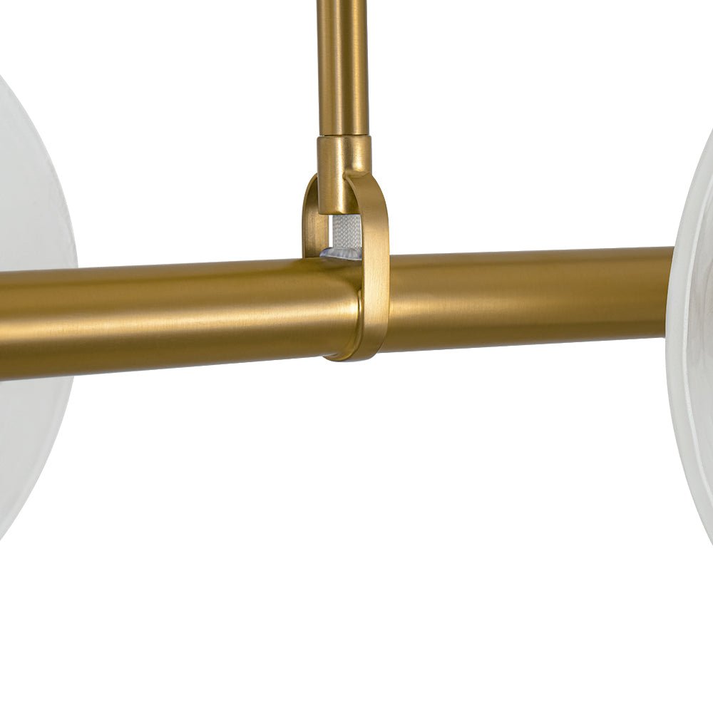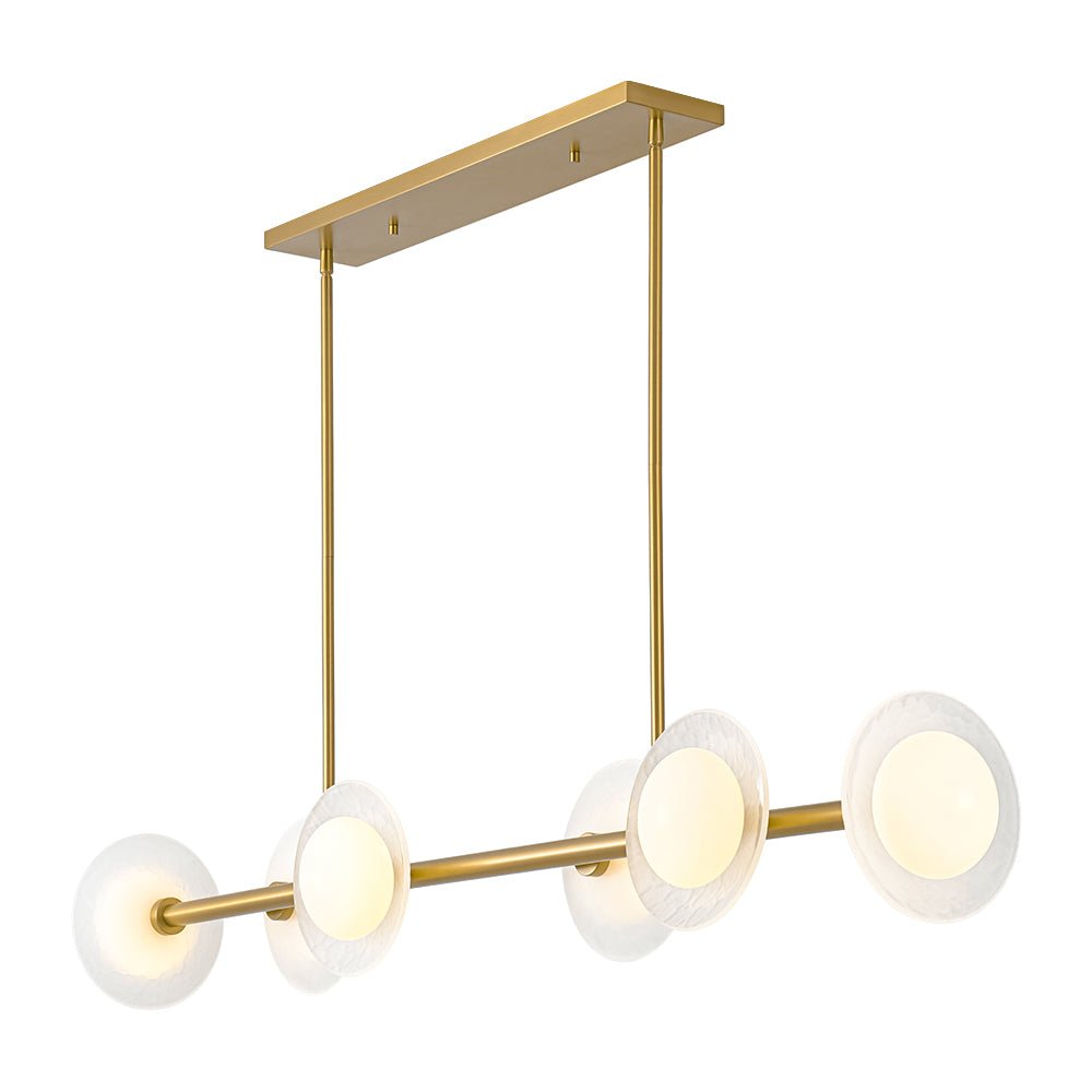 Bring sculptural elegance to your space with this 6-light linear island pendant finished in warm brushed brass. The design features a distinctive layered composition, highlighted by saucer-like bases crafted from frosted etched glass with subtle hammered ripple-like textures. Paired with smooth white oval glass shades, the fixture creates a beautiful dimensional effect when illuminated. Light gently refracts through the textured glass, revealing rich surface details and evoking the delicate charm of a ceramic saucer supporting opal-like jewels. The result is a soft, cozy glow that enhances the atmosphere of the room. Perfect for kitchen islands, dining tables, or long counters, this frosted glass globe island chandelier adds refined modern style and warm ambient lighting to both contemporary and transitional interiors.