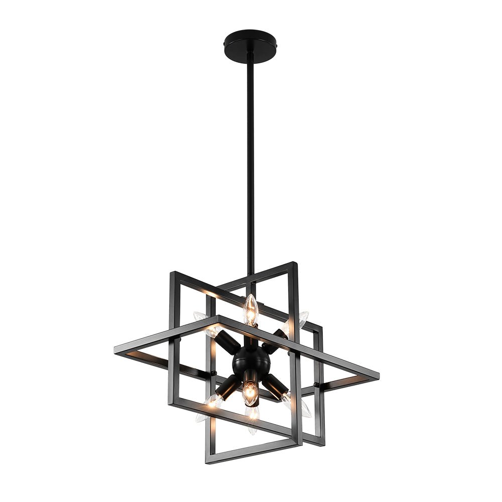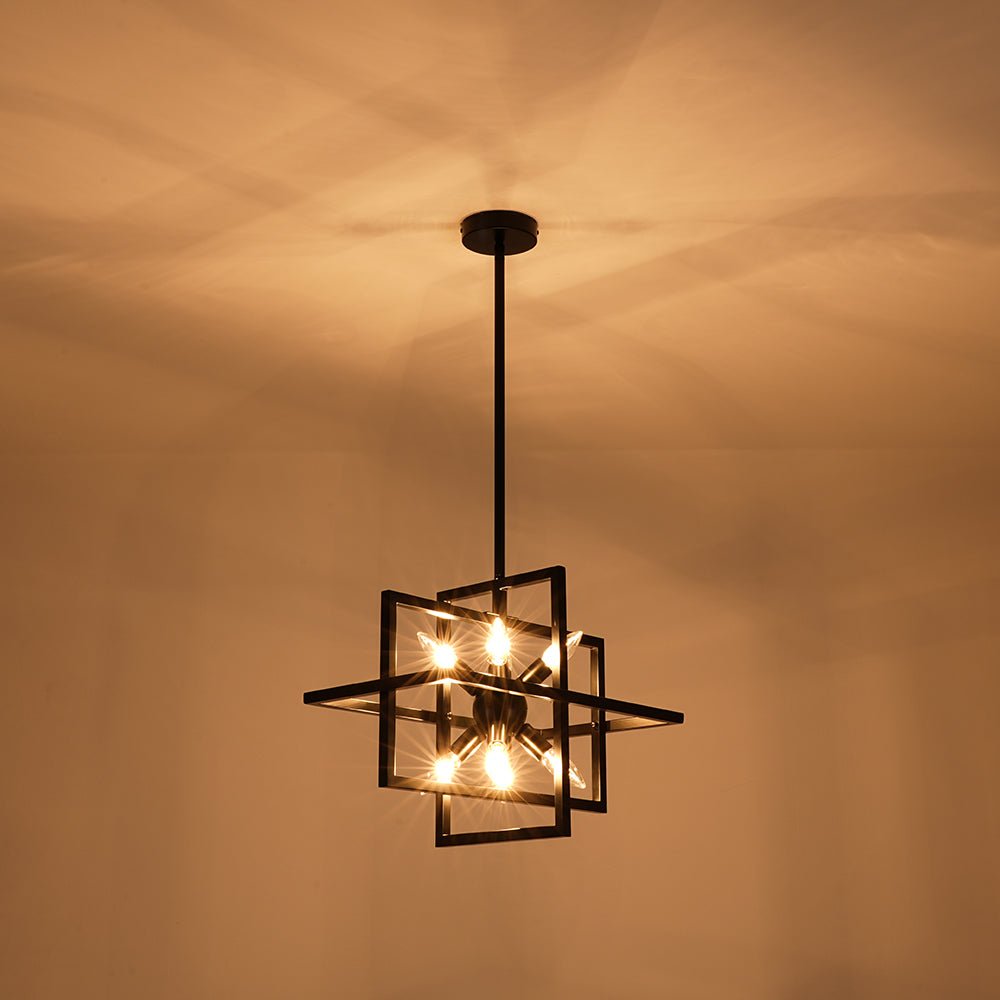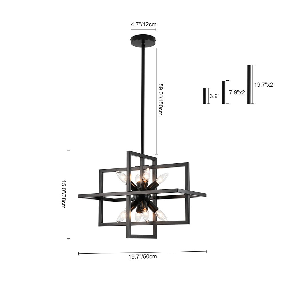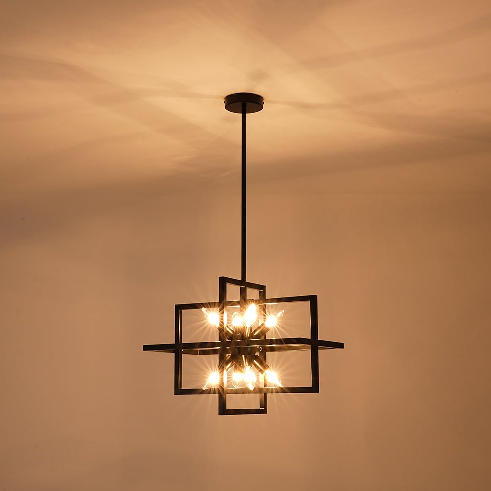 Infuse your space with bold character through this 8-light cage chandelier, where architectural lines meet vintage-inspired flair. The rectangular lantern frame, finished in matte black, evokes the strength of an iron gate while maintaining an airy, open silhouette. Inside, a cluster of sleek, sputnik-style light holders radiates outward, each designed to hold an E12 candelabra bulb (not included), casting light in every direction like a constellation suspended in midair. The open structure not only amplifies brightness but also creates dramatic shadows and dimension, making this square lantern pendant a striking centerpiece for dining areas, grand foyers, staircases, or kitchens. Equal parts modern statement and timeless design, it’s a fixture that grounds your space with both presence and elegance.