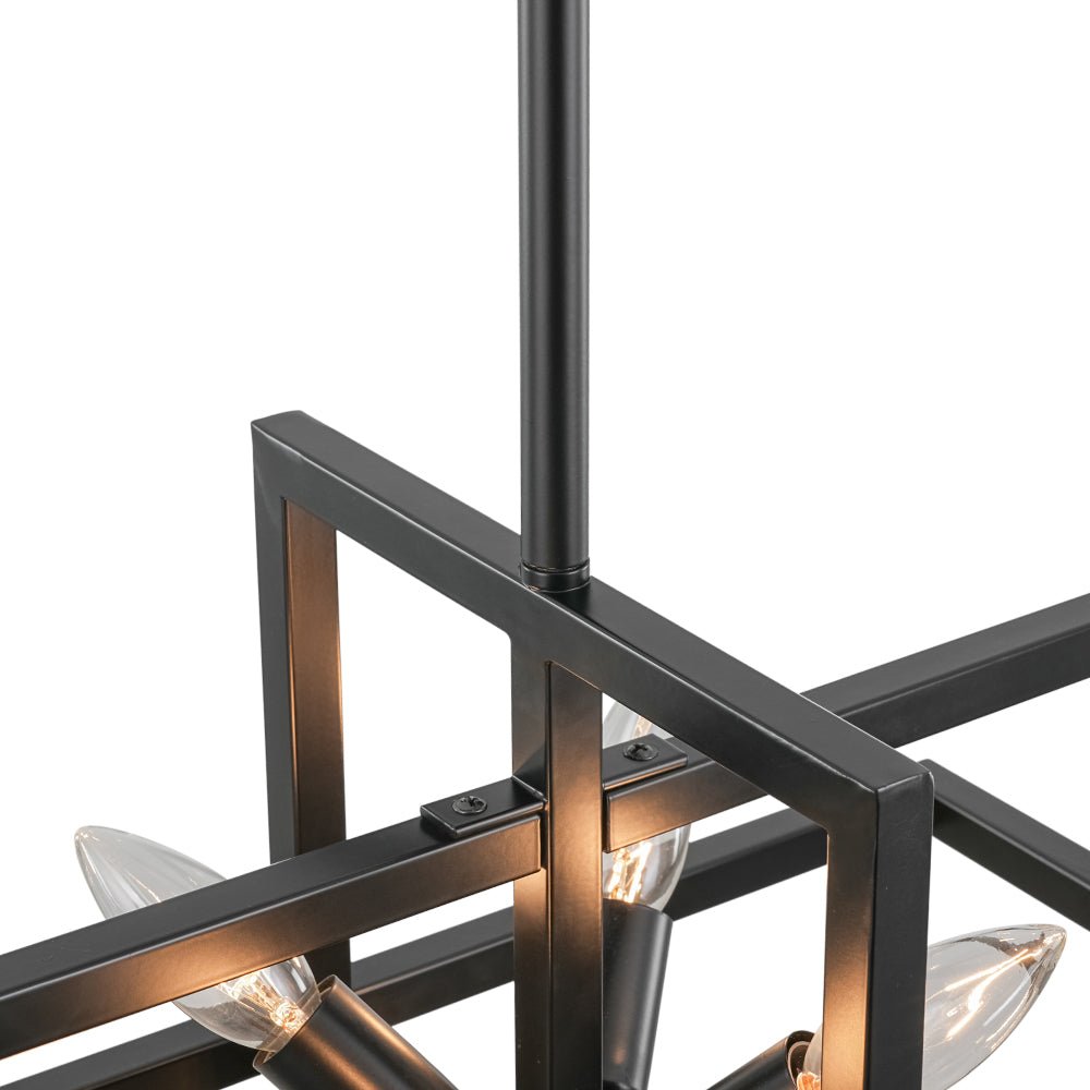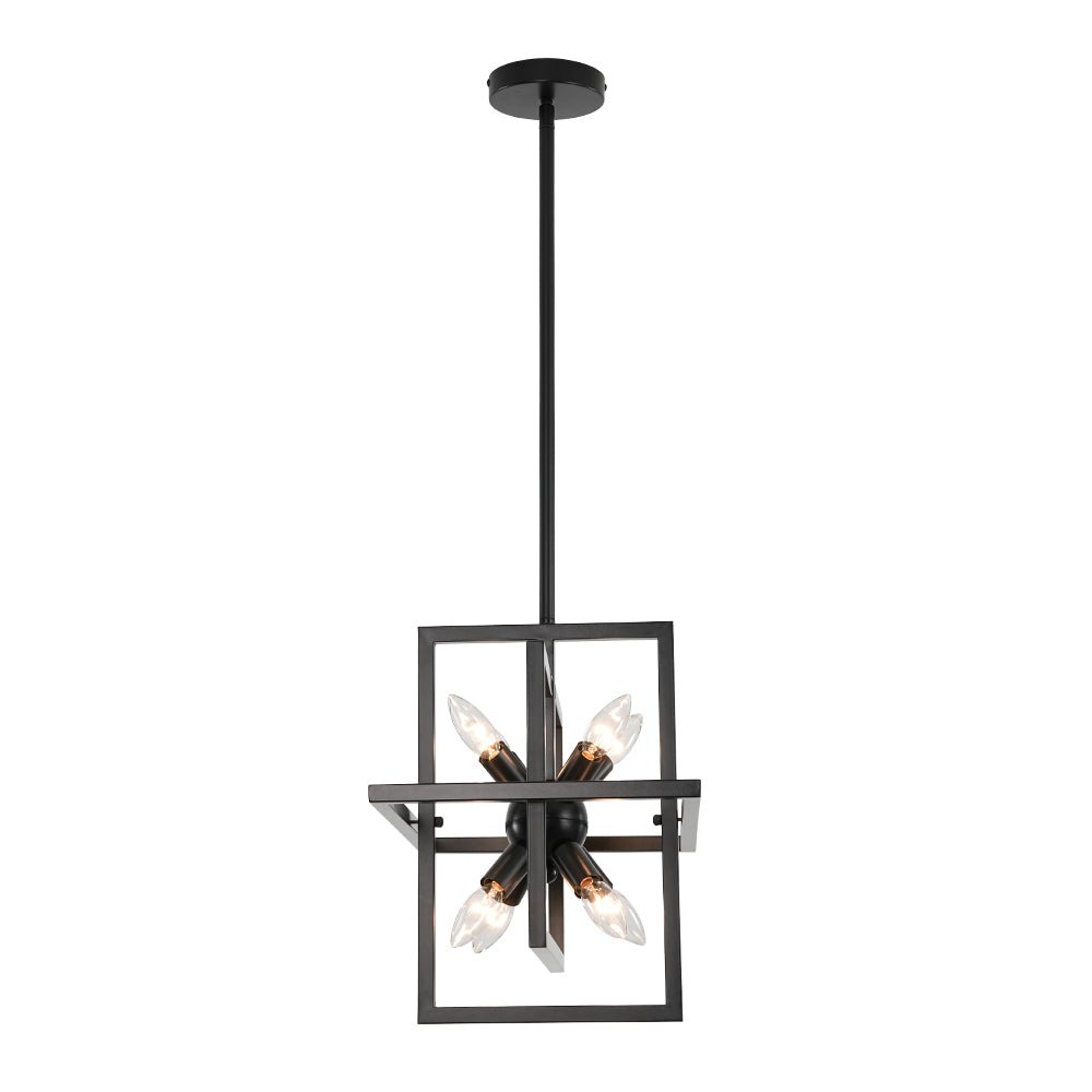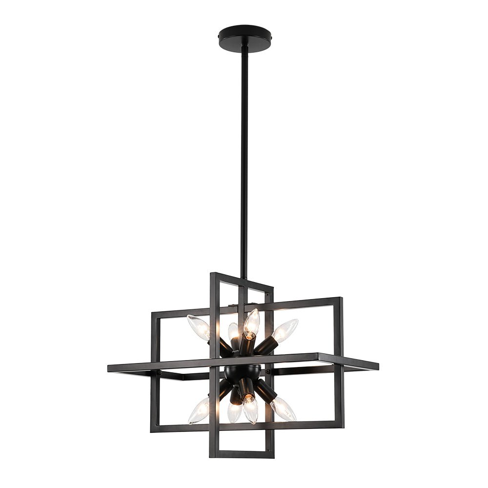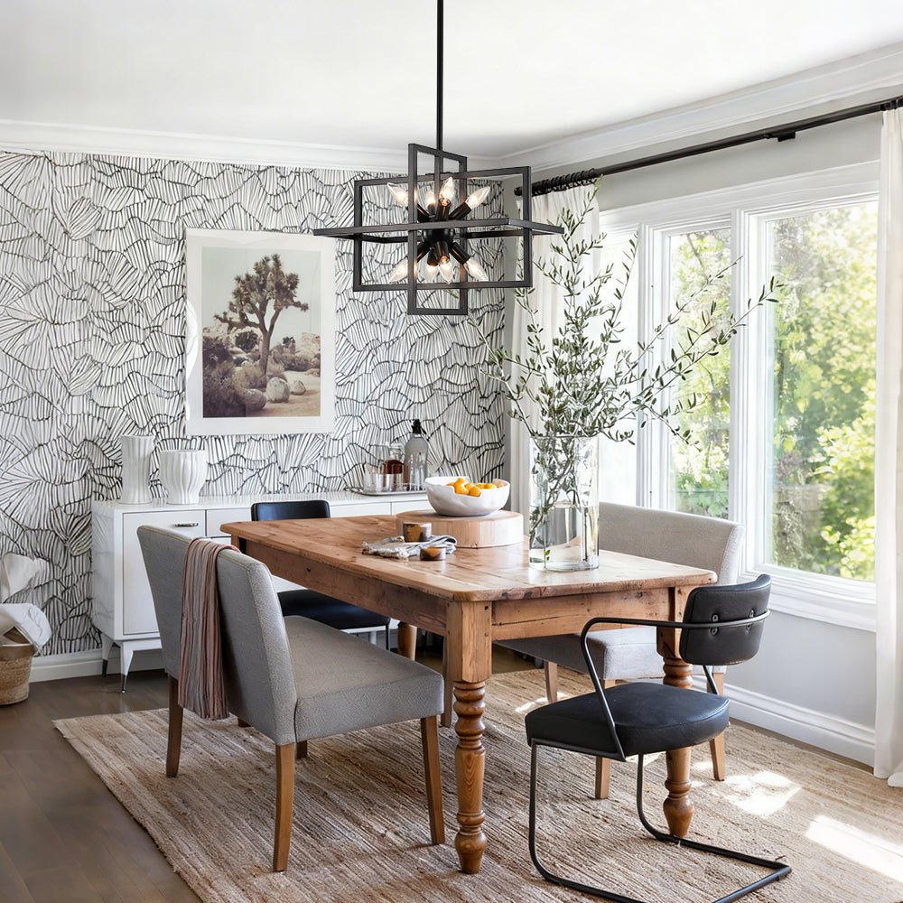 Infuse your space with bold character through this 8-light cage chandelier, where architectural lines meet vintage-inspired flair. The rectangular lantern frame, finished in matte black, evokes the strength of an iron gate while maintaining an airy, open silhouette. Inside, a cluster of sleek, sputnik-style light holders radiates outward, each designed to hold an E12 candelabra bulb (not included), casting light in every direction like a constellation suspended in midair. The open structure not only amplifies brightness but also creates dramatic shadows and dimension, making this square lantern pendant a striking centerpiece for dining areas, grand foyers, staircases, or kitchens. Equal parts modern statement and timeless design, it’s a fixture that grounds your space with both presence and elegance.