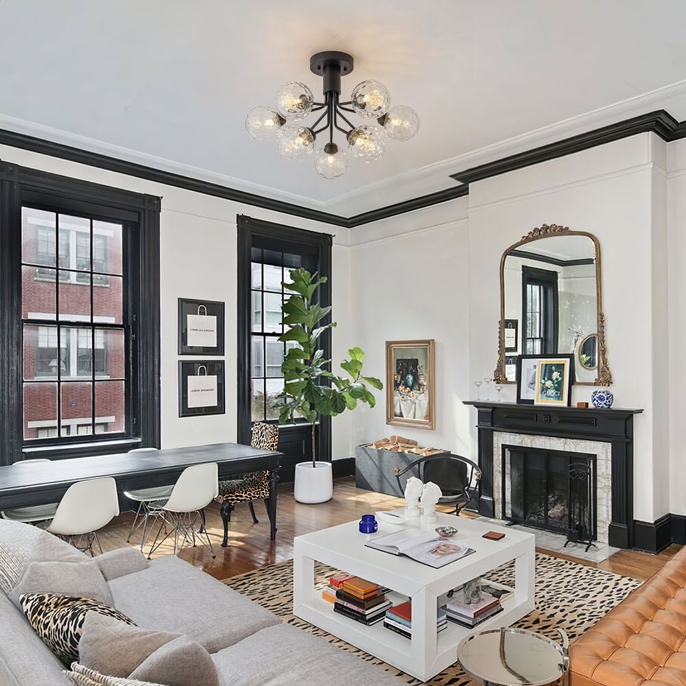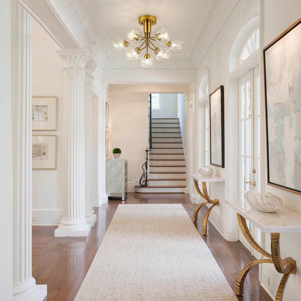 This Mid-Century modern Sputnik semi flush mount light features a creative design with curved arms arranged in tiers, resembling a cascading bouquet blooming from the ceiling. Nine clear water glass globes are attached to each arm, adding an adorable bubble-like charm to the sputnik light fixture. When illuminated, the hammered texture of the glass gently diffuses the glow from G9 LED bulbs (not included), creating a soft, ripple-like effect that fills the space with subtle, atmospheric lighting. The brushed brass finish brings an elegant touch of luxury, while the matte black option adds a sleek, contemporary vibe. Perfect for elevating the ambiance in a kitchen island, dining room, living room, bathroom, bedroom, entryway, or foyer, this 9-light glass globe bubble Sputnik chandelier seamlessly blends both function and style.