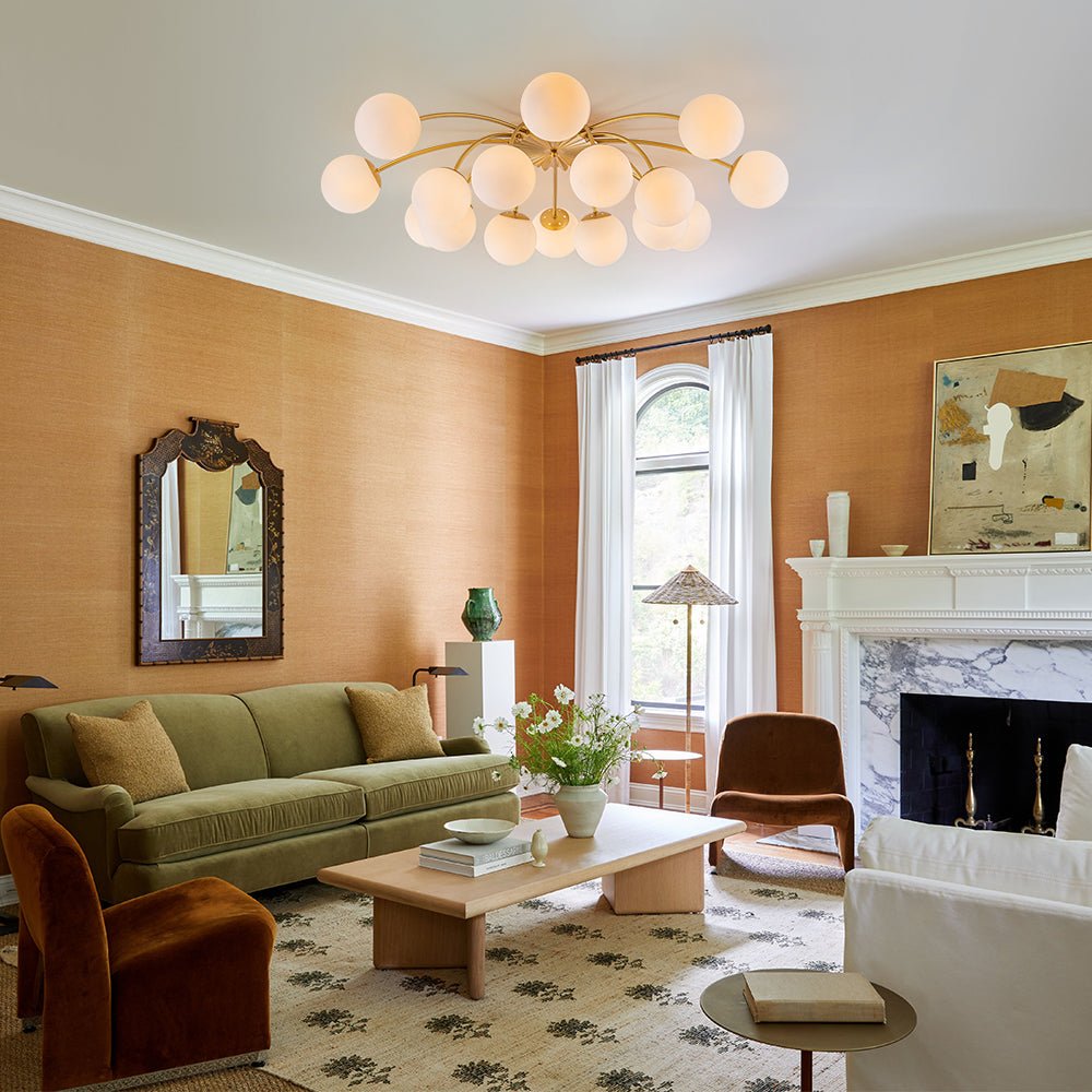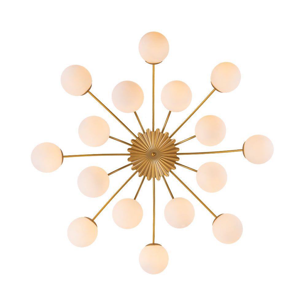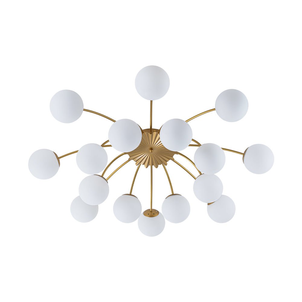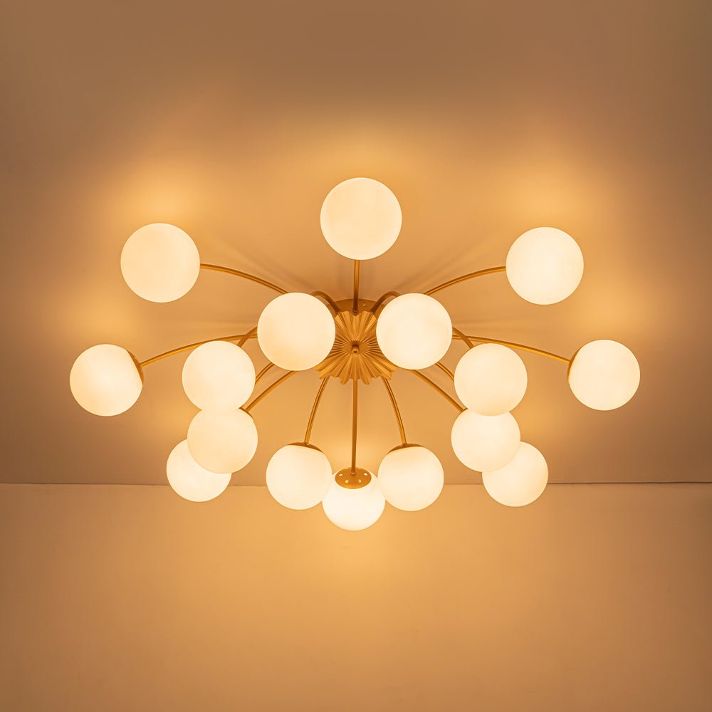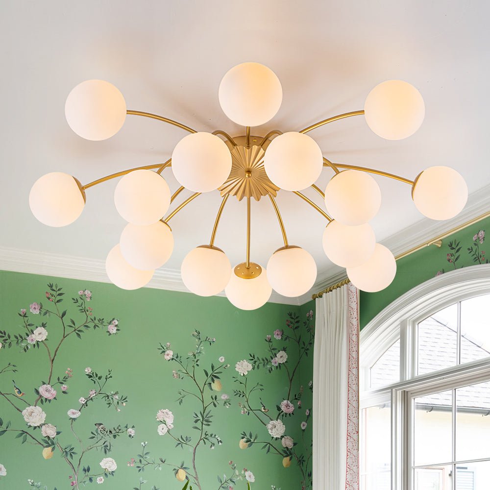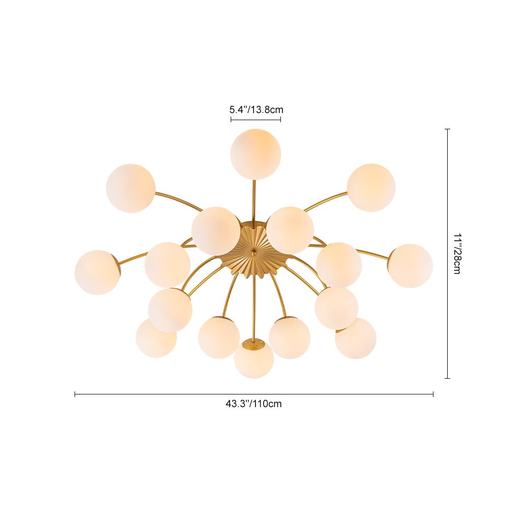 An opulent fusion of classic Sputnik and elegant bubble design, this 16-light semi-flush chandelier features gracefully curved arms cascading from the back of a medal-like base to support alluring milky white glass globes, like a beautiful blossom firework. Warm cozy lighting sweeps down to your space when we turn on this glass globe sputnik chandelier, flowing through frosted glass bubbles and the luxe brass frame with elegance. Perfect to add artful charm and sophisticated beauty to your home decor, this 16-light opal glass bubble funky chandelier is the best enhancement to a living room, dining room, entryway, bedroom, or lobby.