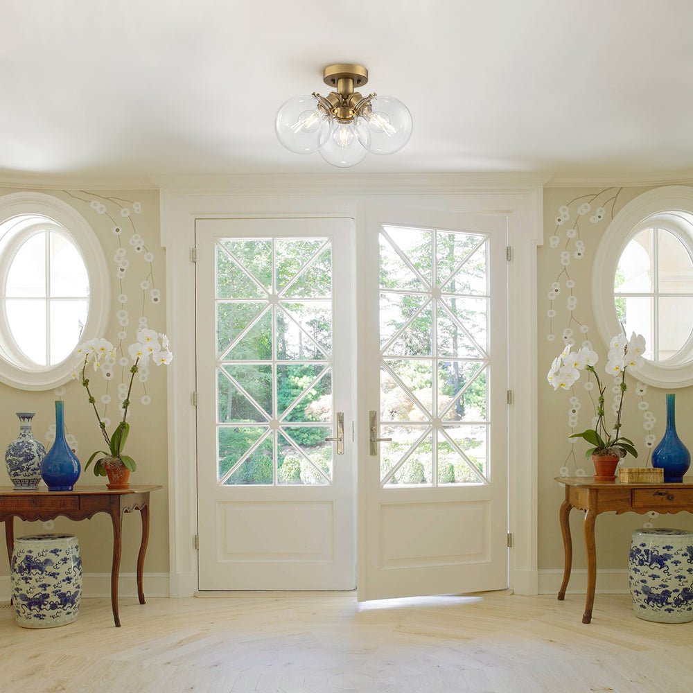 This 3-light Sputnik semi flush mount effortlessly blends Mid-Century modern flair with contemporary minimalist design. The semi-flush mount design showcases three light holders radiating from a central base, each supporting a glass sphere. These transparent glass orbs emulate the ethereal appearance of soap bubbles, while ensuring direct bright glow with E26 bulbs (not included). Finished in brushed brass, this bubble ceiling light brings a touch of refined elegance, perfect for enhancing the ambiance of your entryway, kitchen, dining room, living room, bedroom, or bathroom.
