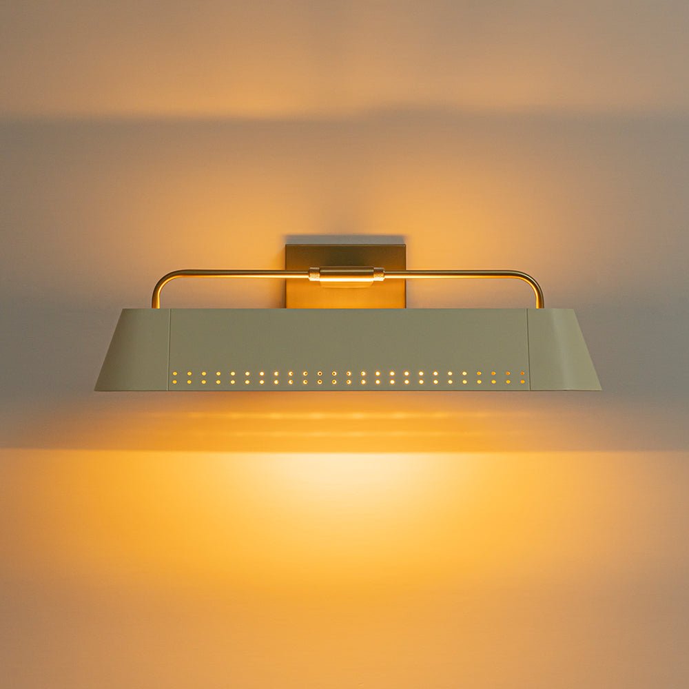 Infuse your space with understated sophistication through this modern linear wall sconce, expertly crafted from durable iron. The gently tapered rectangular shade, finished in a soft beige tone, pairs beautifully with brushed brass accents for a touch of timeless luxury. A row of delicate pinholes lines the upper and lower edges of the shade, subtly filtering light to create a warm, ambient glow while adding refined texture and depth to the design. Perfect as a vanity light, picture light, or accent fixture in hallways, living rooms, bedrooms, or kitchen sink areas, this metal wall lamp embodies both functionality and modern mid-century artistry, elevating your décor with effortless elegance.