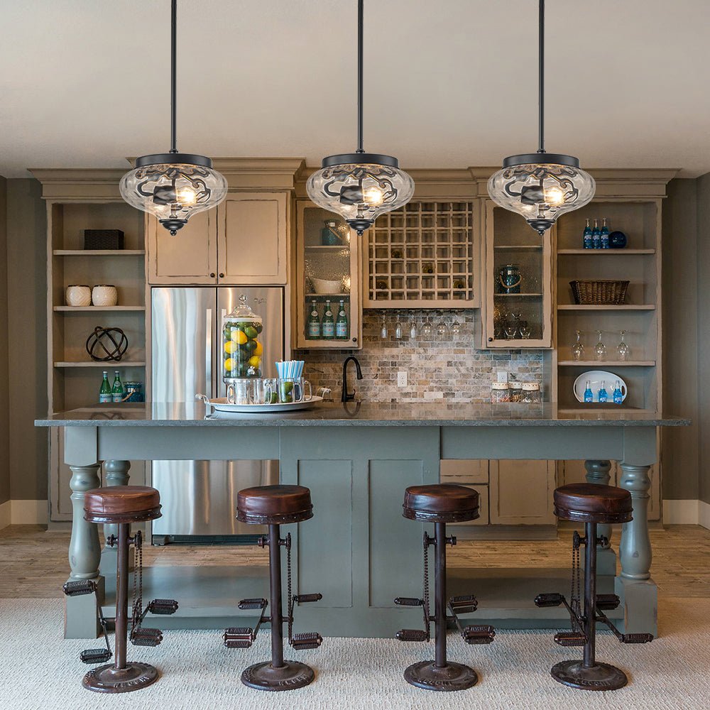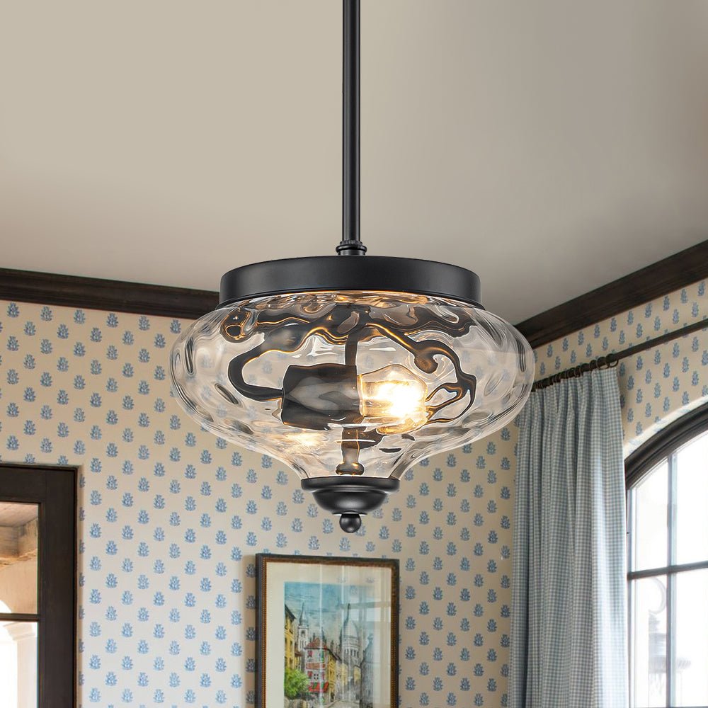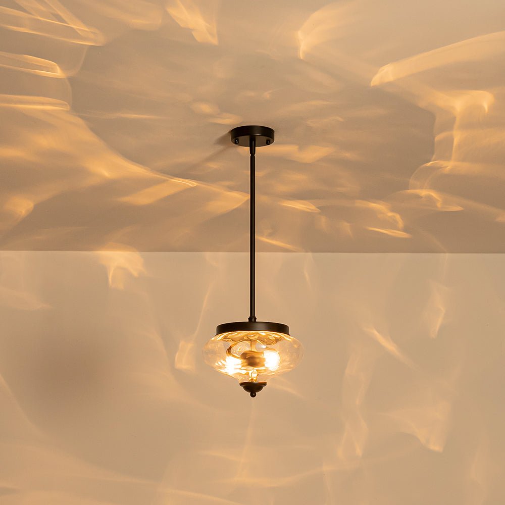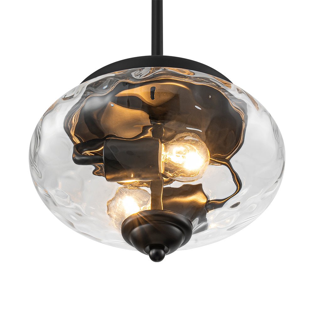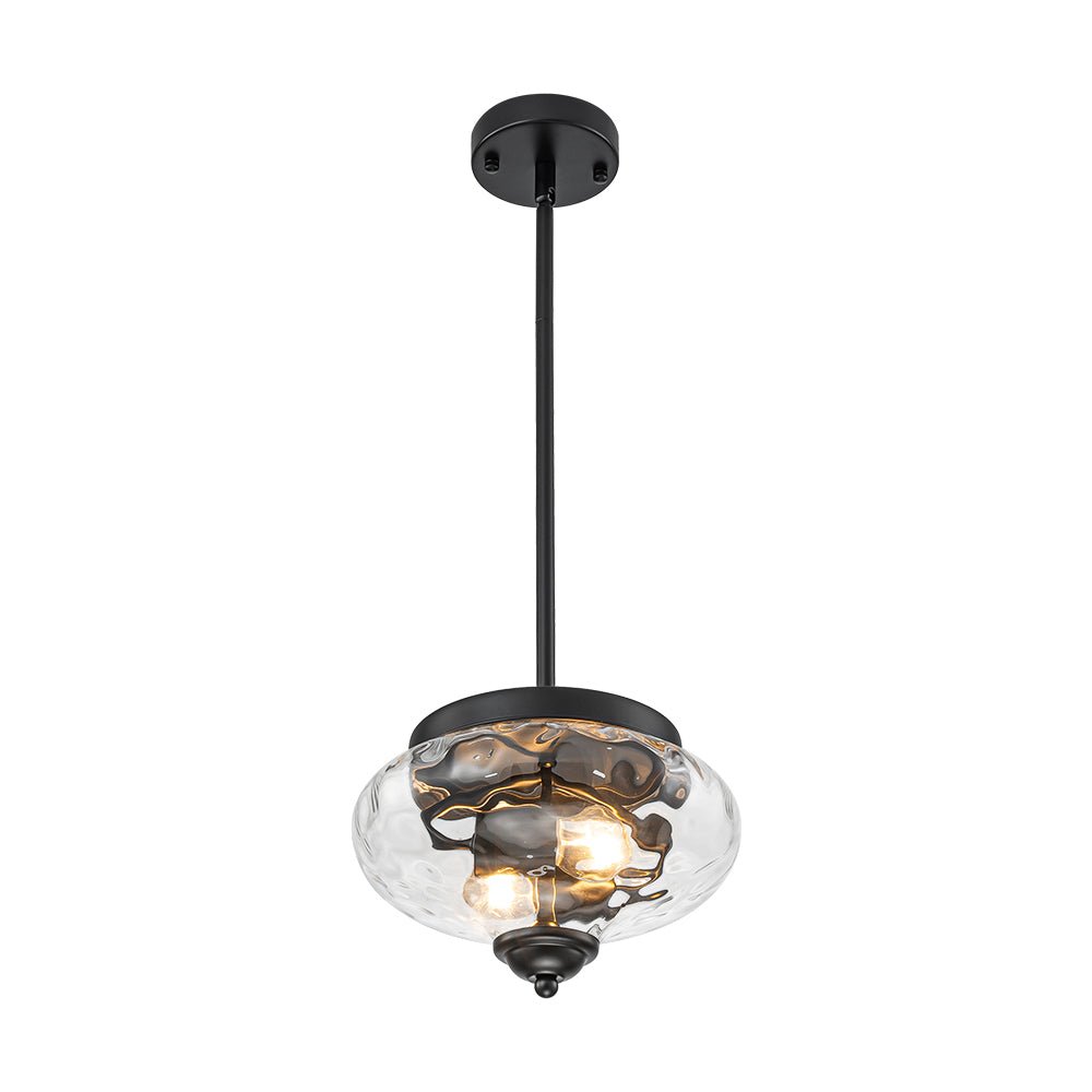 Noticeable yet not overwhelming, this industrial glass pendant light is the perfect balance of subtle style and practical function. The 2-light design features a clear hammered glass shade with sleek, uneven texture adding a touch of dimensional glamour. When illuminated, the water-textured glass diffuses light into mesmerizing ripples, creating a stunning ambient glow with ample task brightness. The removable, adjustable hanging pole allows for both flush-mount and pendant installation. Whether arranged in multiples over a kitchen island, dining table, hallway, stairwell, or entryway, or placed singly in compact areas like bathrooms, closets, or laundry rooms, this hammered glass light fixture delivers both decorative appeal and functional lighting.