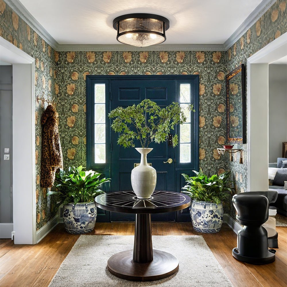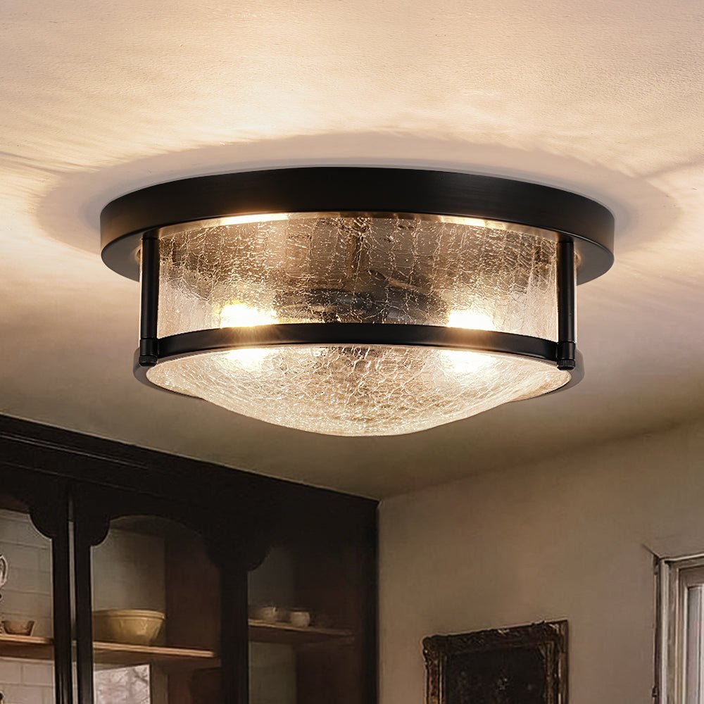 Blending sleek modern design with classic texture, this 2-light round ceiling light offers the perfect touch of understated elegance to any entryway, staircase, foyer, hallway, bedroom, bathroom, or kitchen. Crafted with a matte black metal drum frame, this flush mount ceiling light houses a beautifully crackled glass shade that brings both character and charm to the piece.