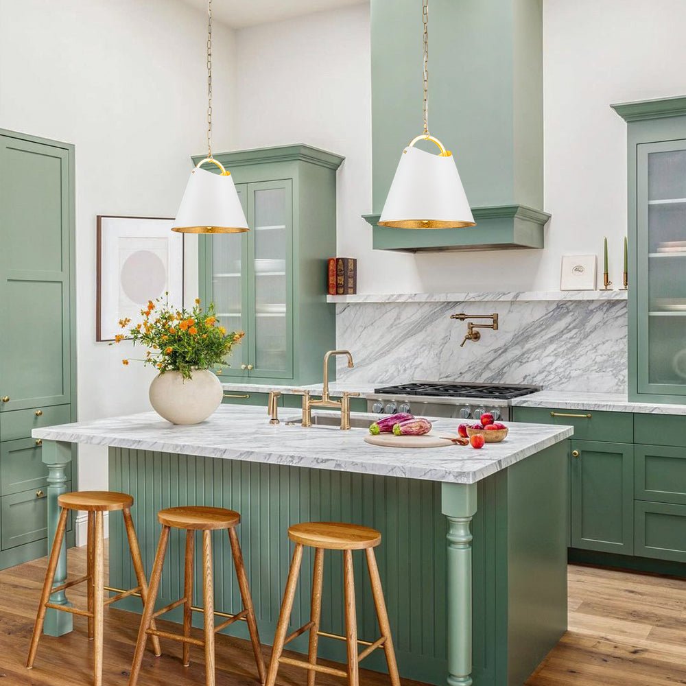 Bring timeless elegance and minimalist charm to your space with this 1-light iron cone kitchen pendant. Featuring a matte white metal conical shade with a gracefully rolled rim and an arched upper support, the design blends Scandinavian simplicity with refined vintage appeal. The brushed brass chain and canopy enhance its mid-century character, while the gold-foiled interior, rim, and arch details add a luxurious, warm glow when illuminated.
