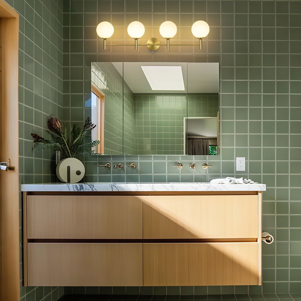 Perfect for bathroom vanities, powder rooms, dressing areas, or above a mirror and sink in your bedroom or hallway, the four evenly spaced glass globes ensure balanced illuminationāwhether you're getting ready for the day or creating a relaxing evening atmosphere.