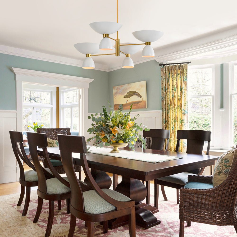 Elevate mid-century grandeur with this 8-light linear Sputnik chandelier, featuring four sets of elegantly designed cup-and-saucer shades that cast light both upward and downward, creating a distinctive ambient glow. The matte white shades offer a clean, minimalist, and modern aesthetic, while the aged brass accents add warmth and a timeless vintage charm. Perfect for illuminating a dining room, kitchen island, entryway, living room, foyer, or lounge, this up-and-down shade Sputnik chandelier strikes the perfect balance between traditional and contemporary design.
