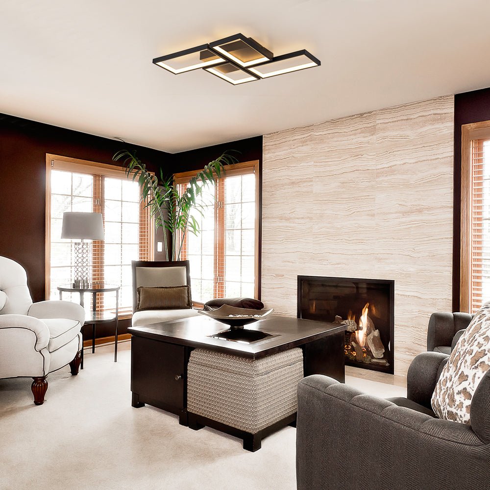Bring clean lines and modern function to your space with this low-profile LED semi flush mount light. Finished in sanded black, the fixture features four interlocking rectangular frames that form a geometric yet balanced silhouette—perfect for contemporary interiors. Each square is outfitted with energy-efficient LED lighting along the inner edge, softly diffused by frosted white acrylic to deliver bright yet comfortable illumination. Compatible with a standard 110V dimmer switch, this 4-light square ceiling light lets you easily adjust the brightness to suit your mood and setting. Ideal for living rooms, bedrooms, kitchens, entryways, and offices, this dimmable LED rectangular ceiling light blends sleek design with everyday functionality.