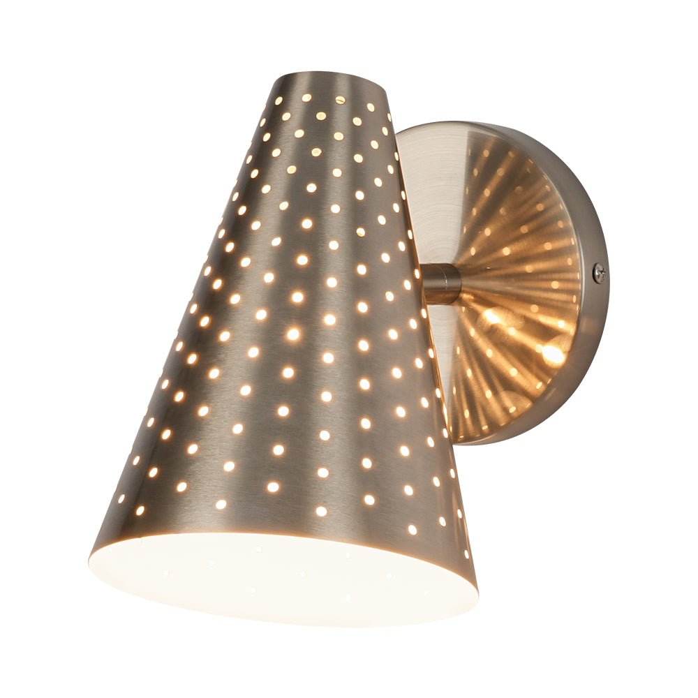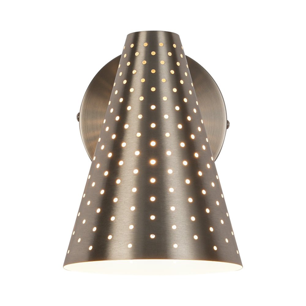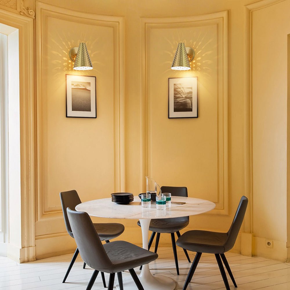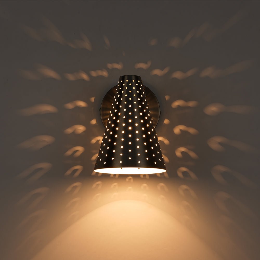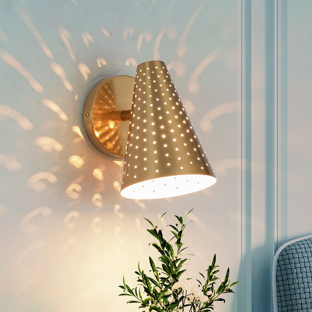 Add a modern touch and ambient glow to your space with this cone-shaped wall sconce. Featuring a clean, tapered silhouette, this 1-light wall lamp brings contemporary charm with a subtle retro twist. Its sleek metal shade is meticulously perforated with pinhole detailing that creates a mesmerizing starburst lighting effect on the wall when illuminated.