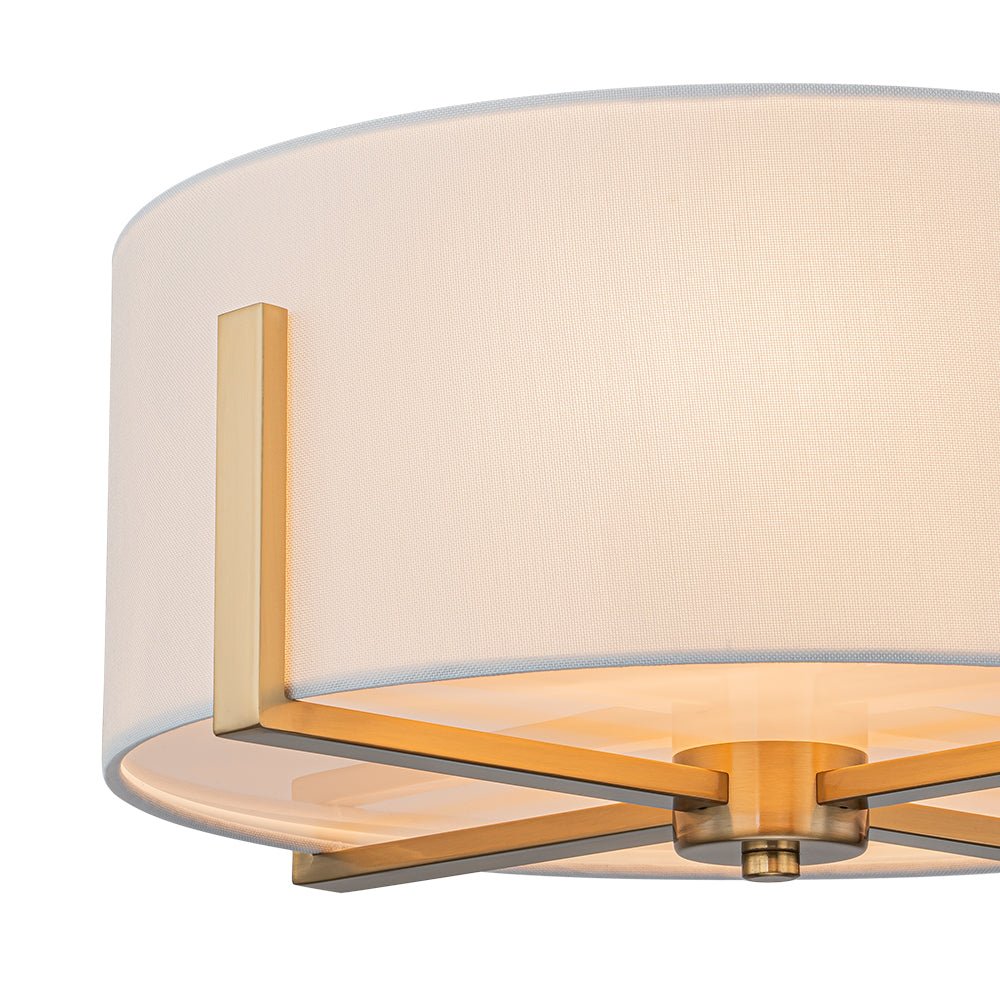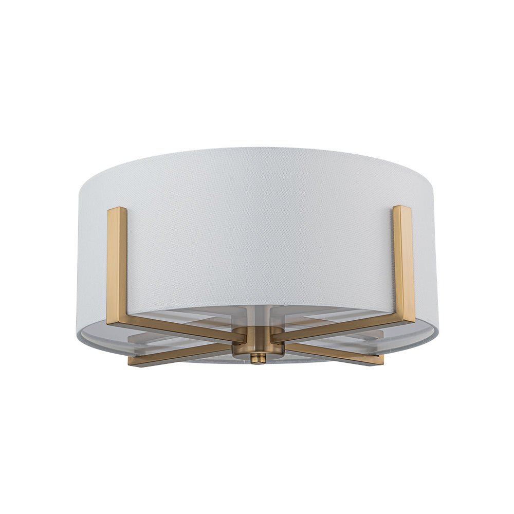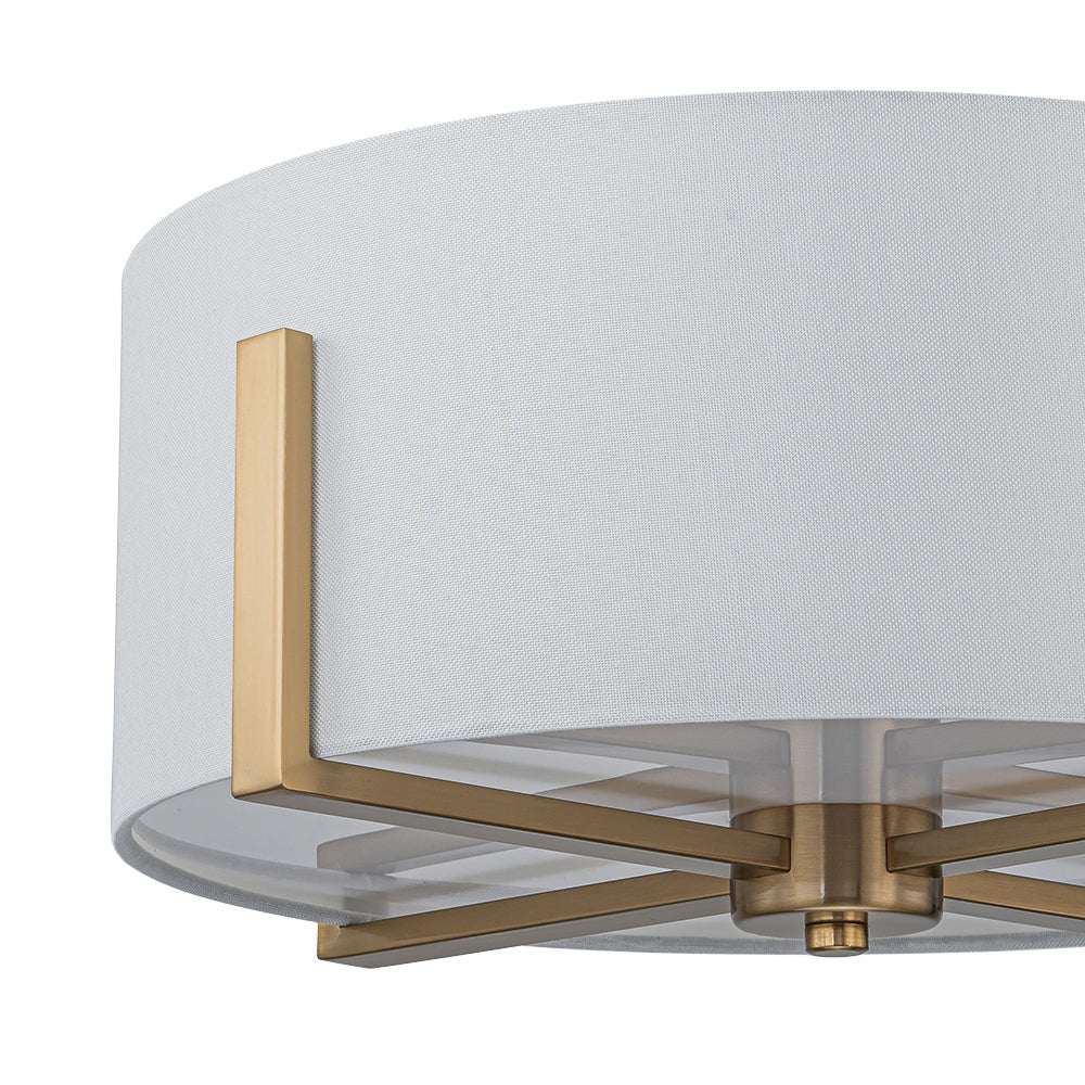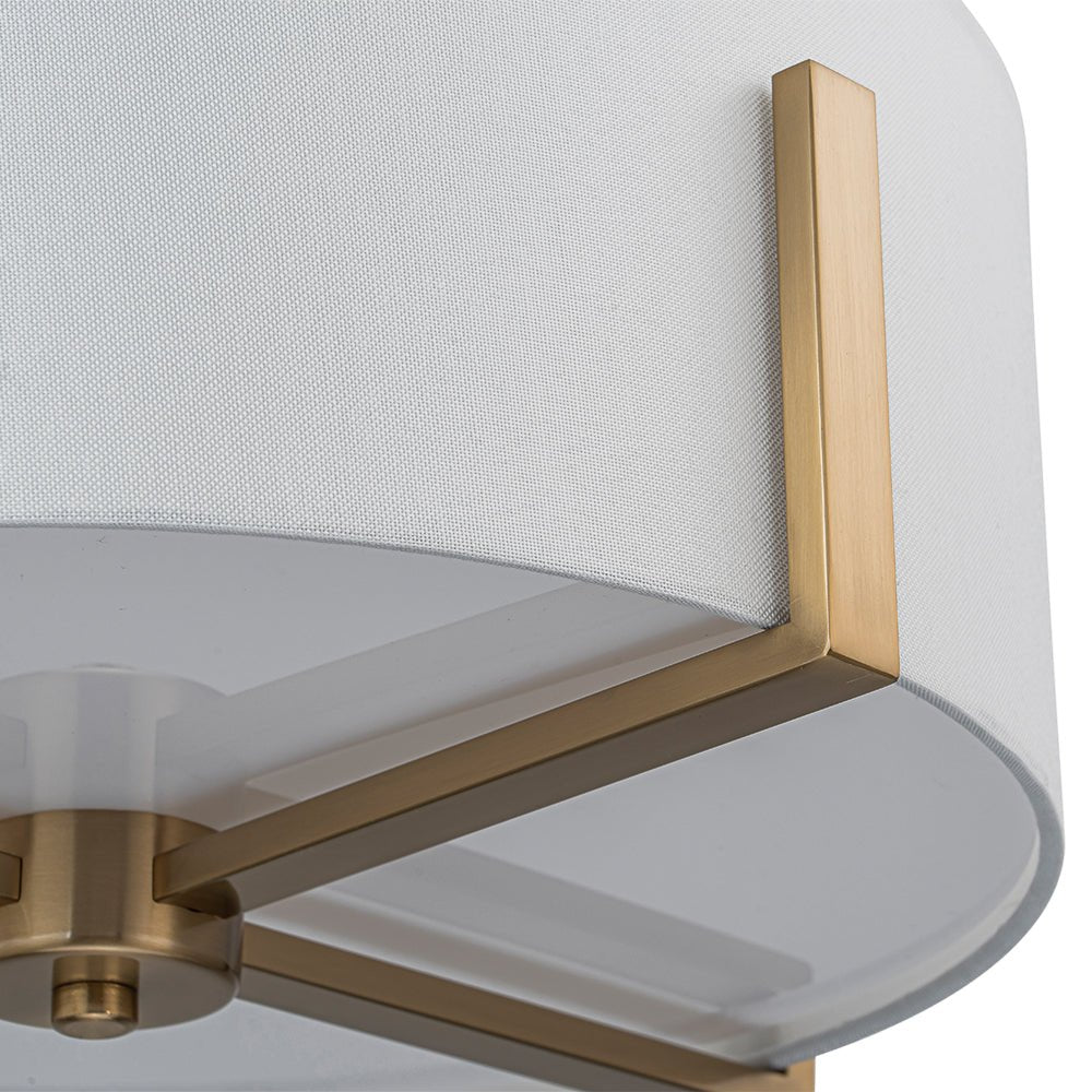 Two Lights ⢠Wide Drum Design ⢠White Fabric Shade ⢠Intersecting Frame ⢠Acrylic Diffuser ⢠Brushed Brass/Matte Black ⢠E26 Medium Bulbs (Not Included) ā¢Ā Hardwired ⢠UL Listed/ETL