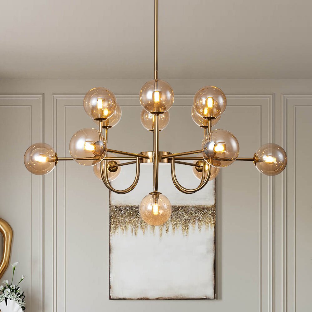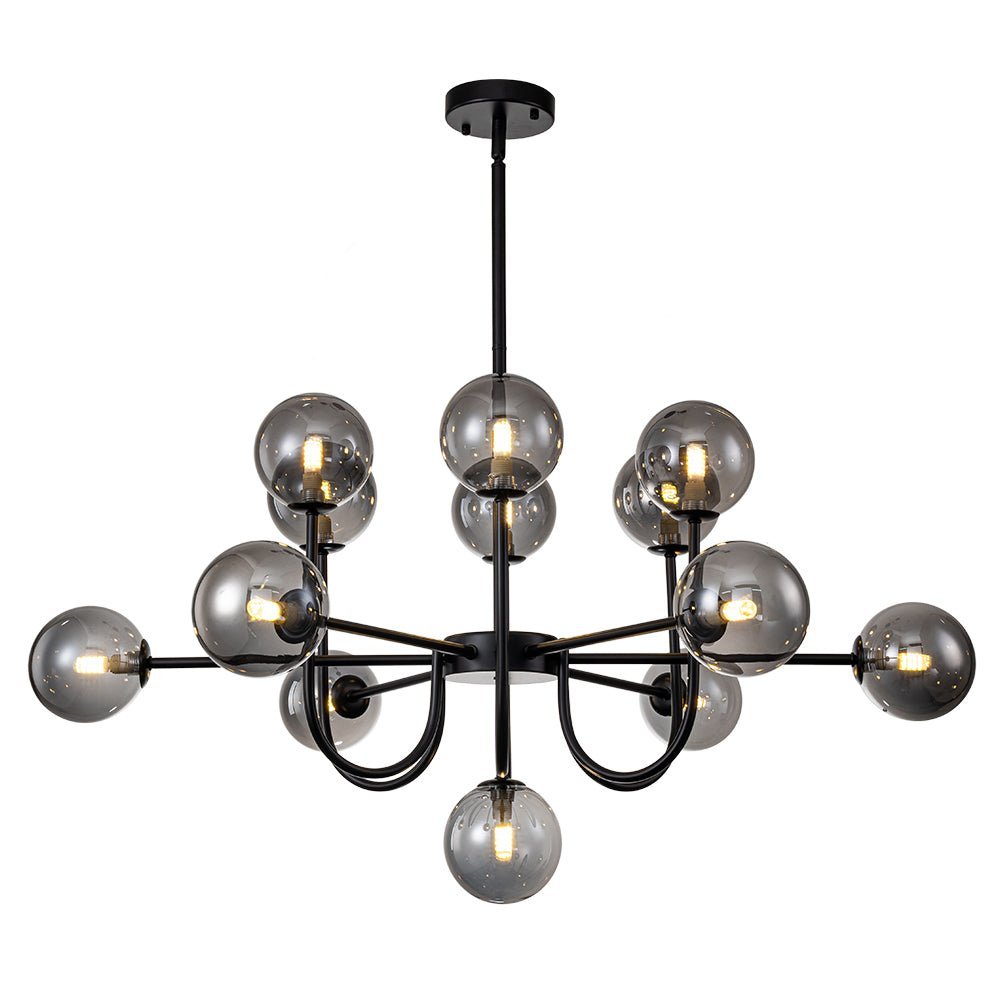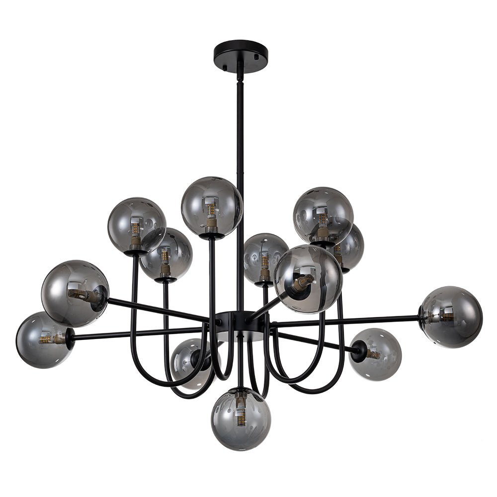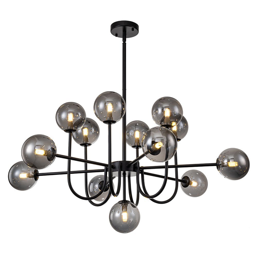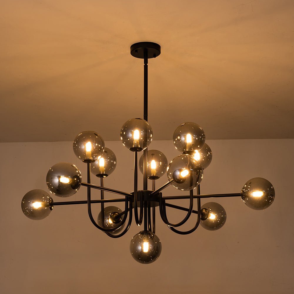 Discover bold innovation with this stunning sputnik light fixture, an investment that will truly make your space stand out! Featuring a striking composition of bursting straight arms and scrolling arms, this 13-light bubble chandelier boasts an intriguingly staggered yet symmetrical aesthetic. The matte black finish paired with smoked glass bubbles exudes upscale luxury, while the rich brass option offers a warm ambiance and glorious touch, enhanced by the presence of amber glass spheres. Whether placed over a kitchen island, dining table, living space, entry, or foyer, this sputnik glass globe bubble chandelier will undoubtedly create an exquisite and eye-catching centerpiece.