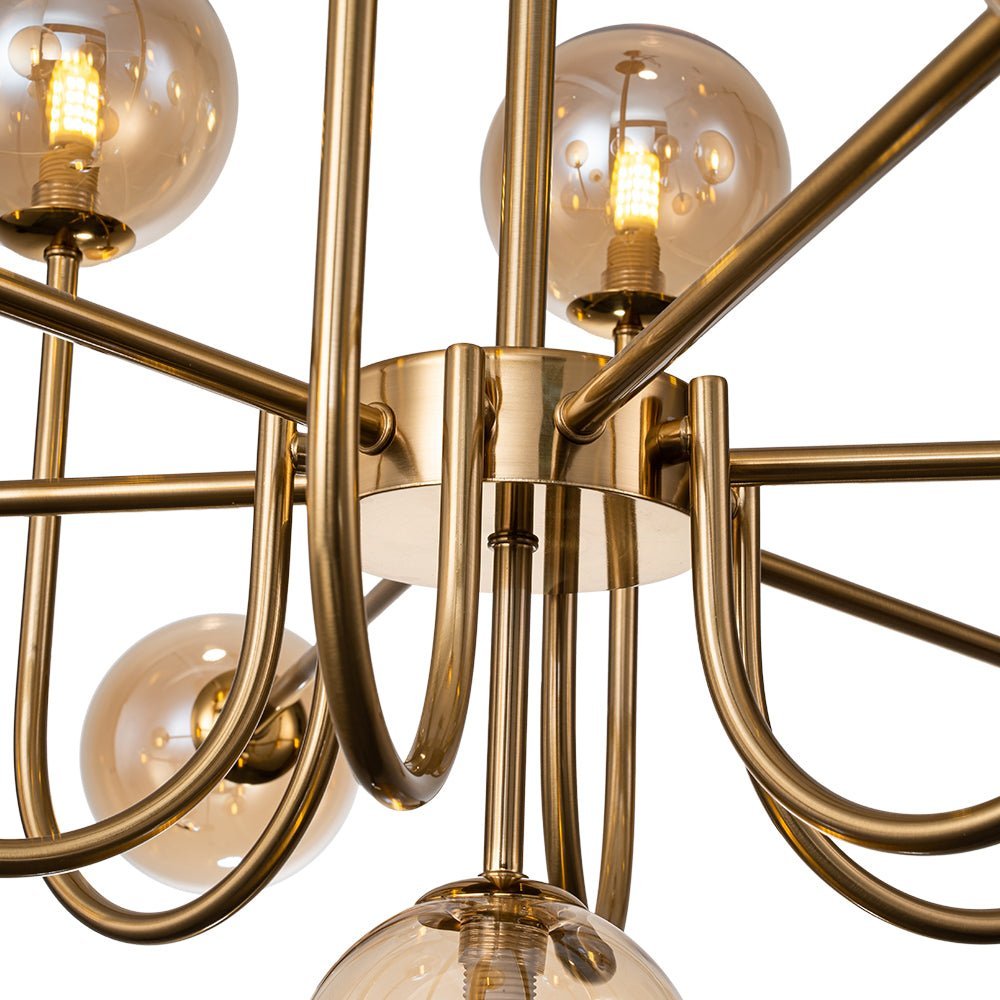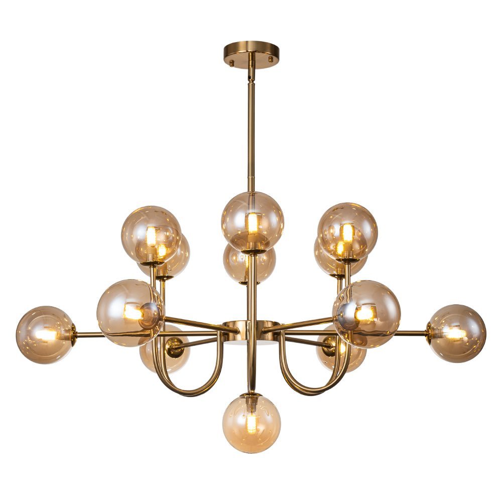 Thirteen Lights • Amber/Smoked Glass • Globe Shades • Sputnik Style • Brass/Black Finish • G9 Bulbs (Not Included) • Hardwired • UL Listed