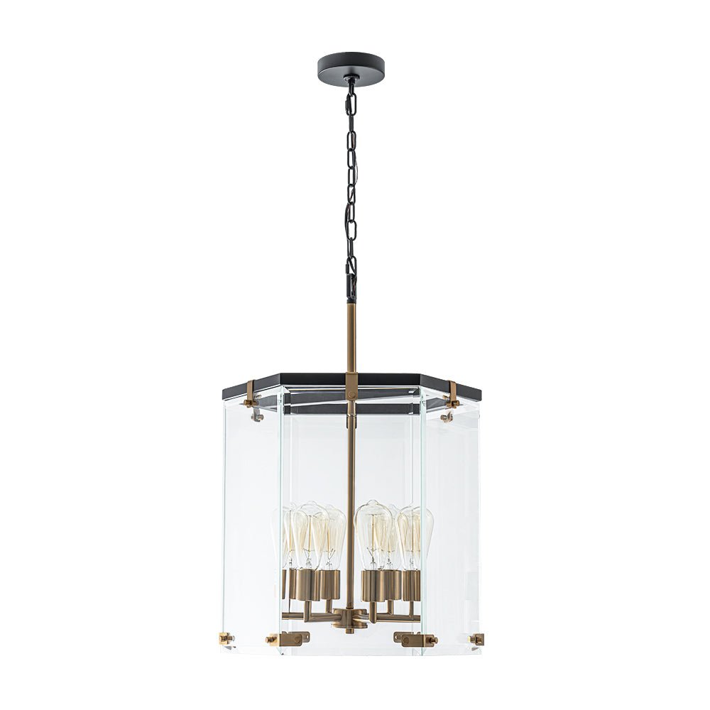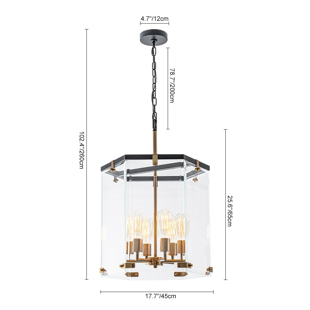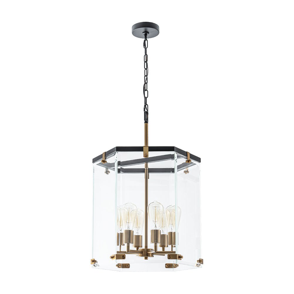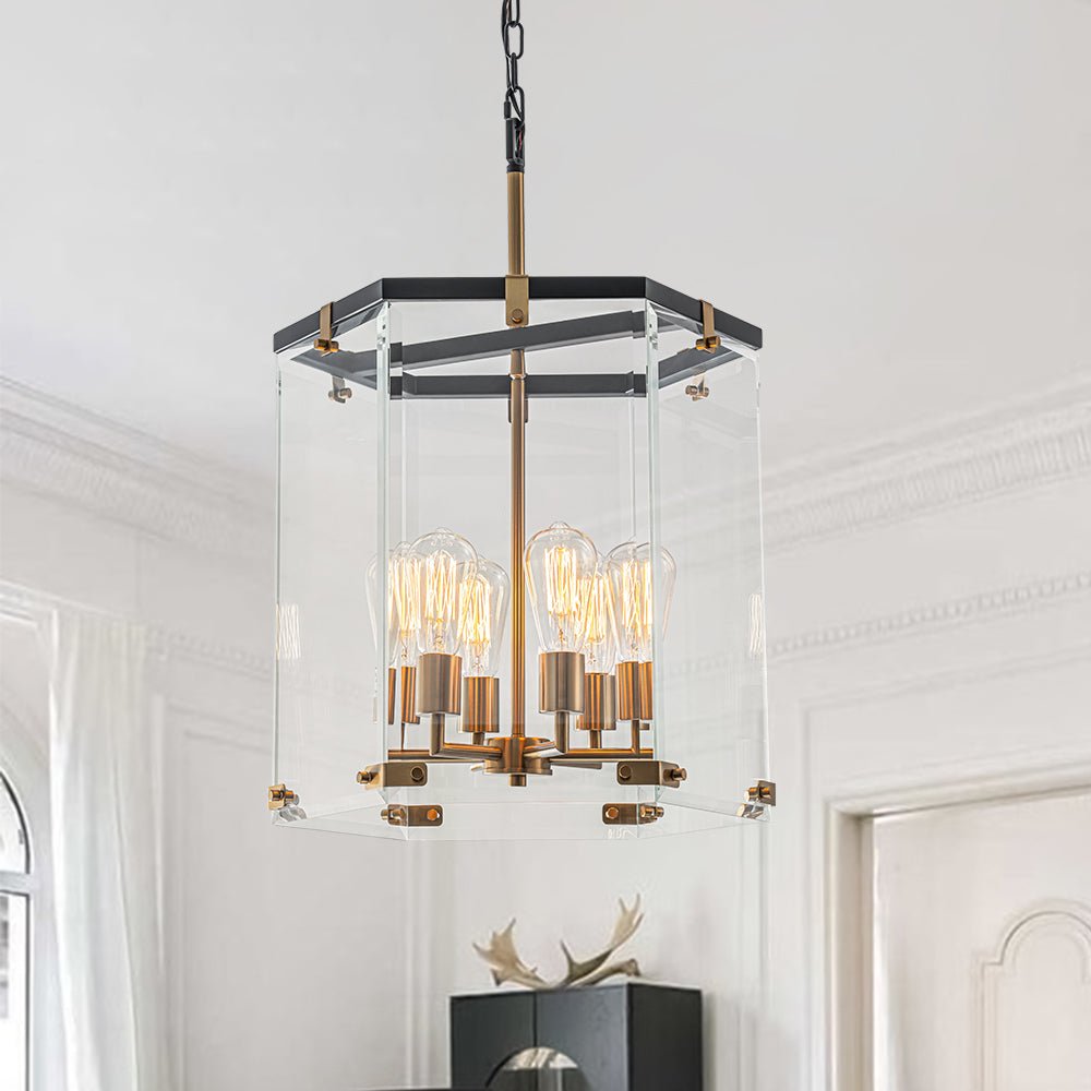 Elevate your entryway, dining room, kitchen island, living room, bedroom, or bathroom with our 6-light lantern pendant light. Embodying high-end simplicity and contemporary sophistication, this sleek lantern chandelier boasts a large hexagon cage made of six wide, clear glass panels. Inside, a 6-light candle-style socket designed for E26 medium-base bulbs (not included) provides effective task lighting when illuminated. The combination of matte black and aged brass finishes adds a touch of vibrant manor flair, infusing modern farmhouse charm.