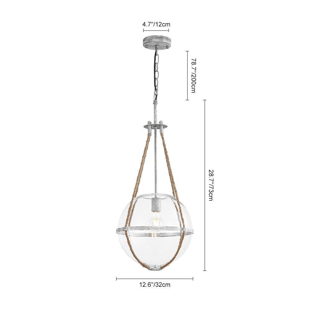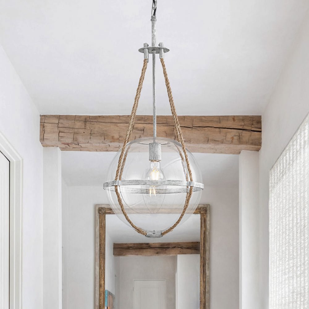 Elevate your space with this 1-light globe pendant light, where vintage coastal style meets cottage elegance. A clear glass globe takes center stage, beautifully complemented by distressed white details that adds a touch of weathered charm. Two natural brown hemp rope supports lend an organic, nautical feel, enhancing the fixture’s character with a relaxed yet refined look. Perfect for kitchens, dining areas, bedrooms, bathrooms, foyers, or entryways, this single rustic globe hanging pendant casts a warm, inviting glow while serving as a striking statement piece in both contemporary or traditional interior.