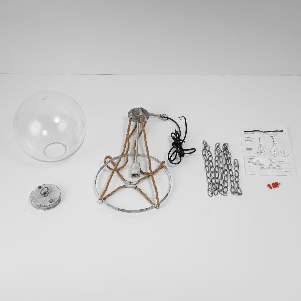 One Light • Glass Globe • Hemp Rope Details • Rusty White Finish • E26 Medium-Base Bulbs (Not Included) • Hardwired • ETL