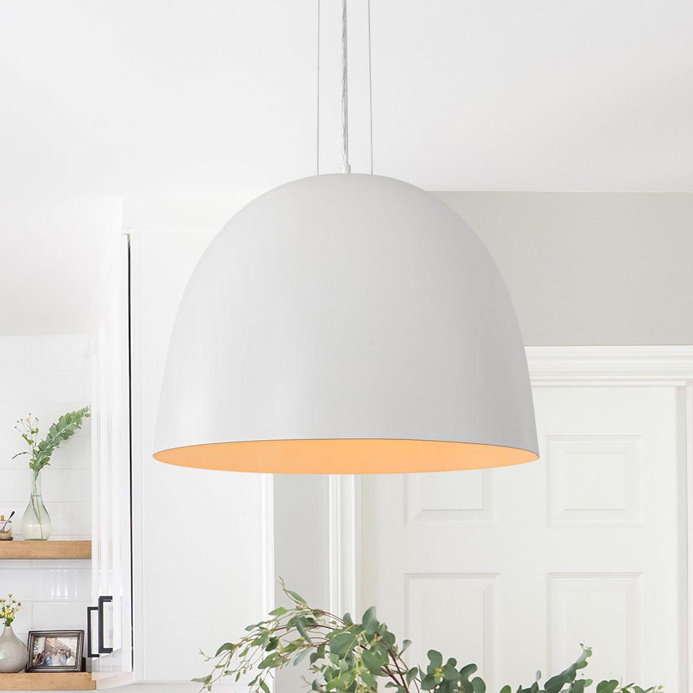 Experience the pinnacle of refined sophistication and minimalist style with this metal dome pendant light. Combining modern farmhouse charm with Nordic elegance, its oversized yet understated design features a grand bell-shaped dome in a sleek matte white finish. Perfect for kitchens and dining areas, arranging multiple pendants creates a stylish, inviting ambiance that makes a bold yet welcoming statement.