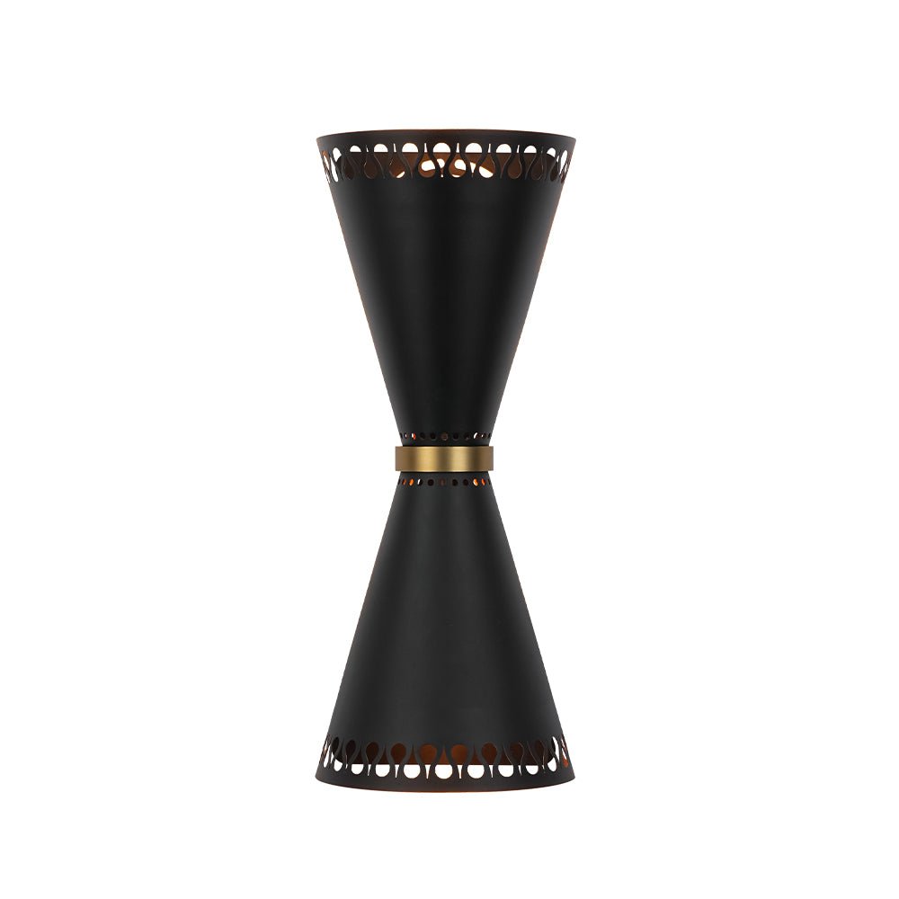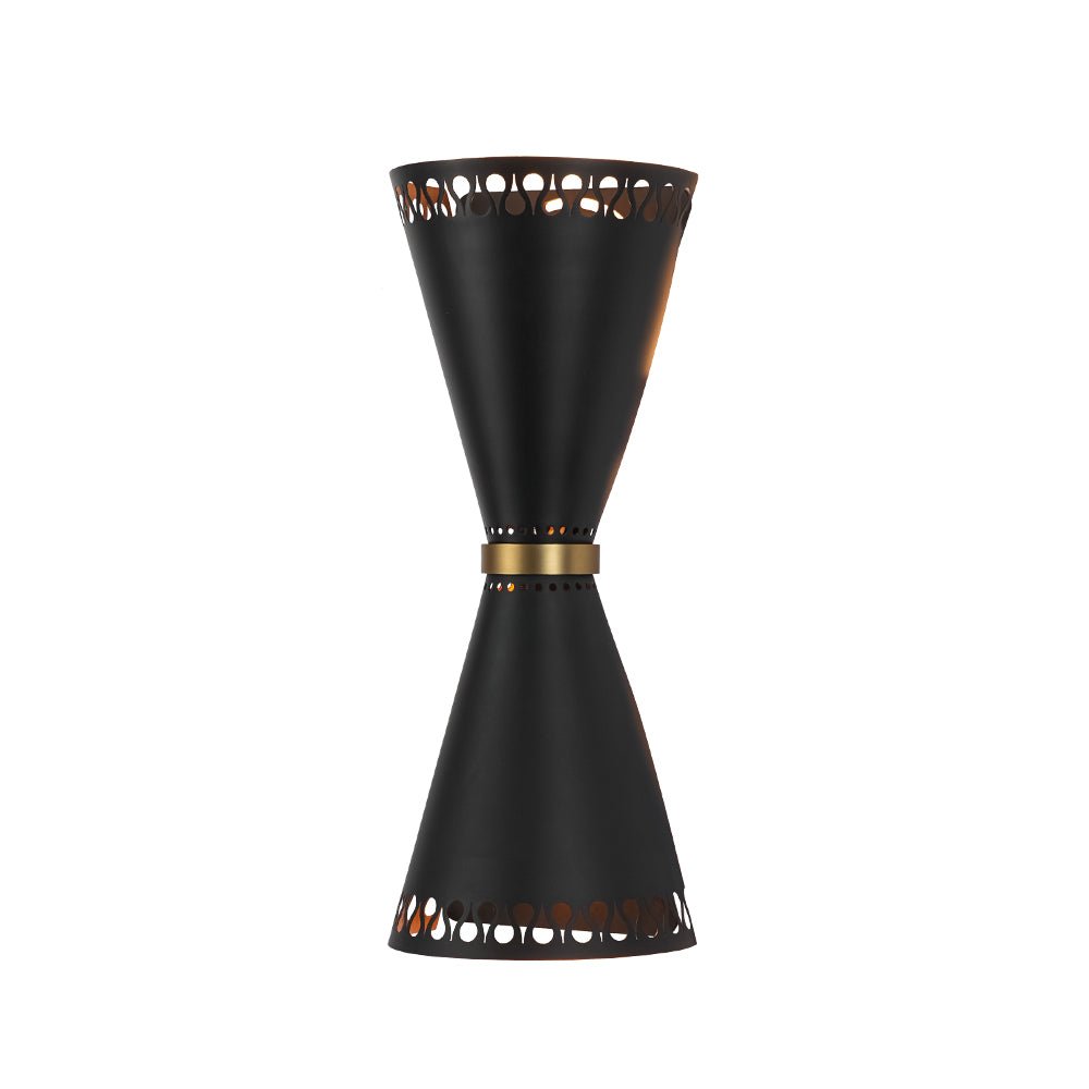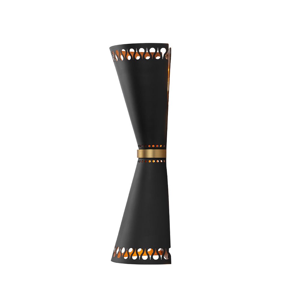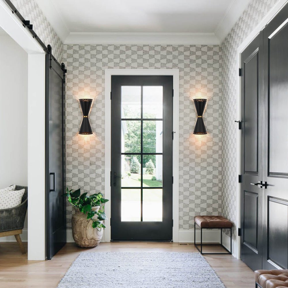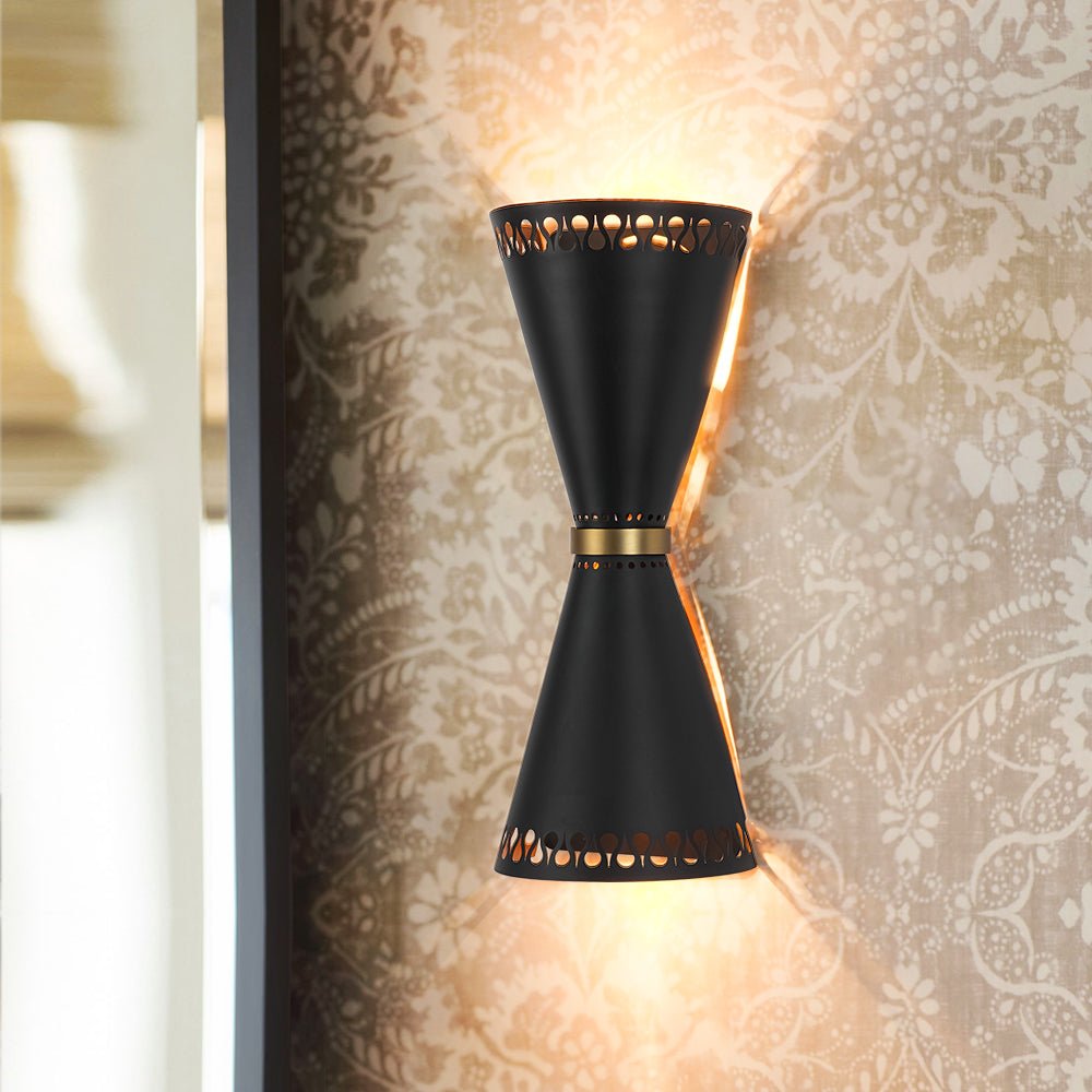 Add a bold yet elegant statement to your interior with this mid-century modern 2-light flush mount wall sconce. Featuring a sleek matte black exterior and a flared hourglass silhouette, this fixture exudes retro sophistication. The interior is painted in a warm gold tone, enhancing the ambient glow and casting soft, inviting light both upward and downward. Decorative flame-like cutouts along the top and bottom edges create striking light patterns on the wall, blending function with artistic flair. Perfect for bedrooms, hallways, living rooms, or reading nooks, this wall sconce fits seamlessly into modern, retro, or eclectic spaces. Whether used alone or in a pair, this up and down wall light brings layered lighting and timeless appeal to any room.